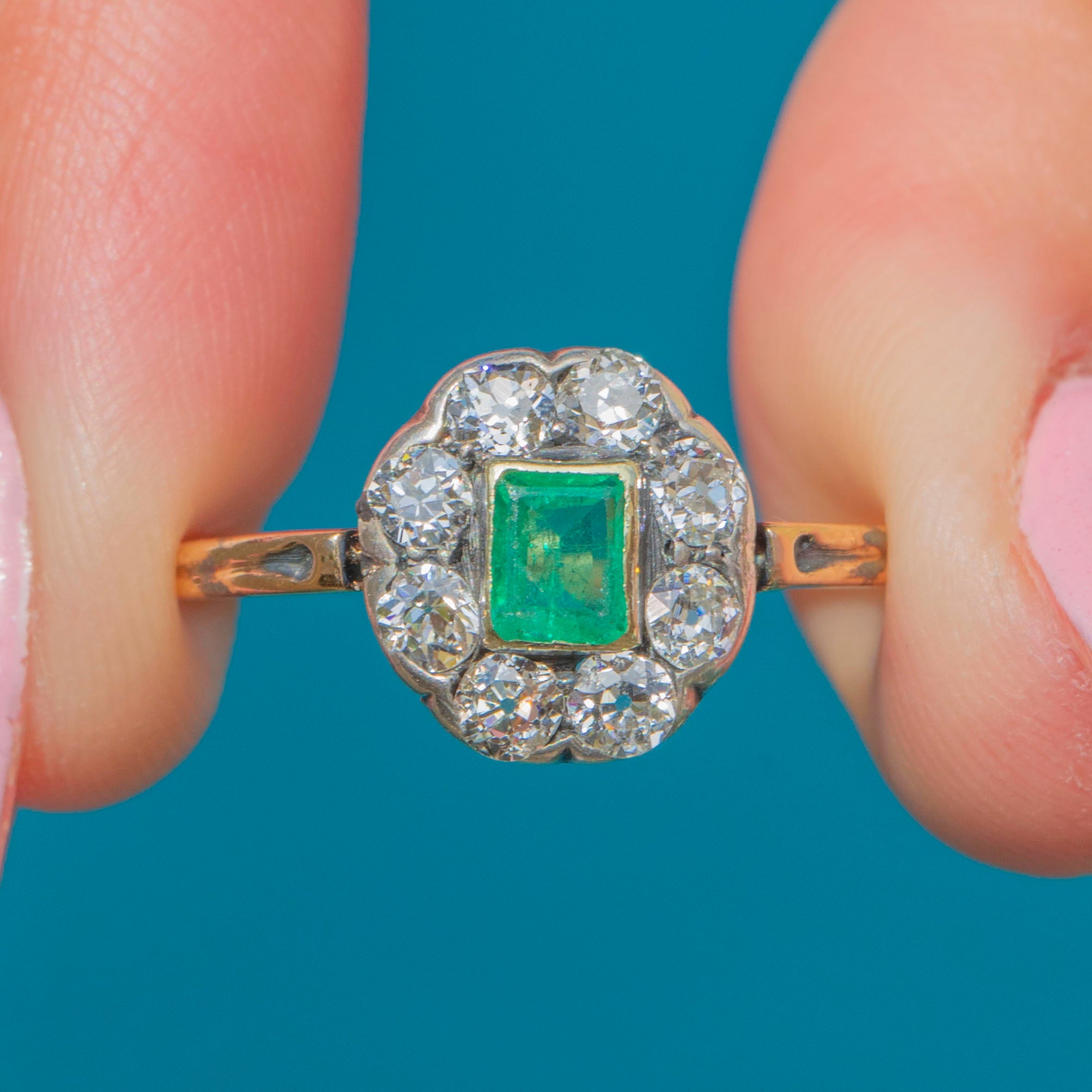 VERY GOOD: This antique 15ct Gold Emerald Diamond cluster ring is in very good condition. The gemstones are all present, with only the Emerald showing minor surface wear, commensurate with age. The Emerald is secure within its 15ct Gold bezel, and the Diamonds are securely set within lustrous Silver. Although the Gold shows mild age-related wear, it is still buttery, and the band has held its form well,  providing secure wear. Endlessly pleasing to look at, this Victorian ring will take pride of place in your antique jewellery collection!