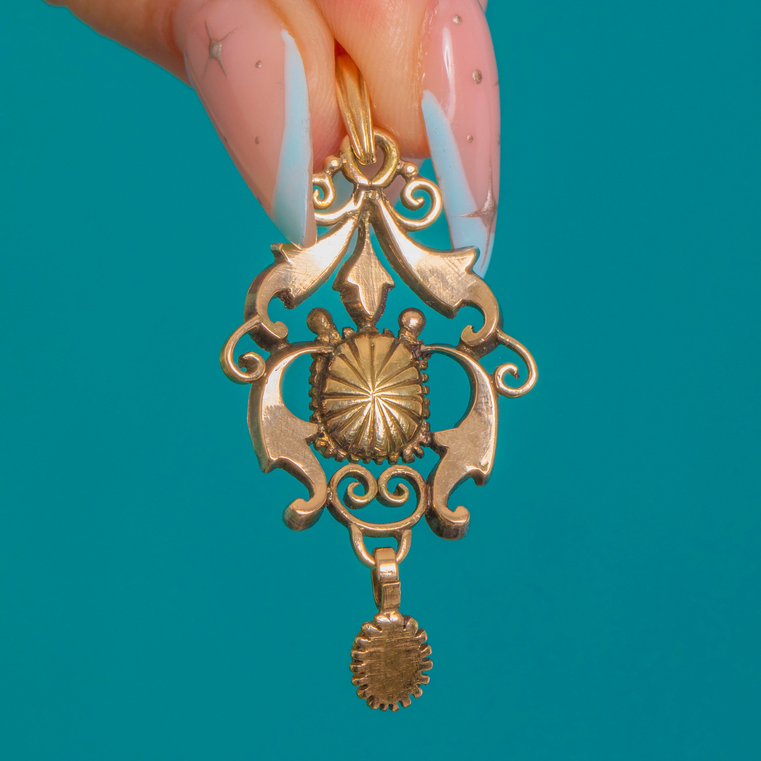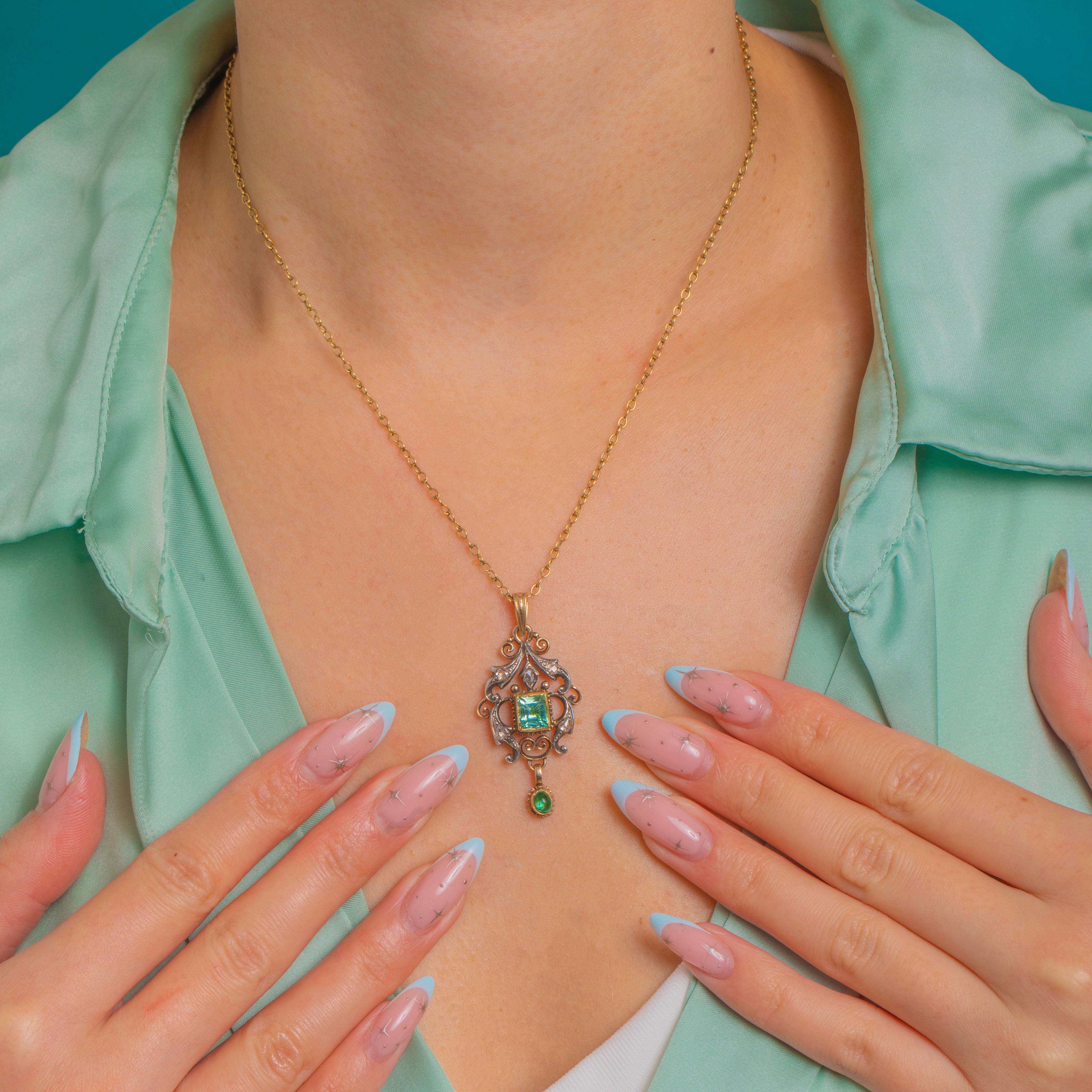 Romantic and ornate, this Victorian pendant showcases a vivid green Emerald at its heart, framed by twinkling rose-cut Diamonds within an openwork cartouche of foliate C-scrolls. The Silver-topped settings create a beautiful two-tone contrast against the warm 15ct Gold back and bail, with delicate beaded detailing and softly aged patina enhancing its antique allure.