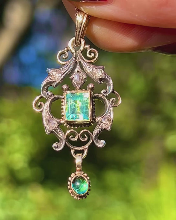 Antique 15ct Gold Emerald Rose-Cut Diamond Drop Pendant, c.1890