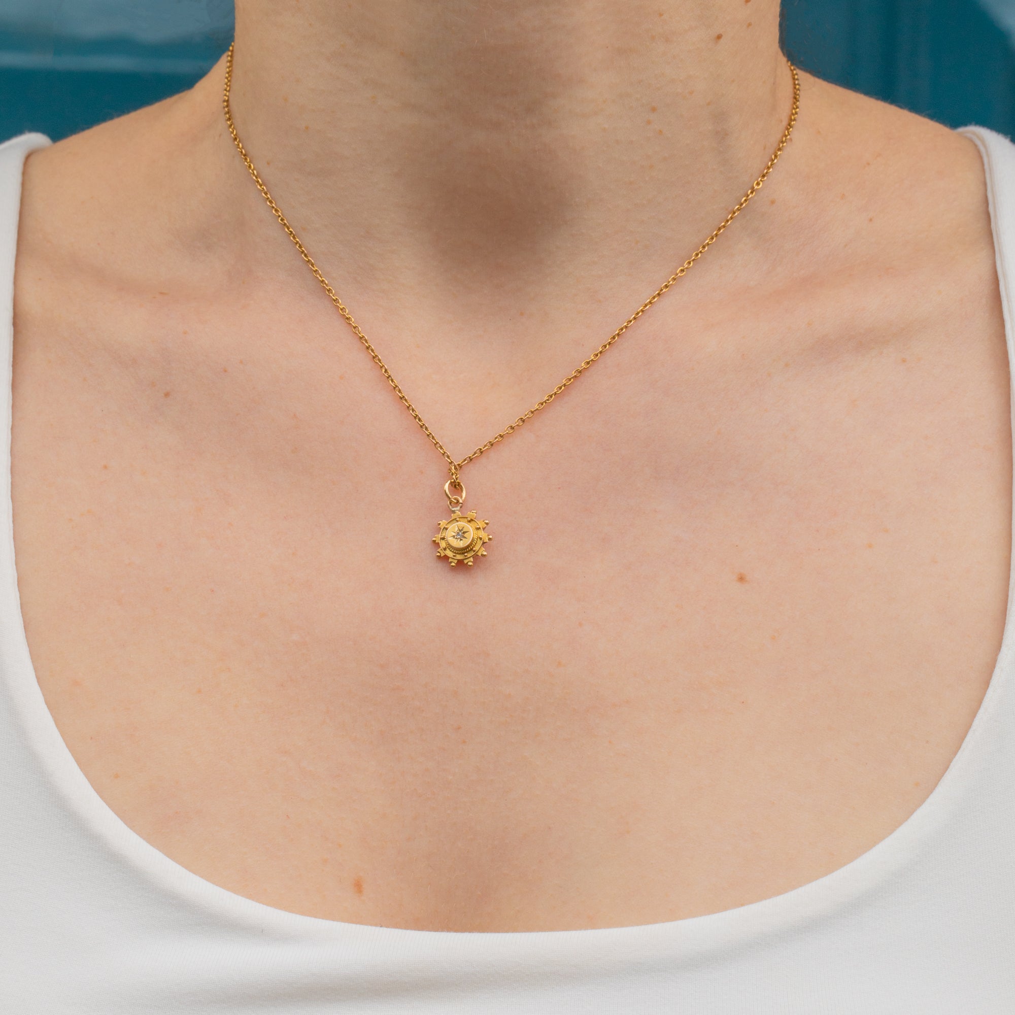 This antique 15ct Gold Etruscan round Diamond charm will throw some undeniable antique character into your repertoire! Fine rope borders, beaded detailing and star settings are what make this antique charm the epitome of Etruscan revival, crafted entirely from buttery 15ct Gold.