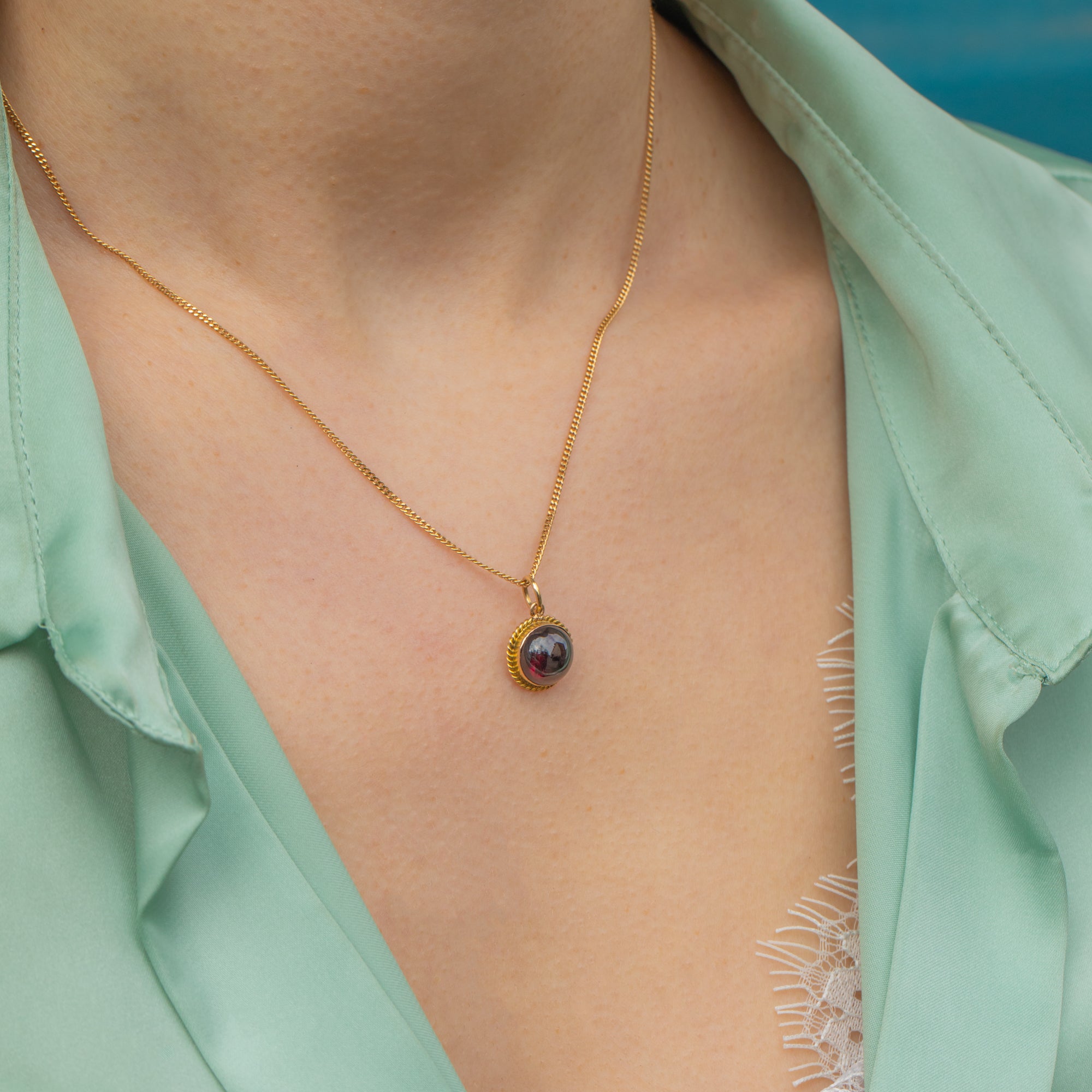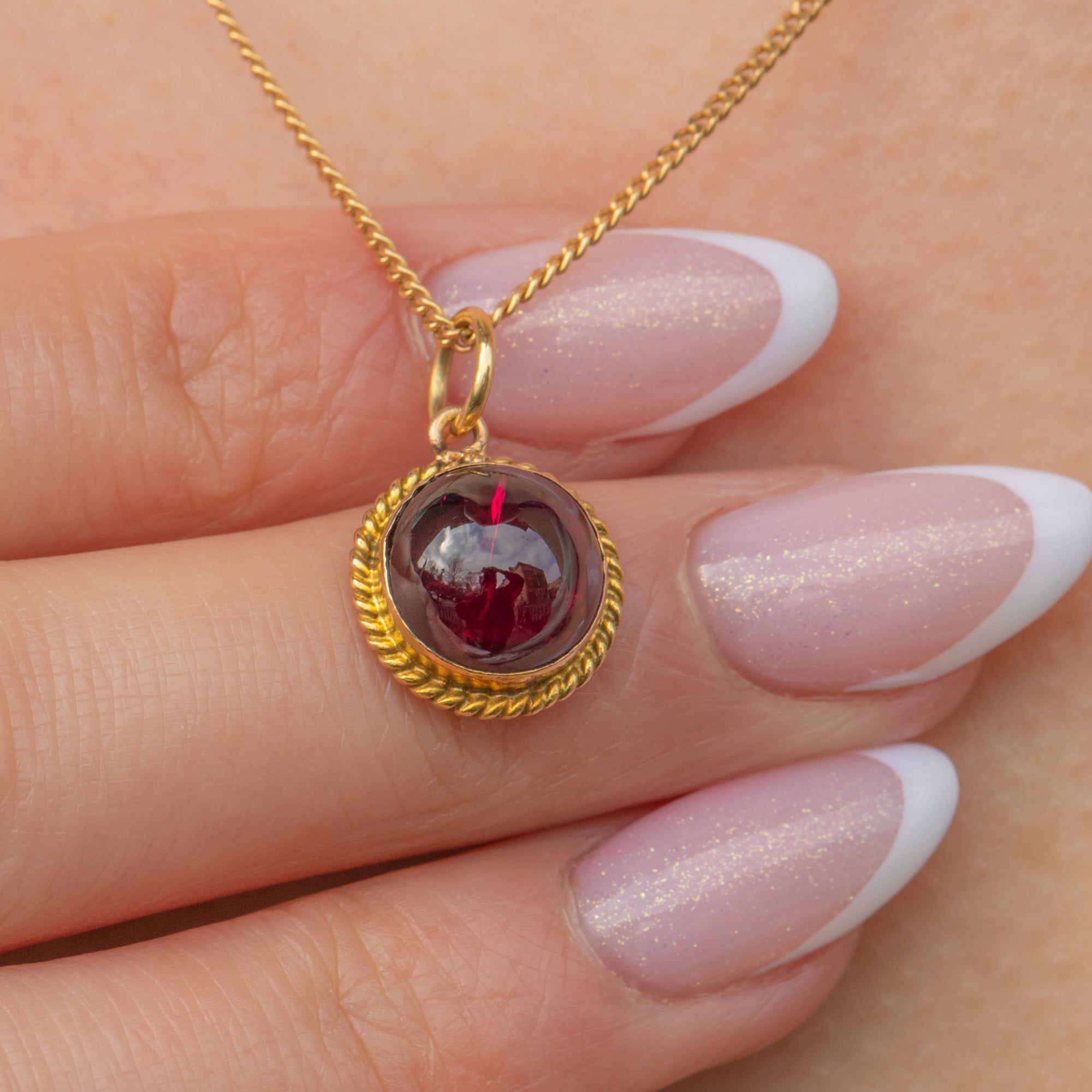 VERY GOOD: This antique 15ct Gold Garnet cabochon charm is in very good condition. The cabochon-cut Garnet is smooth and only has a few minor signs of surface wear. There is a small dink to one side of the piece, adding to her antique character! The twisted border is gorgeous and she comes complete with a superb jump ring for easy wear, there is some wear to the Gold setting, but rest assured she is securely set allowing for constant, secure wear. In a previous life, this antique pendant was a stick pin, and there is some small sign of this to the back, with a dip in the Gold. A striking piece of Victorian jewellery ready to be worn and adored for years to come!