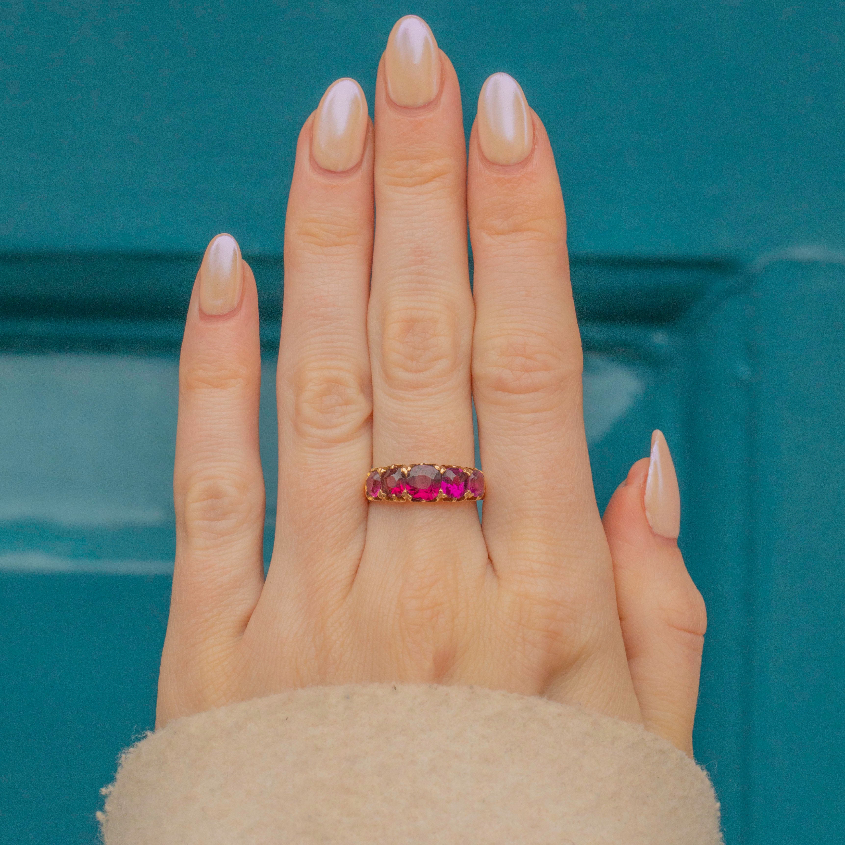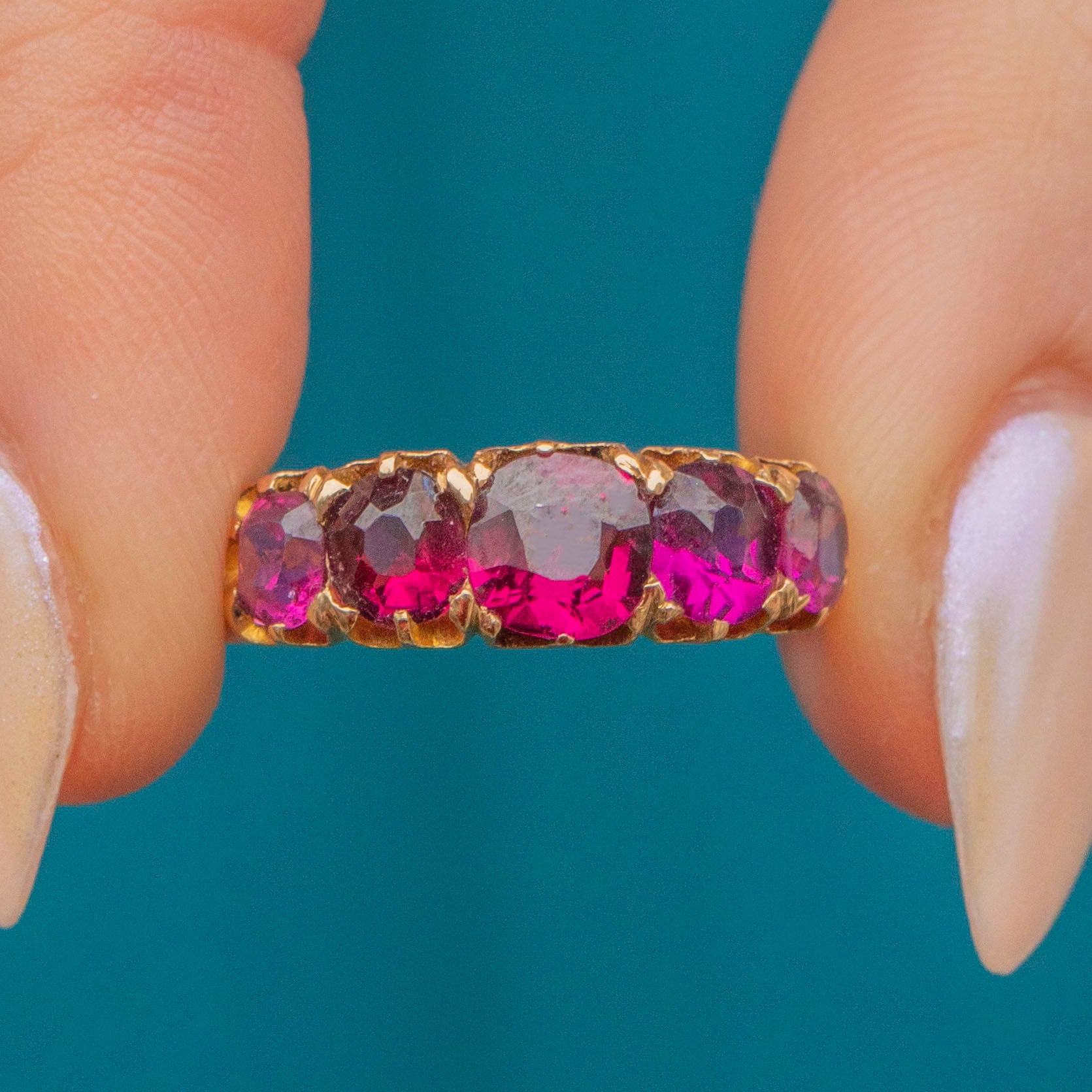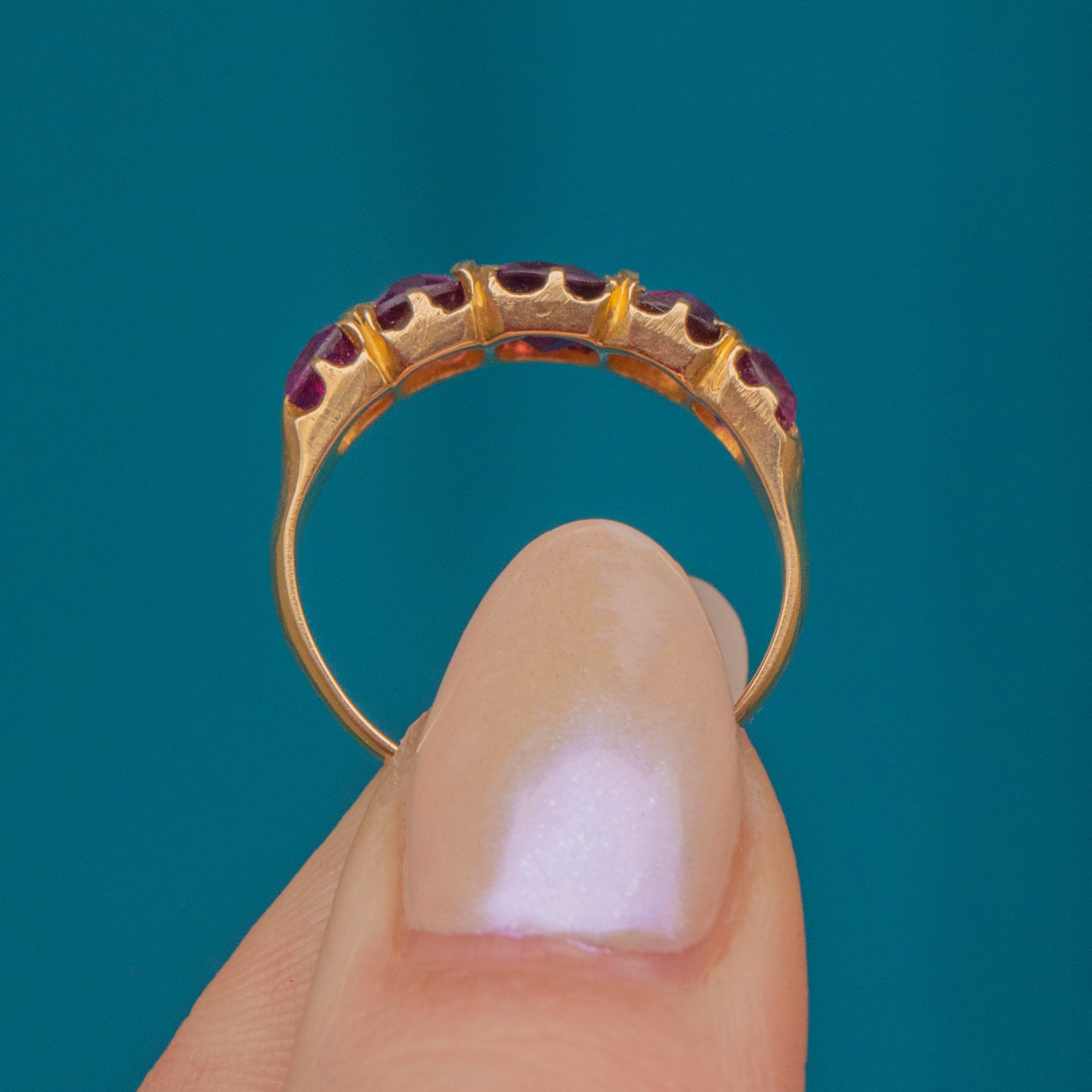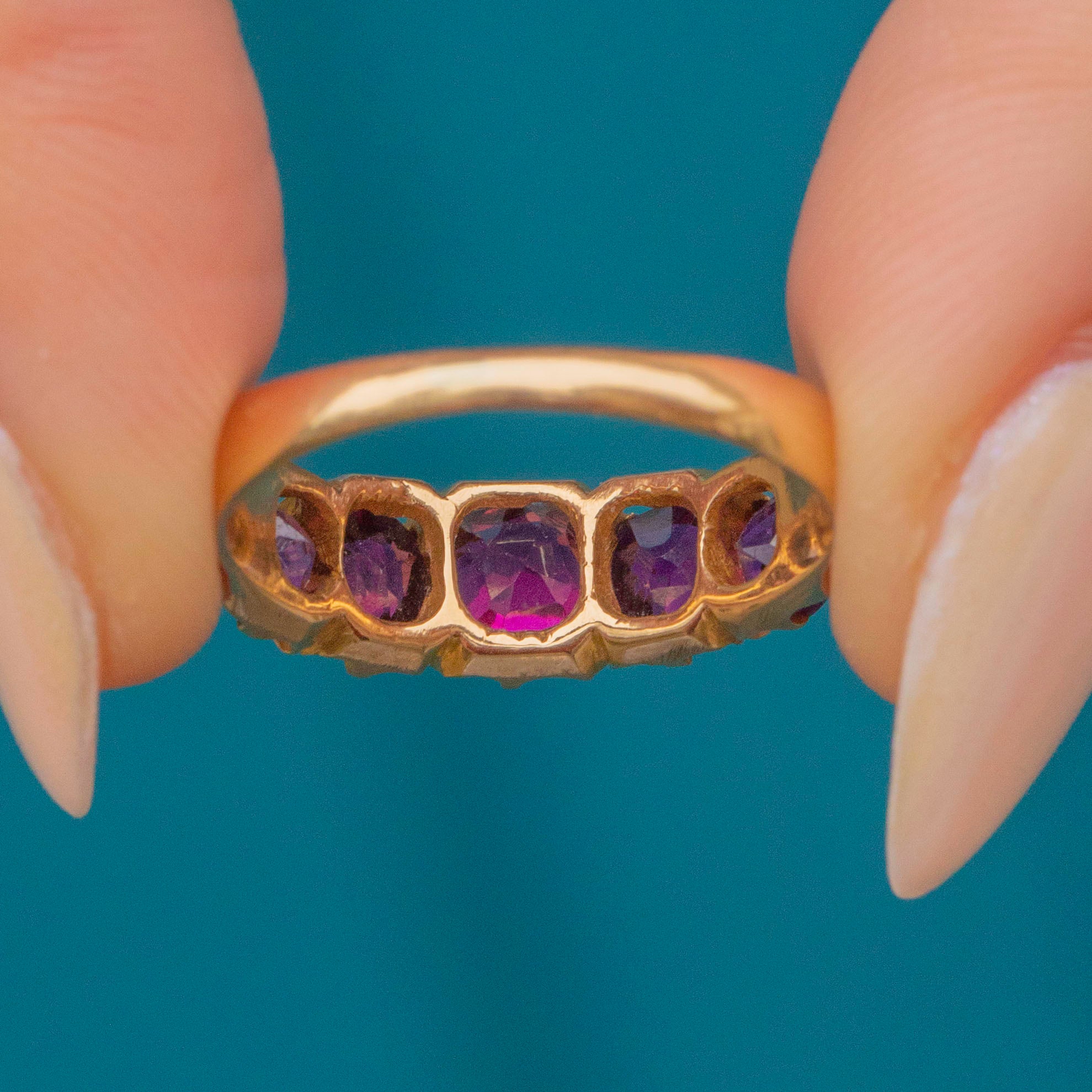 This antique 15ct Gold Garnet five stone ring is an antique collector's dream! Bursting with intricate craftsmanship, this antique ring homes five Garnets with punchy purple hues that glisten beneath the light.