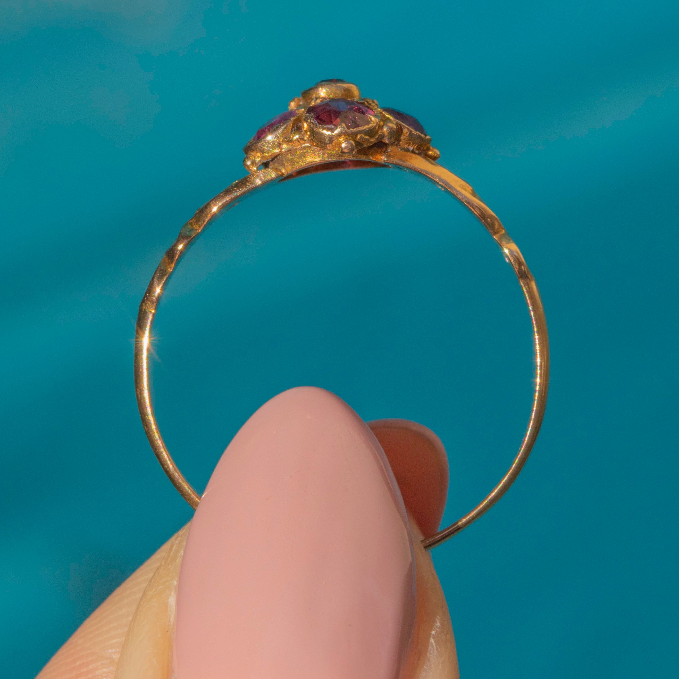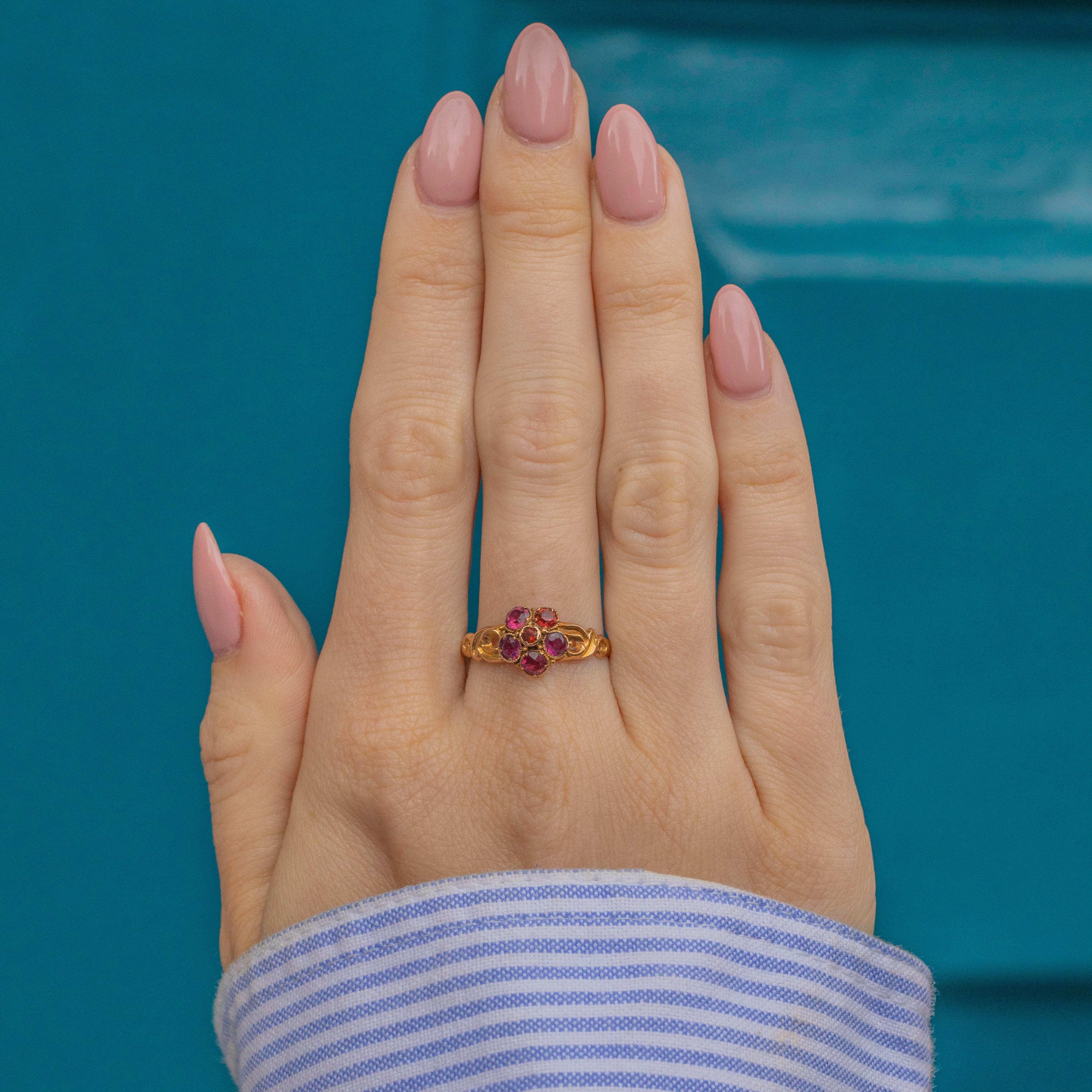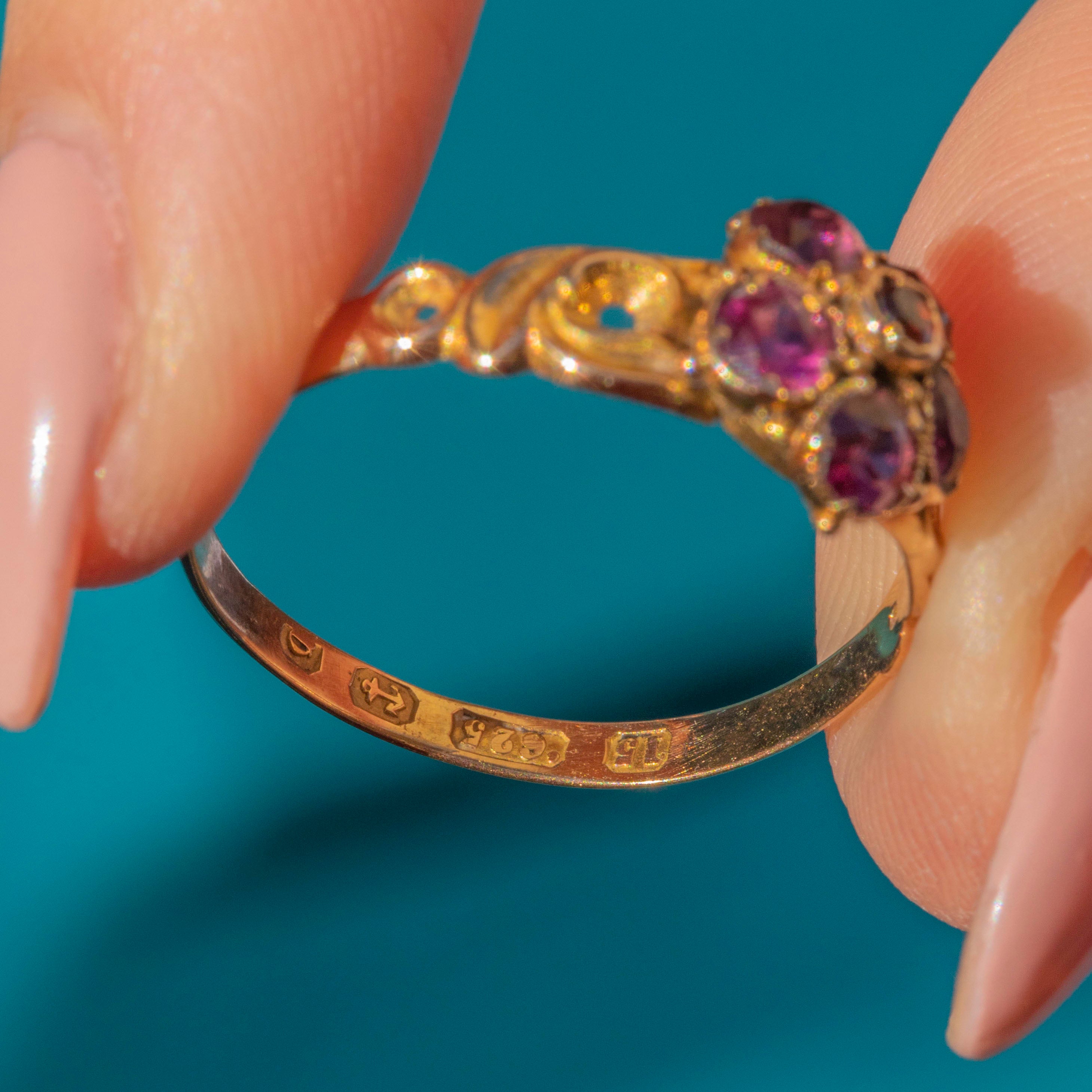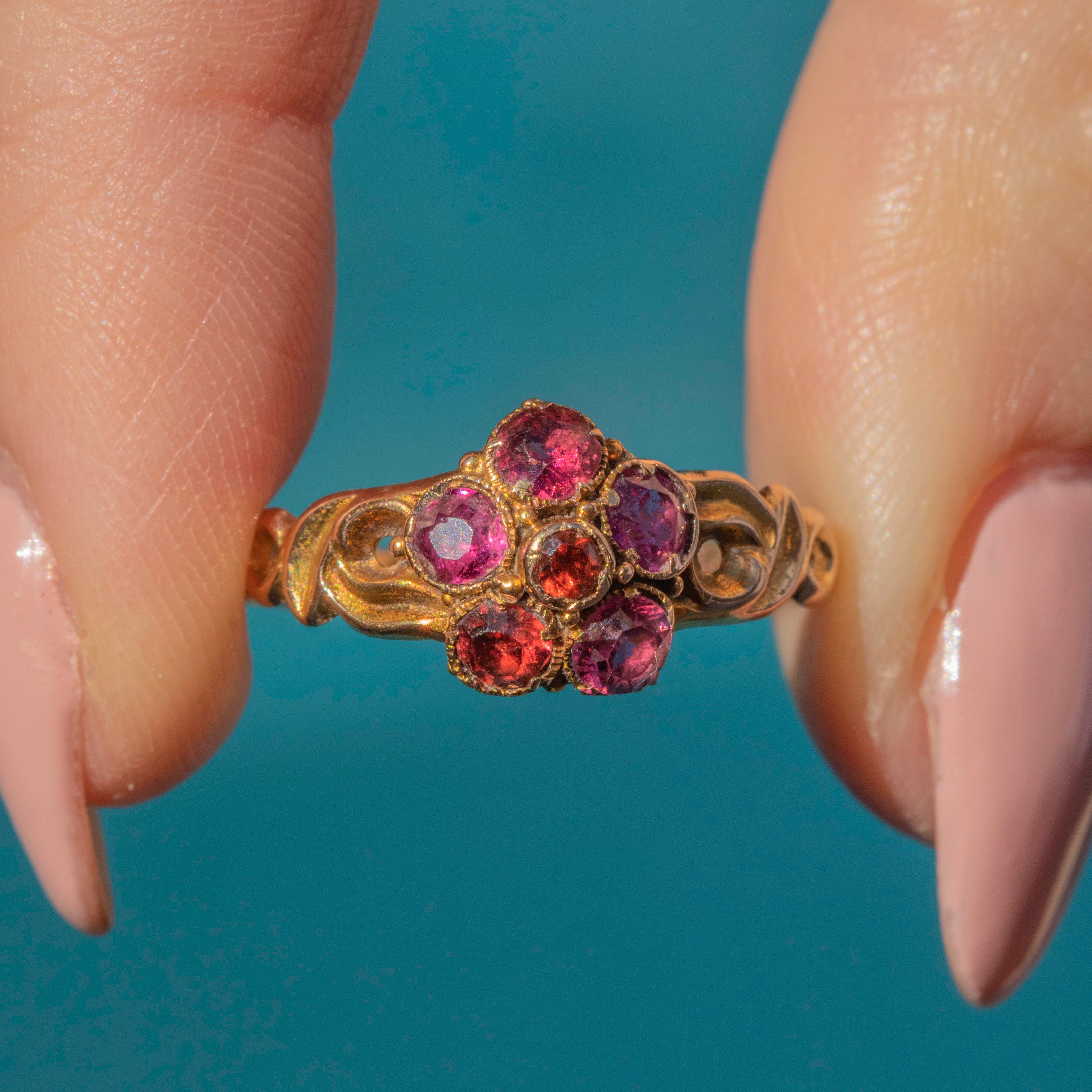 This antique 15ct Gold Garnet pansy ring is bursting with Victorian sentiment! The six twinkling Garnets flaunt magenta hues with a soft touch of crimson, creating a feminine display of colours.