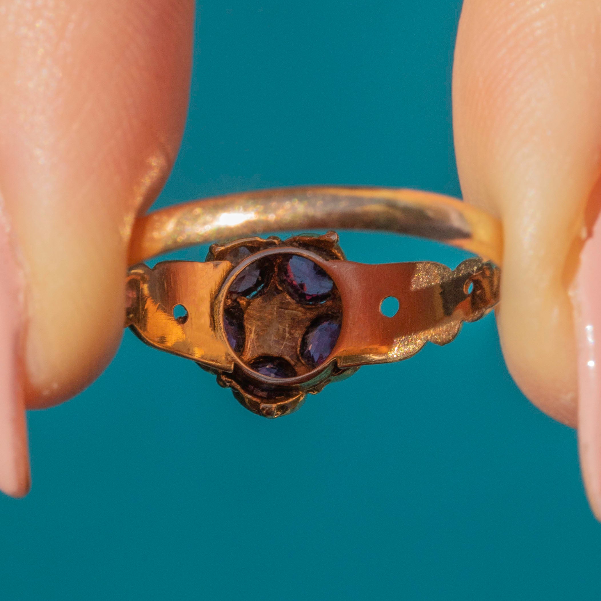 VERY GOOD. This antique 15ct Gold Garnet pansy ring is in very good condition! The Garnets sit securely within their setting and although some of them have subtle wear to the facets, but this is minimal and does not impact their saturated hue. The carved details are crisp and the 15ct Gold is highly saturated throughout. There is a resize mark on the back of the band, which has left the date letter obscured, however, this does not affect her comfort. With the correct care, this Victorian Gold ring can be enjoyed for many more years to come!