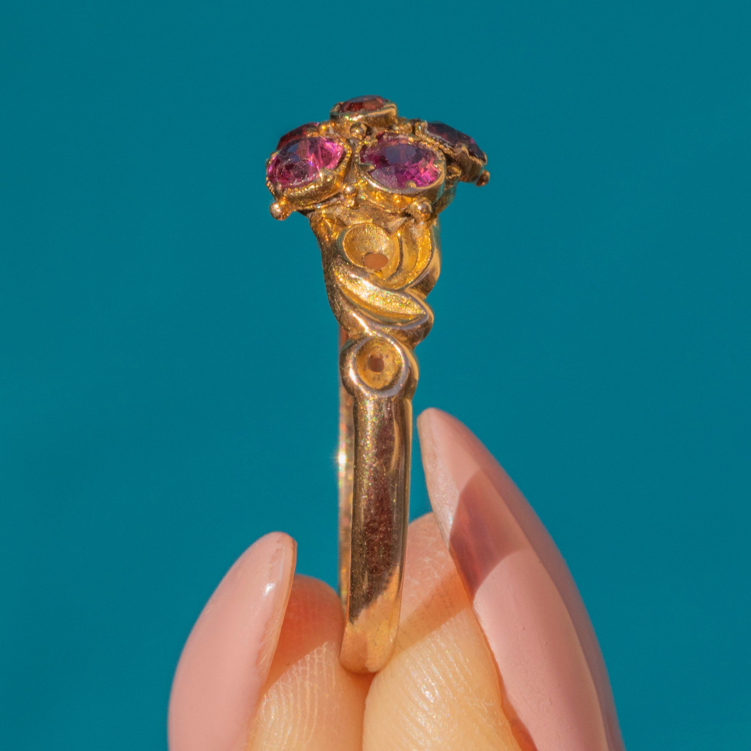 Antique 15ct Gold Garnet Pansy Ring, Carved Shoulders
