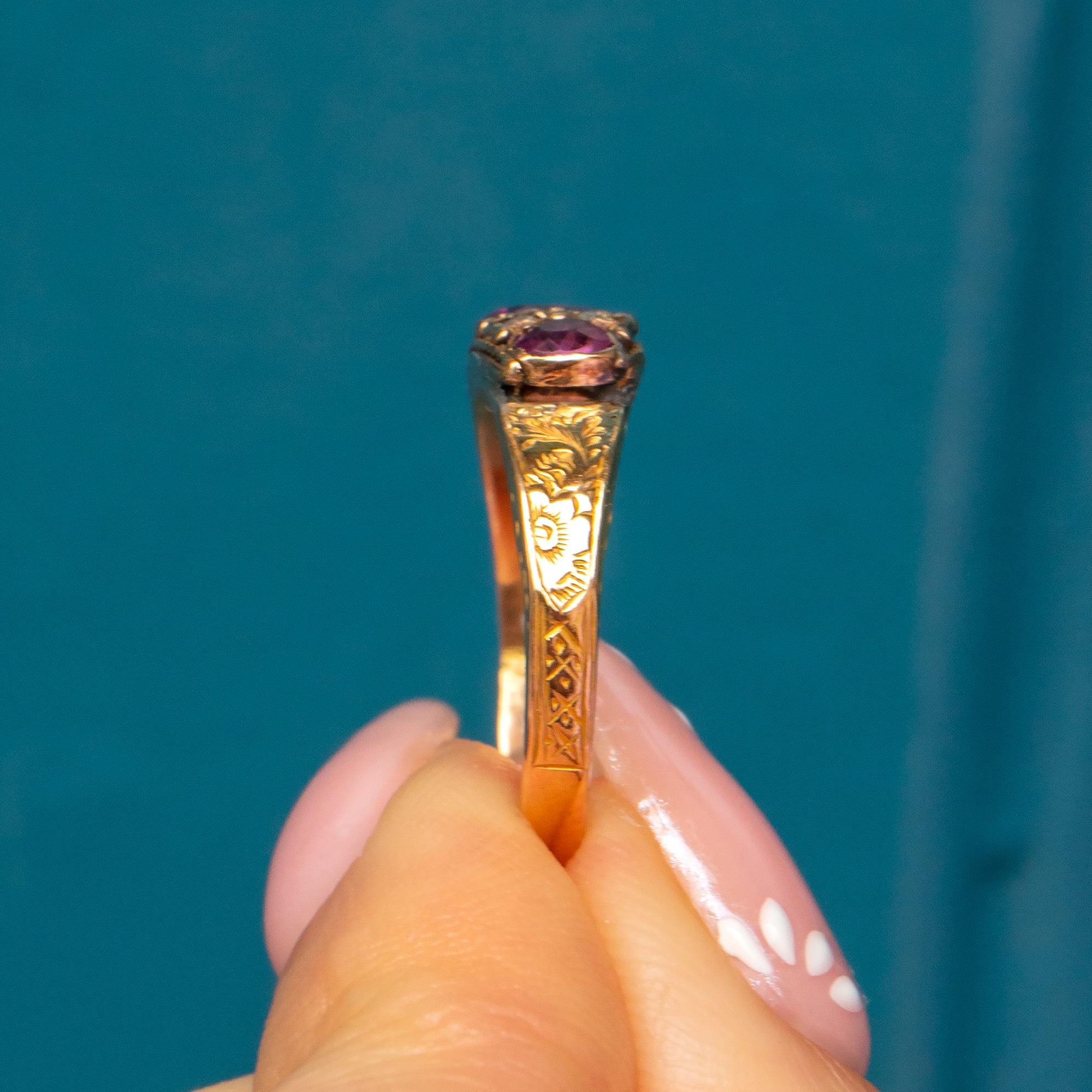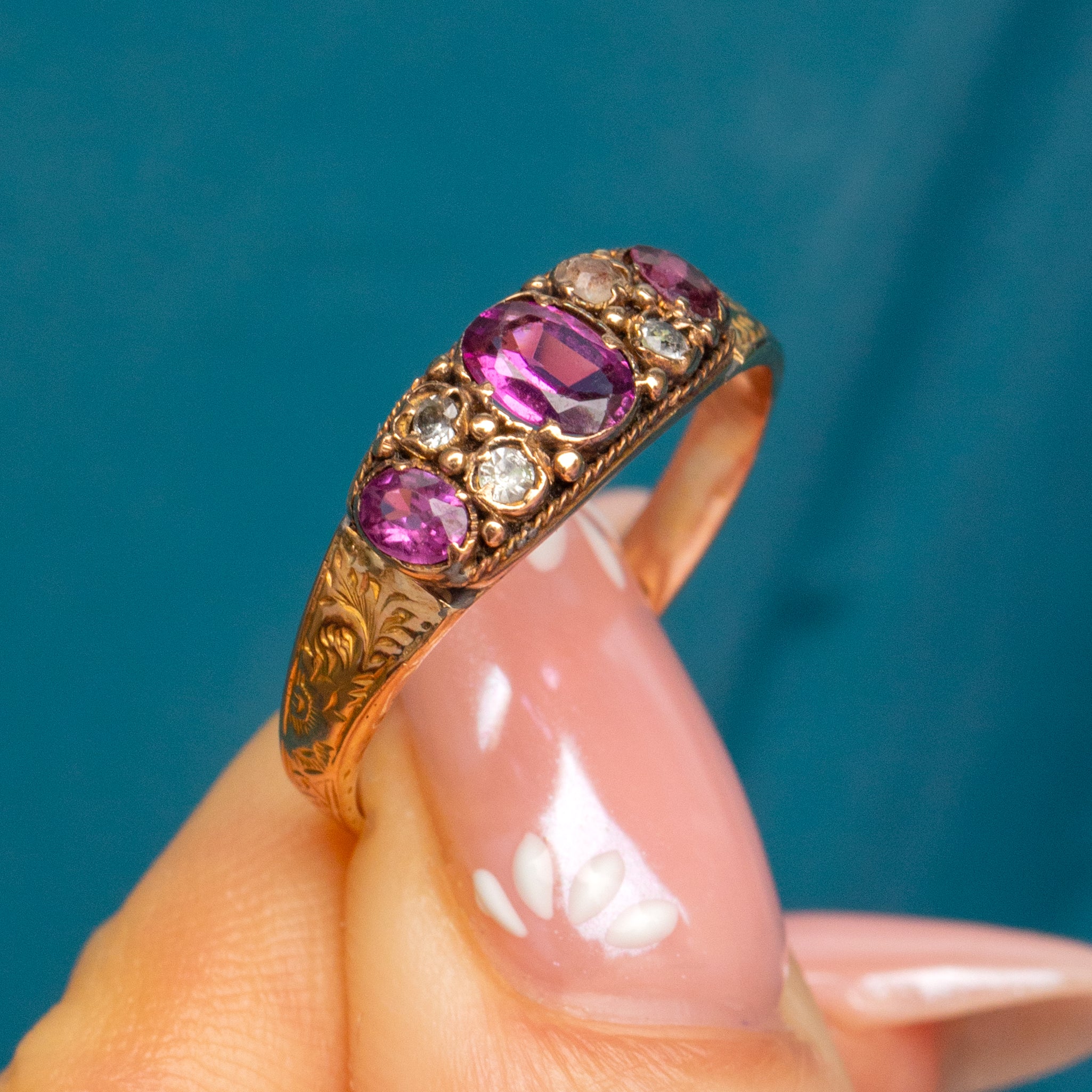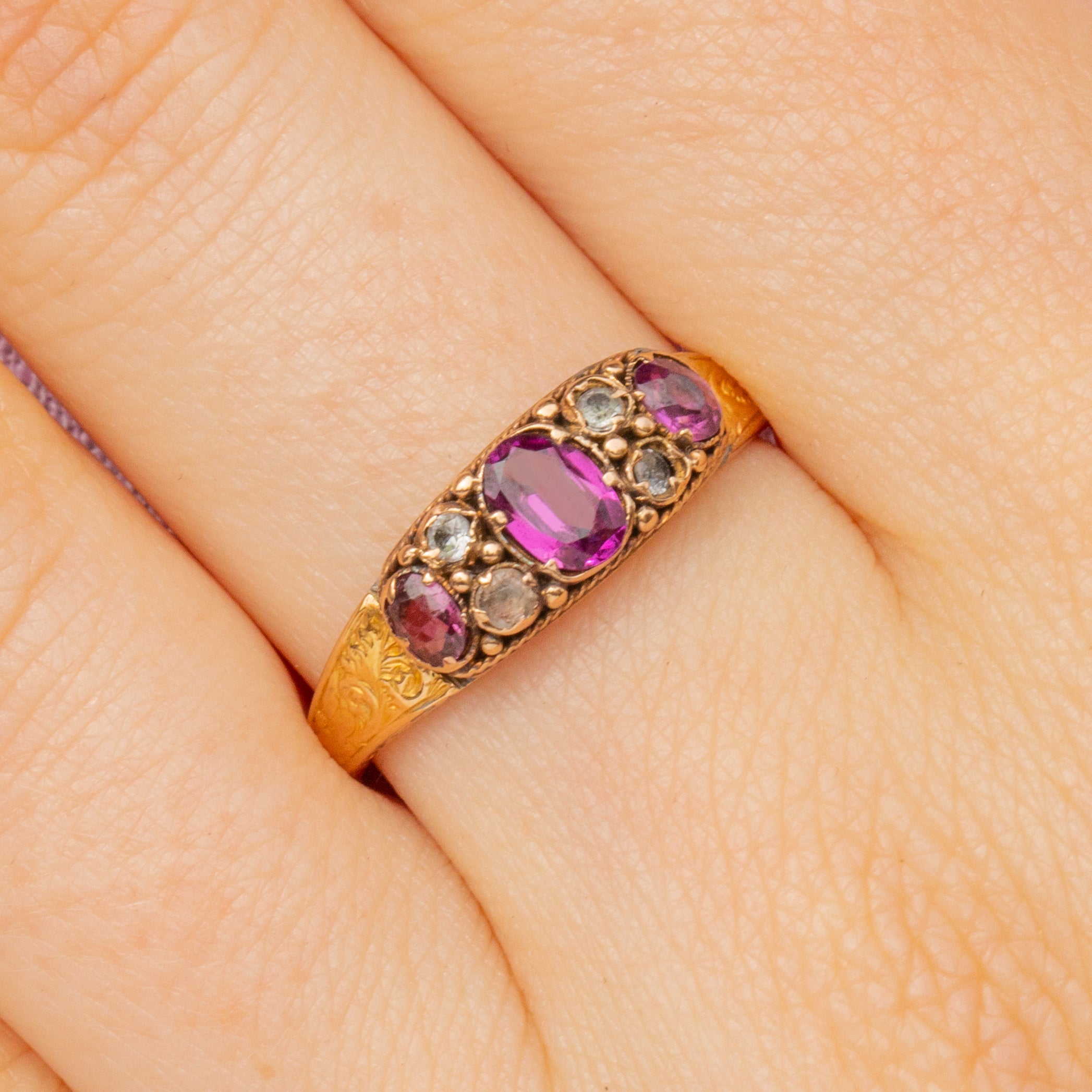 Add a touch of Victorian elegance to your ring stack with this tantalizing antique 15ct Gold Garnet three stone ring! Crafted from solid 15ct Gold, this Victorian ring has a delectable display of gemstones framed by decorative engraved shoulders adding a feminine allure.