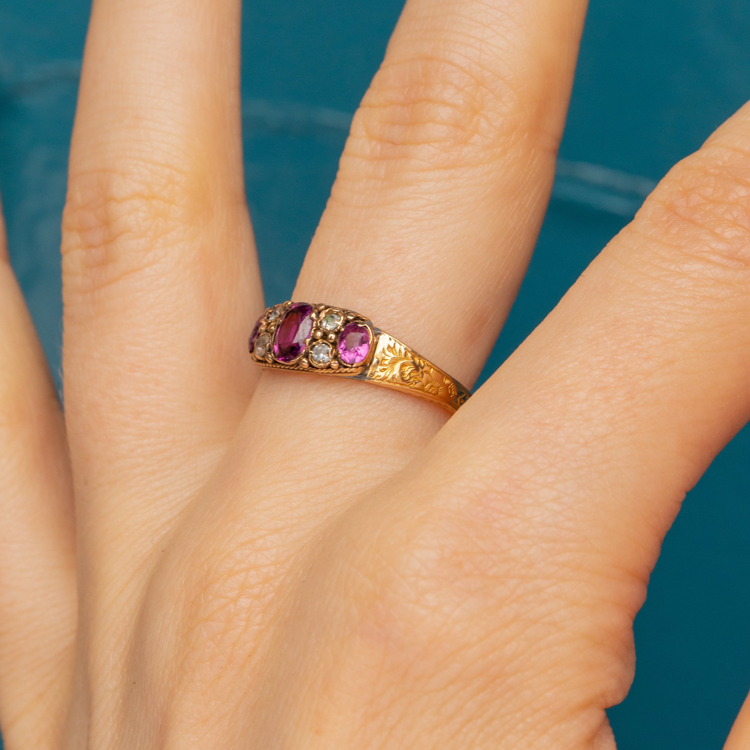 Antique 15ct Gold Garnet Three Stone Ring, Engraved Shoulders 1871