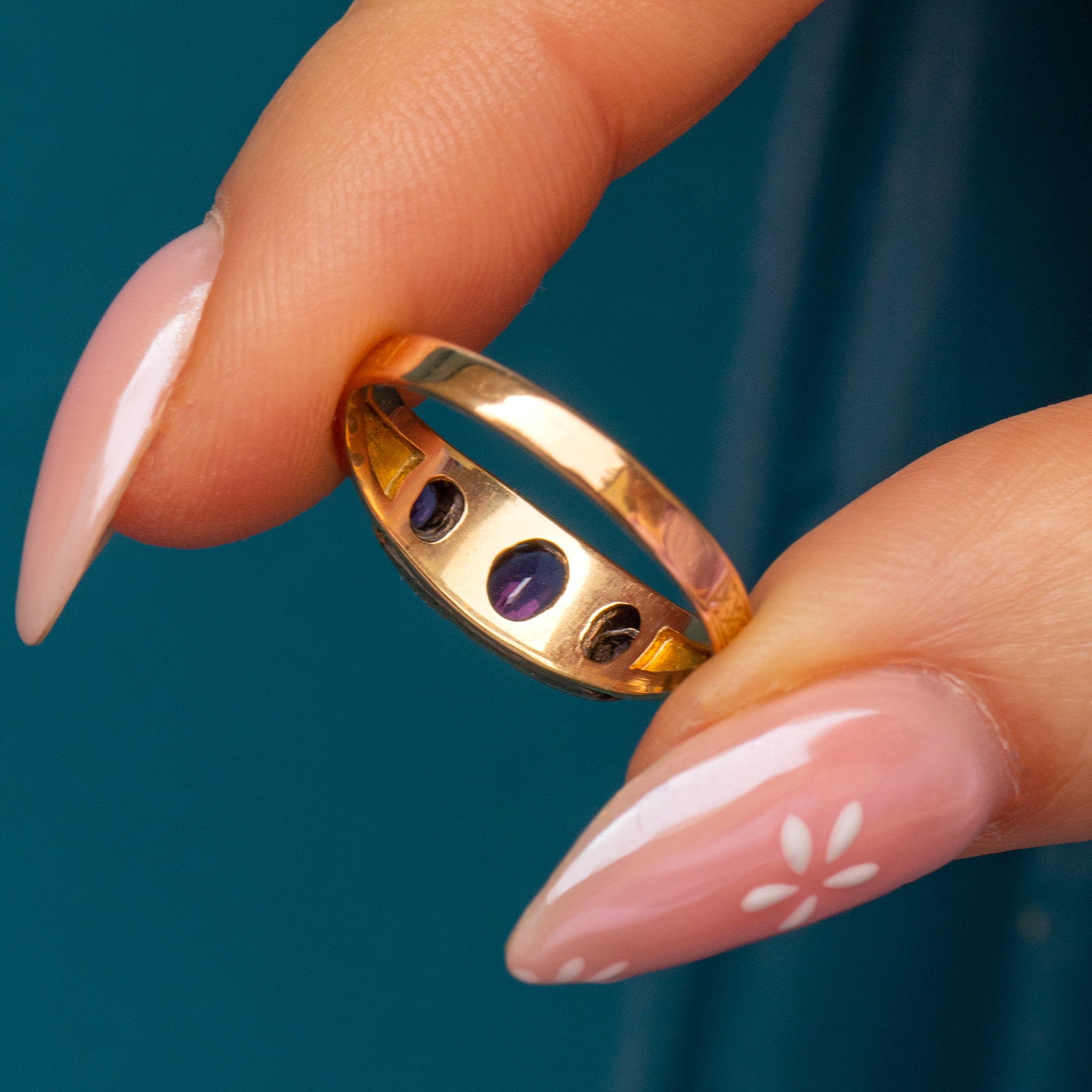 VERY GOOD. This antique 15ct Gold Garnet three stone ring is in very good condition. The Garnets are pristine with no chips or abrasions visible, some of the Quartz have sunken slightly in their settings but remain secure. The Gold is saturated with crisp engraved details, the band is smooth with no signs of resizing, and comes complete with a full set of hallmarks on the inside allowing us to accurately date her!