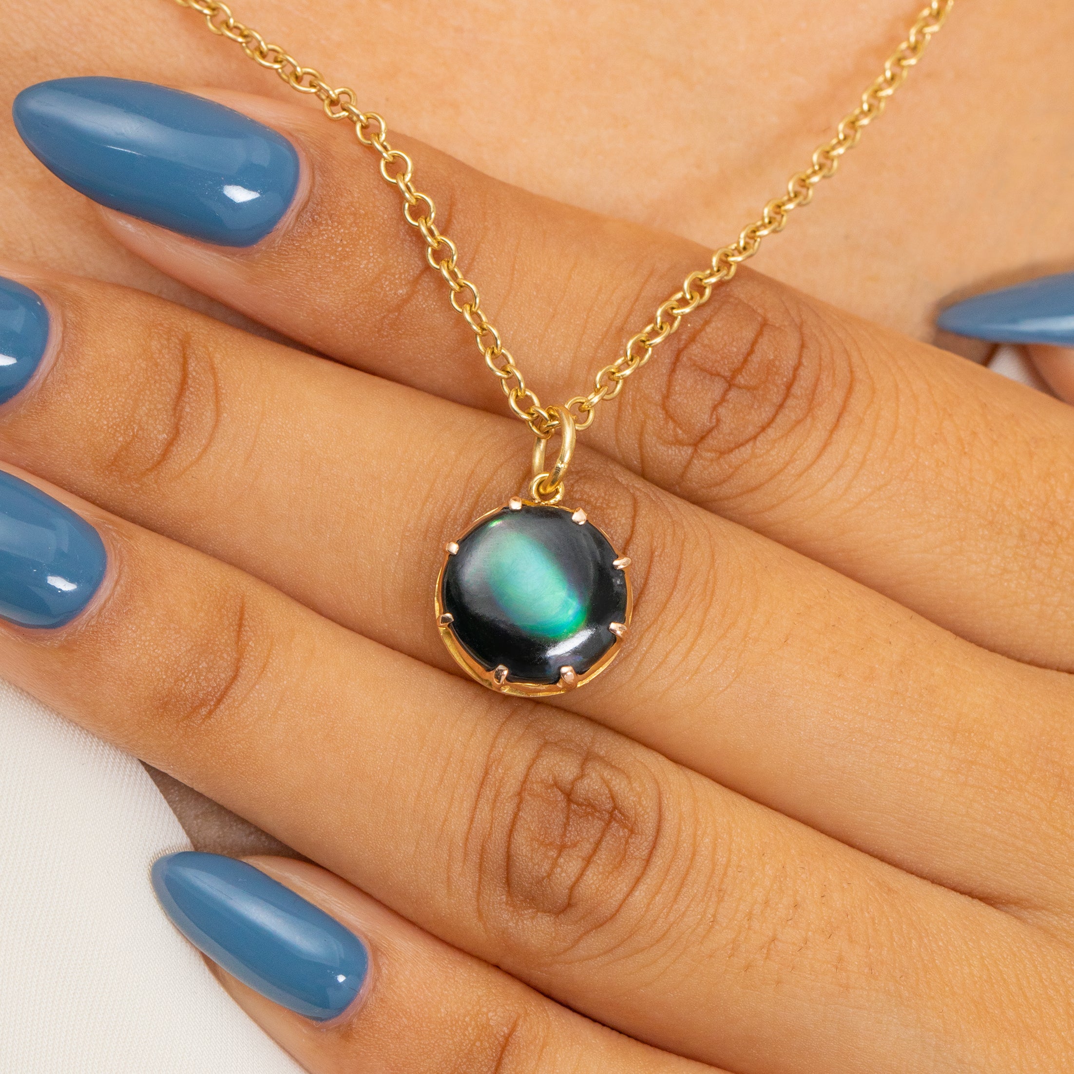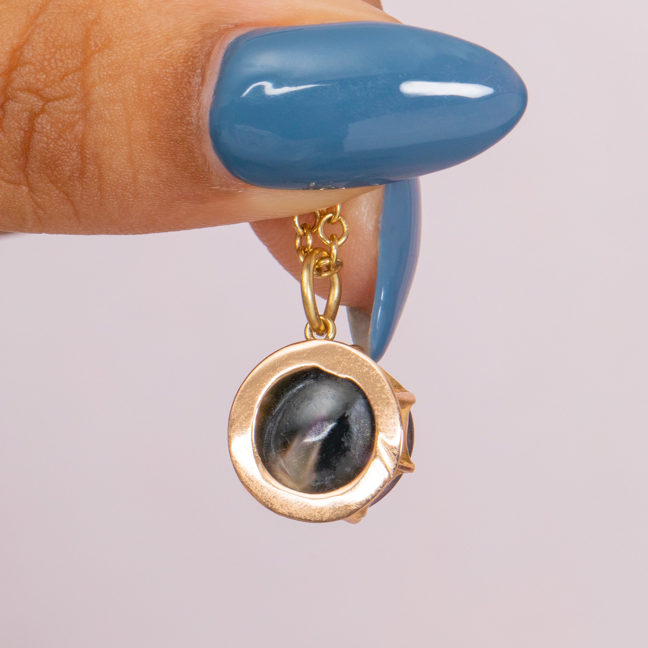 Become lost in the otherworldliness of this antique 15ct Gold Mother of Pearl charm! Akin to an aurora borealis (or Northern Lights), her jet-black core illuminates a pearlescent sheen that shimmers with ethereal tones.