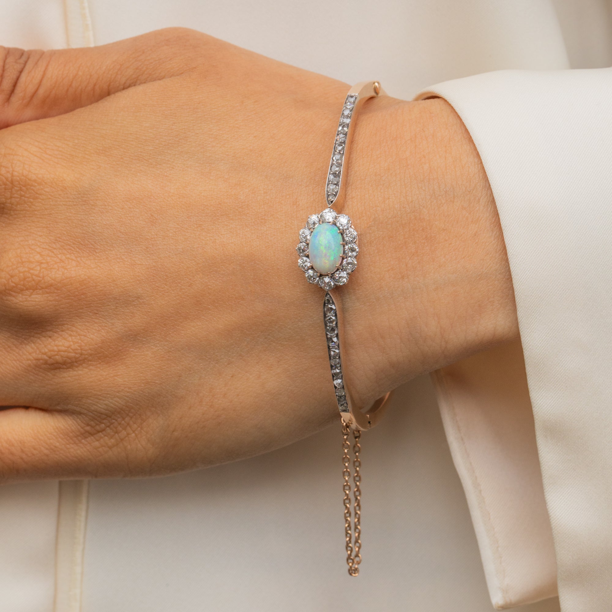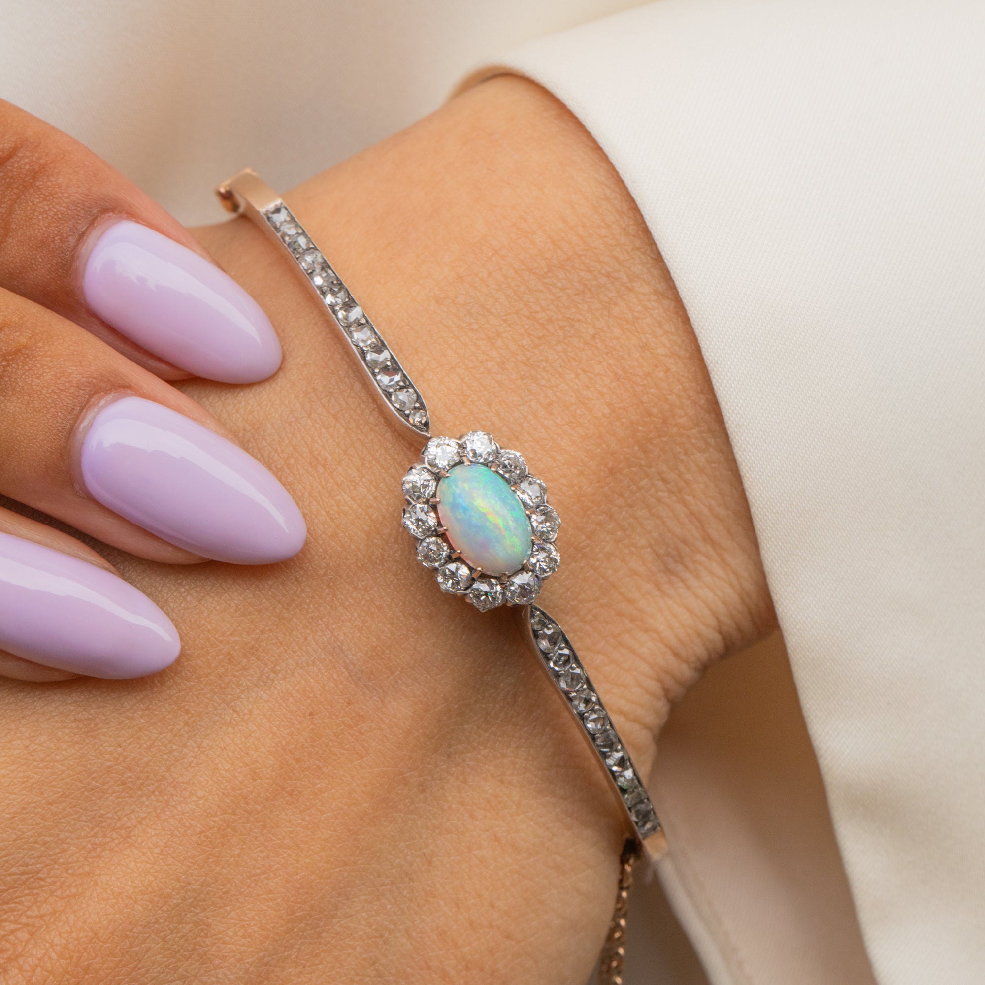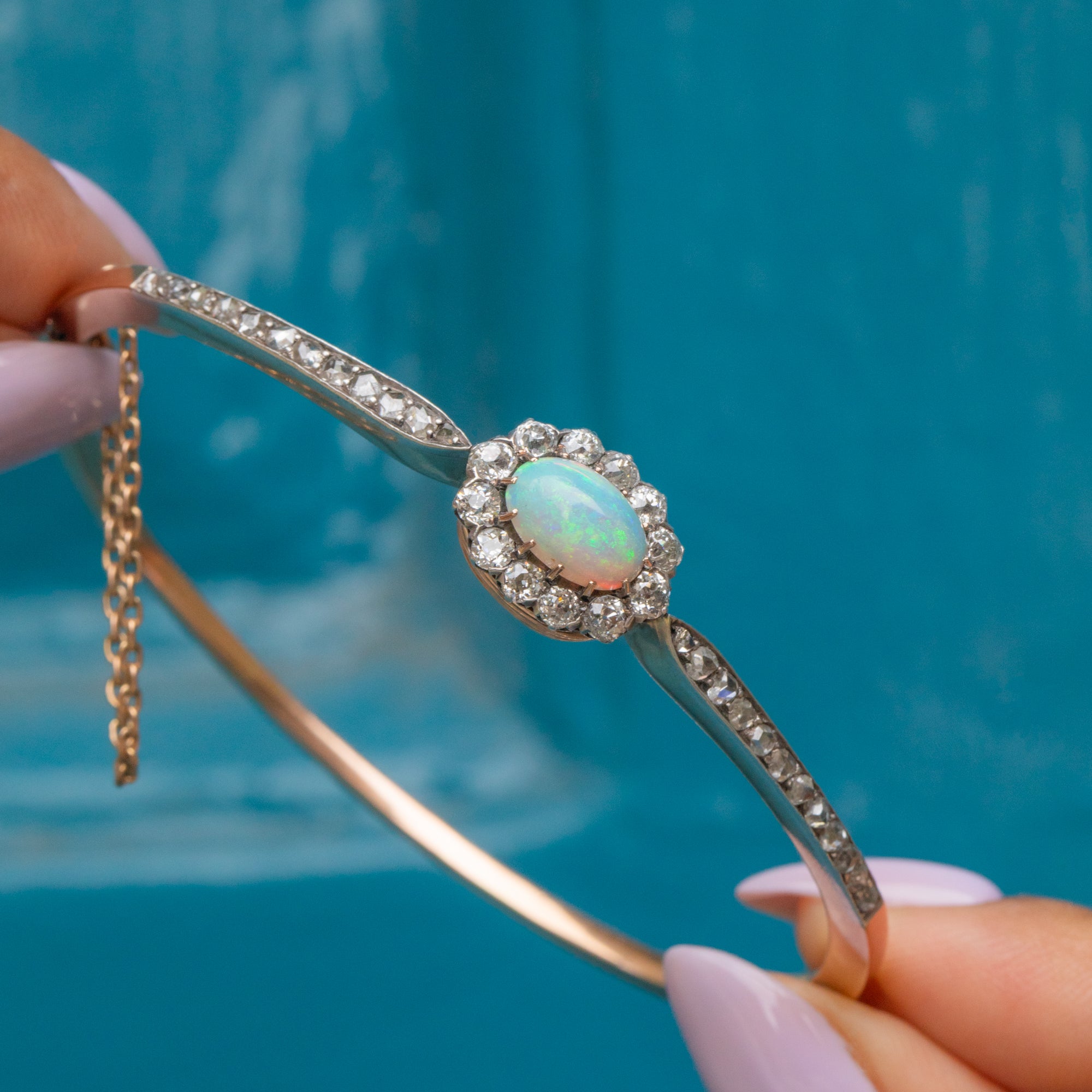 EXCELLENT. This antique 15ct Gold Opal Diamond bangle is offered in excellent condition. The Opal is secured within its setting and is free from nibbles or chips. The Diamonds are sparkly, securely set, and have been beautifully hand-cut. The 15ct Gold is lustrously shiny and has remained unscathed over the years. There is a mark on the back of the bangle from where the piece has been previously resized, but the Gold is smooth and the resizing has been professionally carried out. The bangle features a subtle clasp providing you with a secure and comfortable closure, with added protection from the safety chain.
