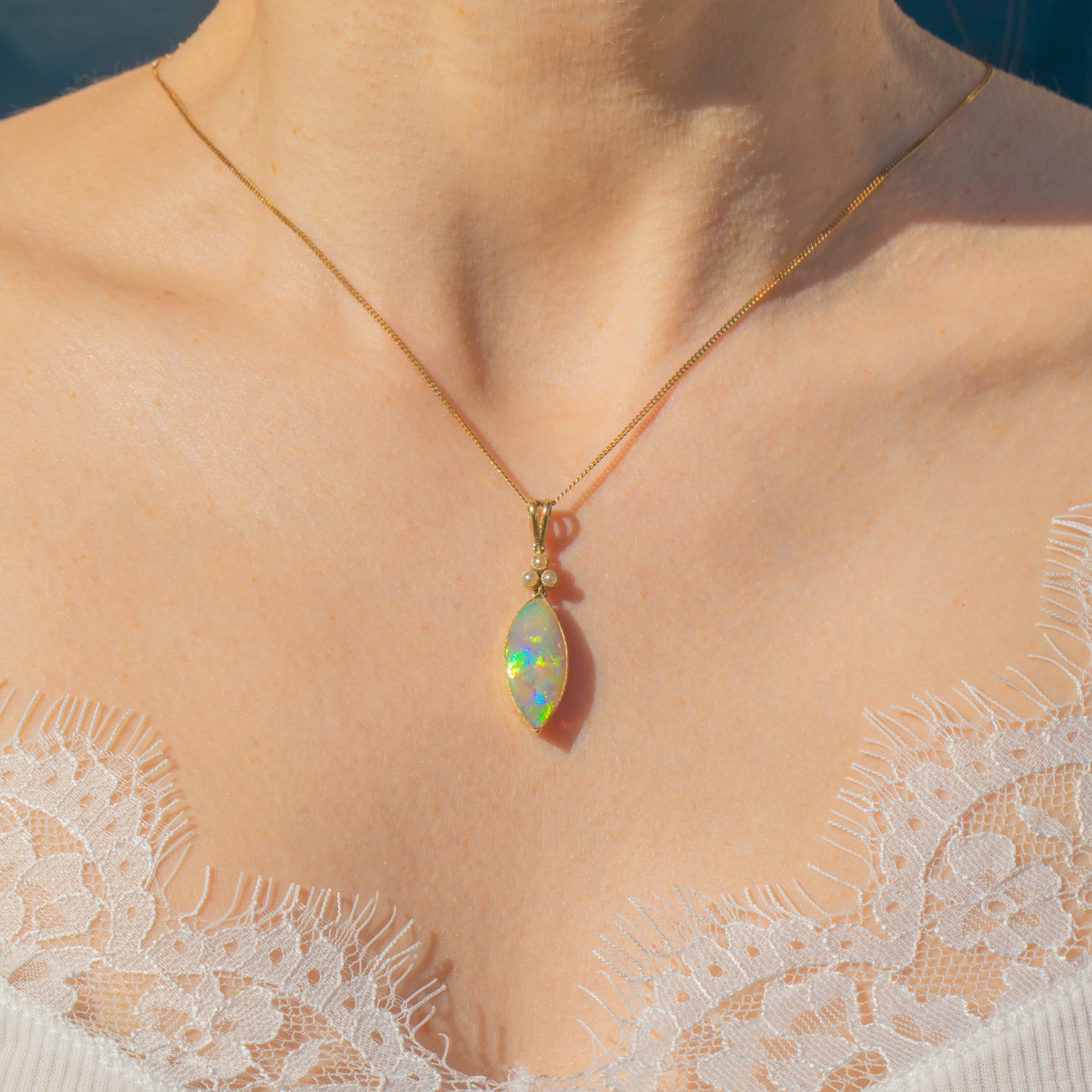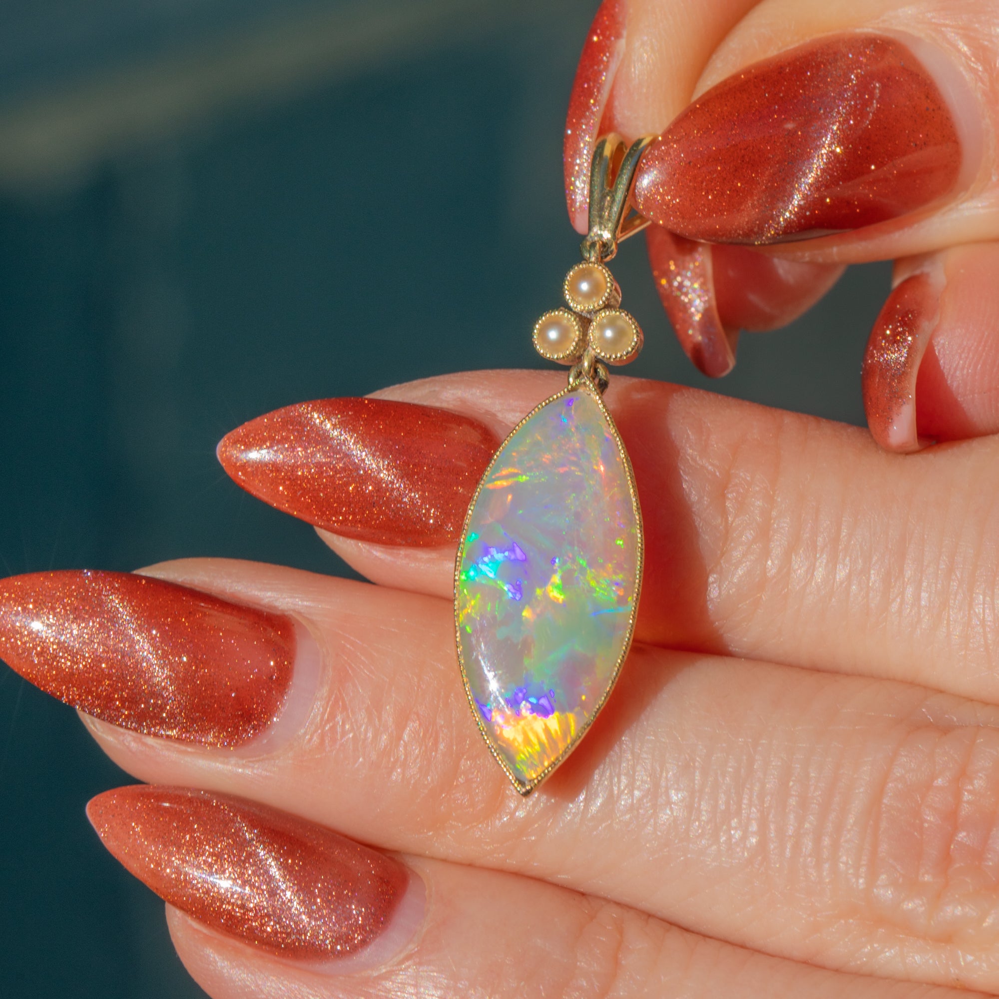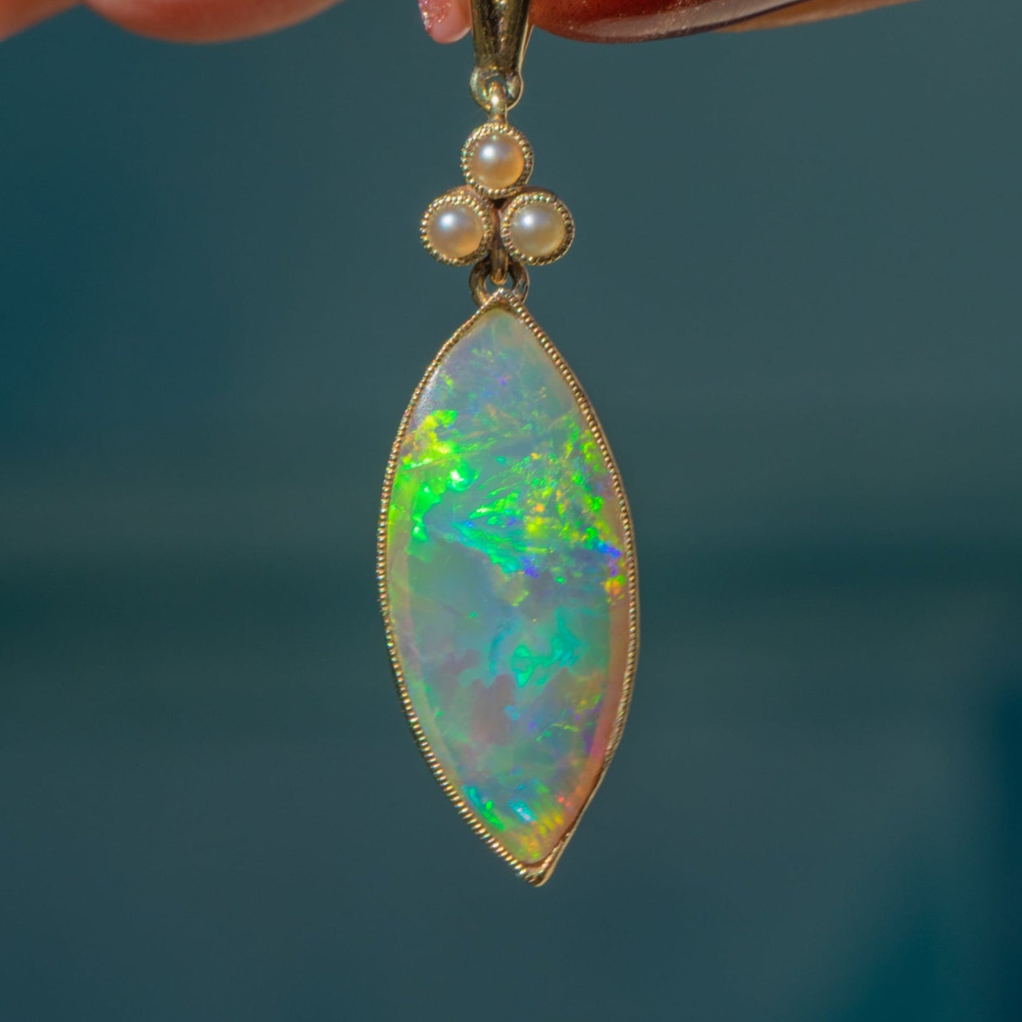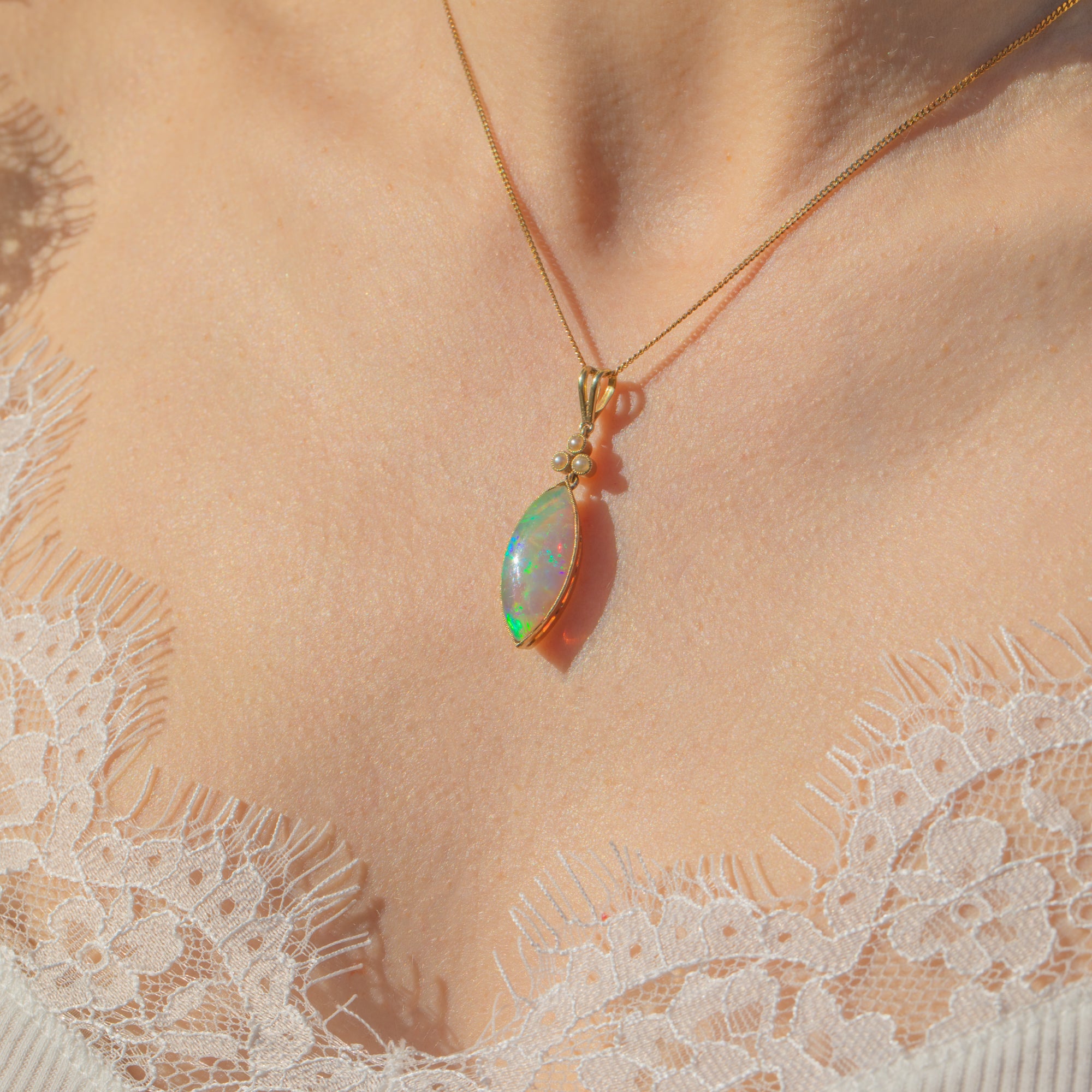 This antique 15ct Gold Opal navette Pearl pendant is packed with Edwardian charm! In her centre sits a large, navette-cut Opal with an outstanding luminescence, radiating vibrant greens and oranges from its cool blue core.