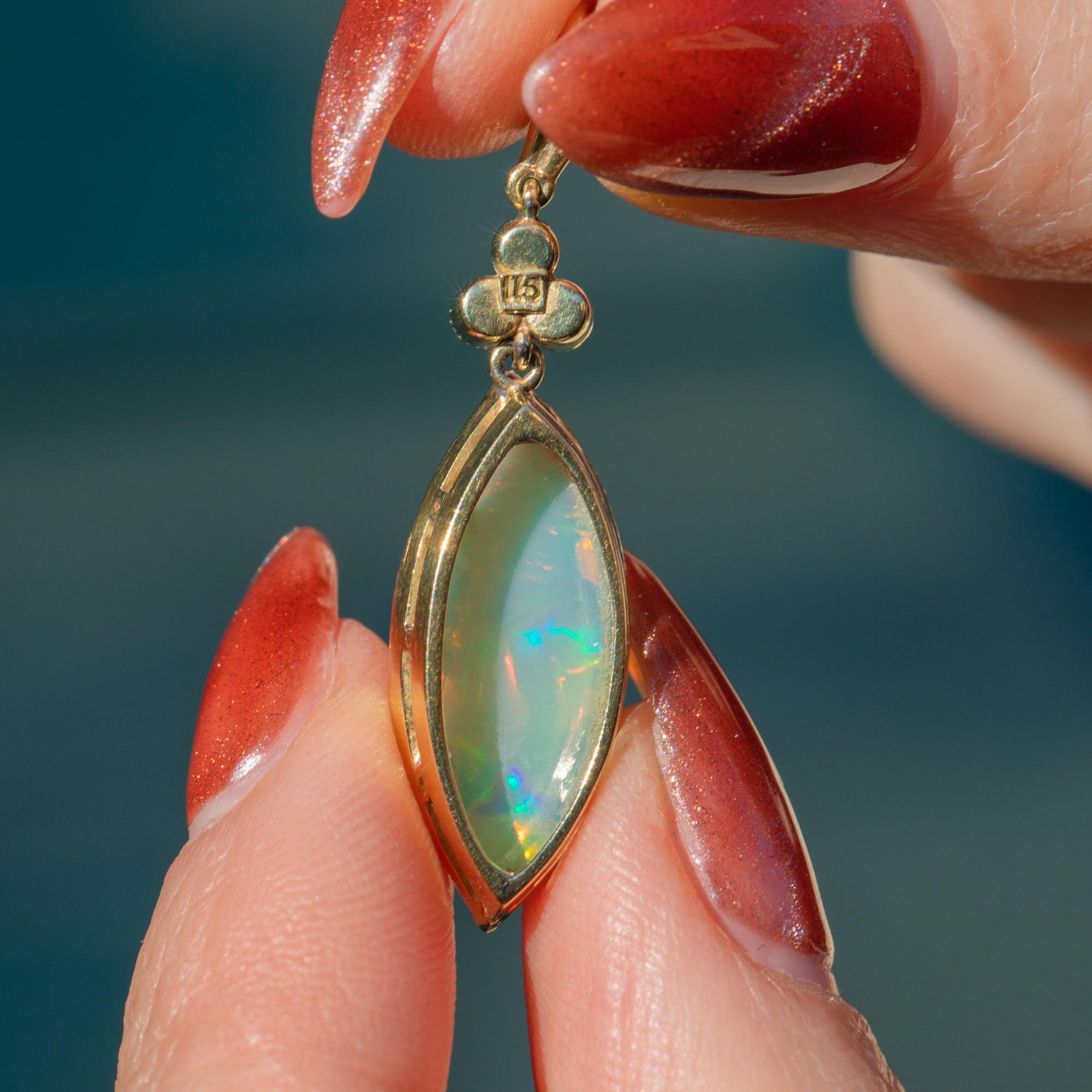 VERY GOOD-EXCELLENT. This antique 15ct Gold Opal navette Pearl pendant is in superb condition. Her Opal and Pearls are radiant, with little signs of wear. They sit securely within their 15ct Gold settings. The Gold shows some signs of wear commensurate with age, but this does not impact the integrity of the piece. With a large and robust bale, you can wear this phenomenal piece of Edwradian jewellery with utmost confidence!