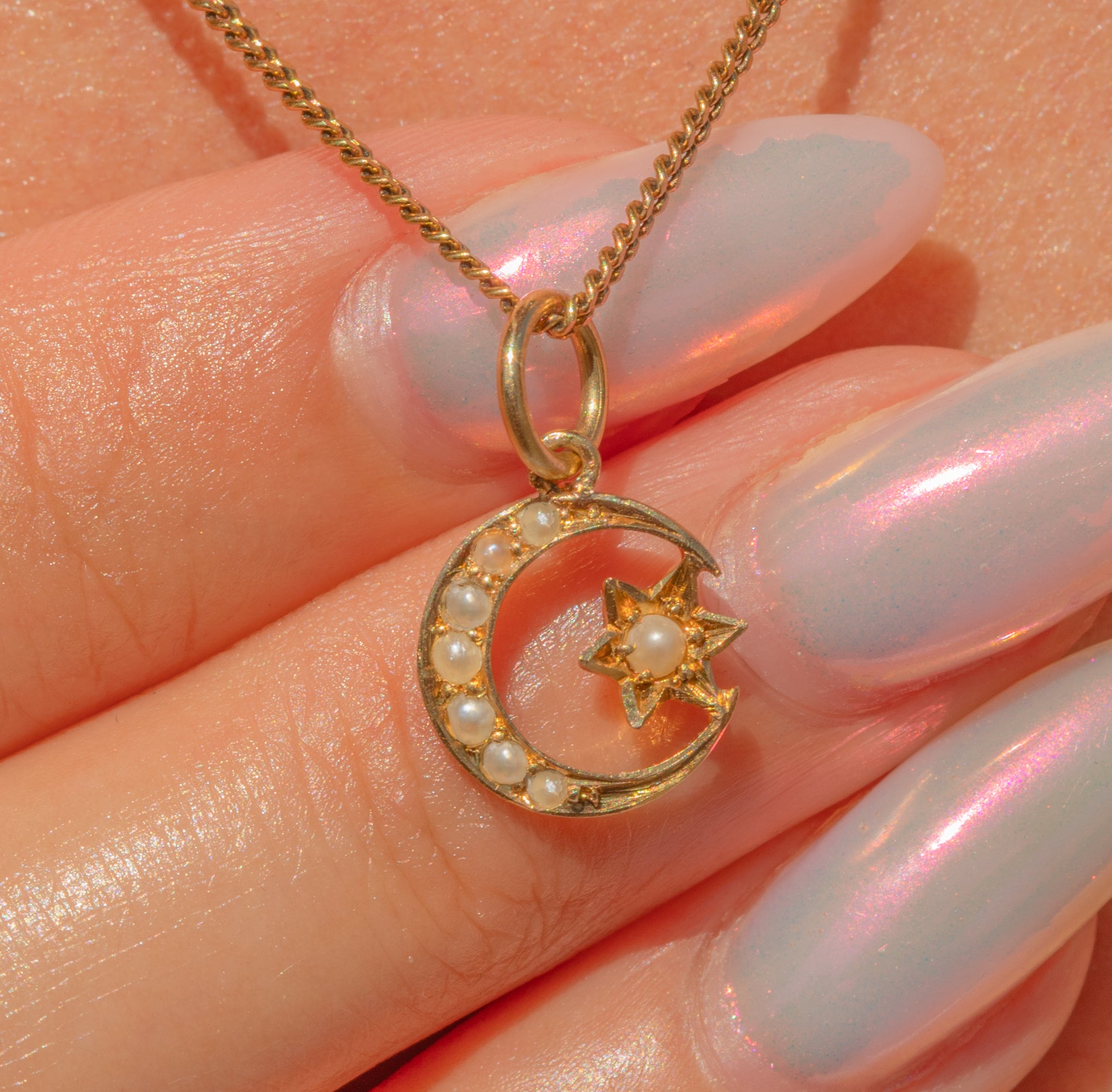 This dainty antique charm radiates celestial allure in quintessential Victorian fashion- crafted into a crescent moon and star and inlaid with graduating seed Pearls.