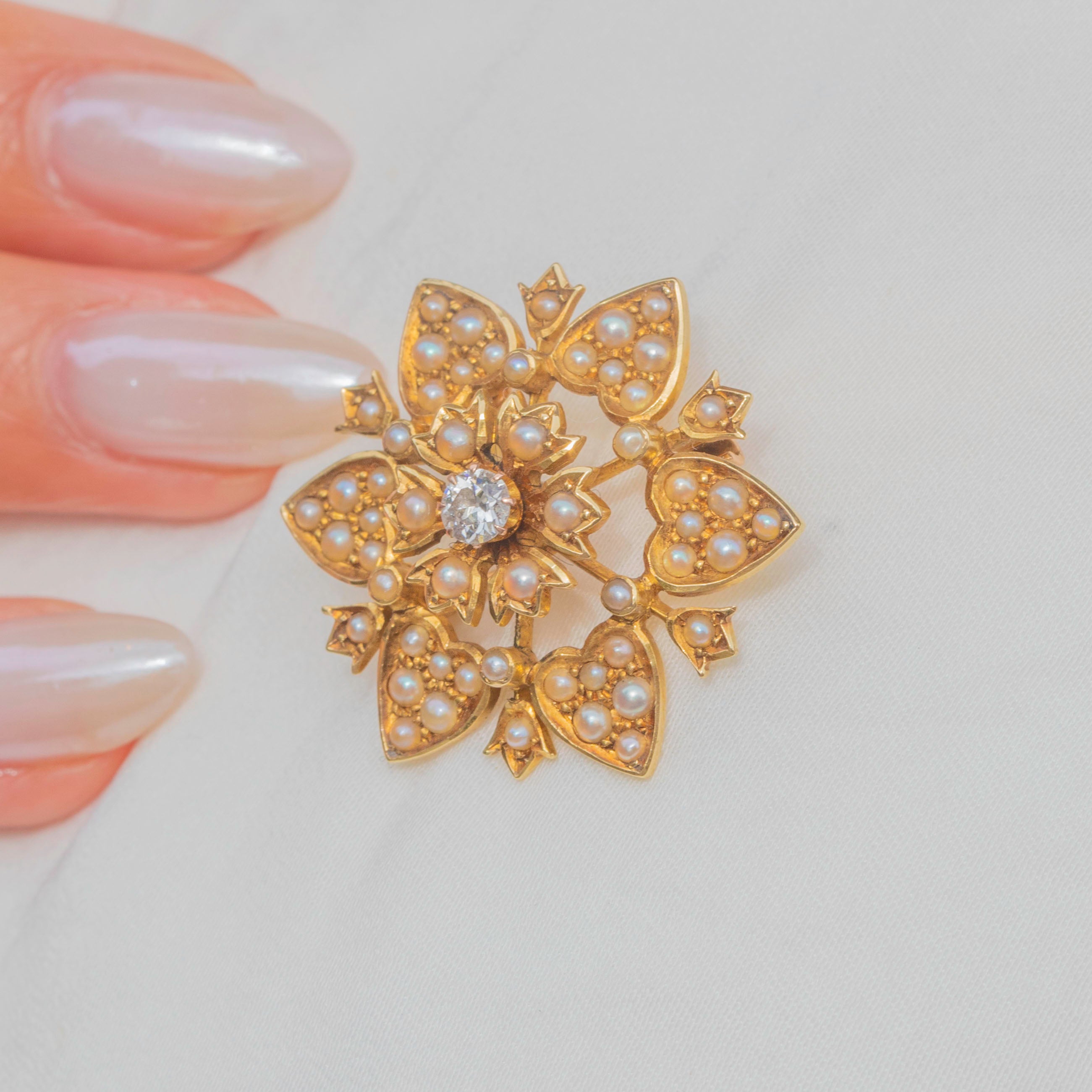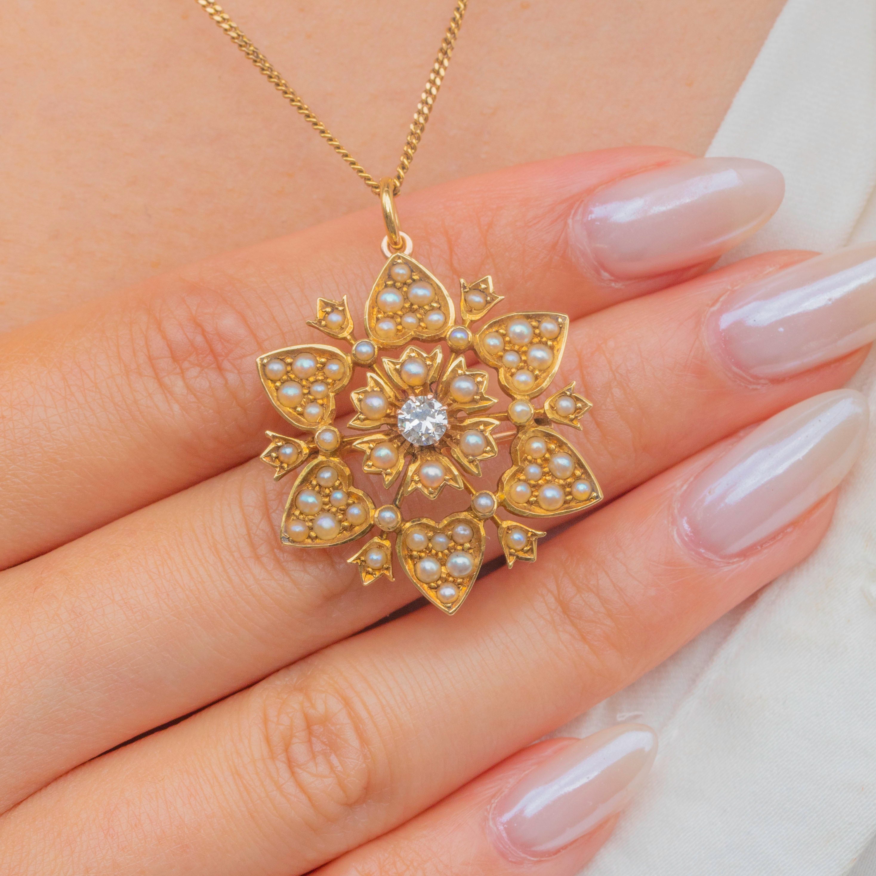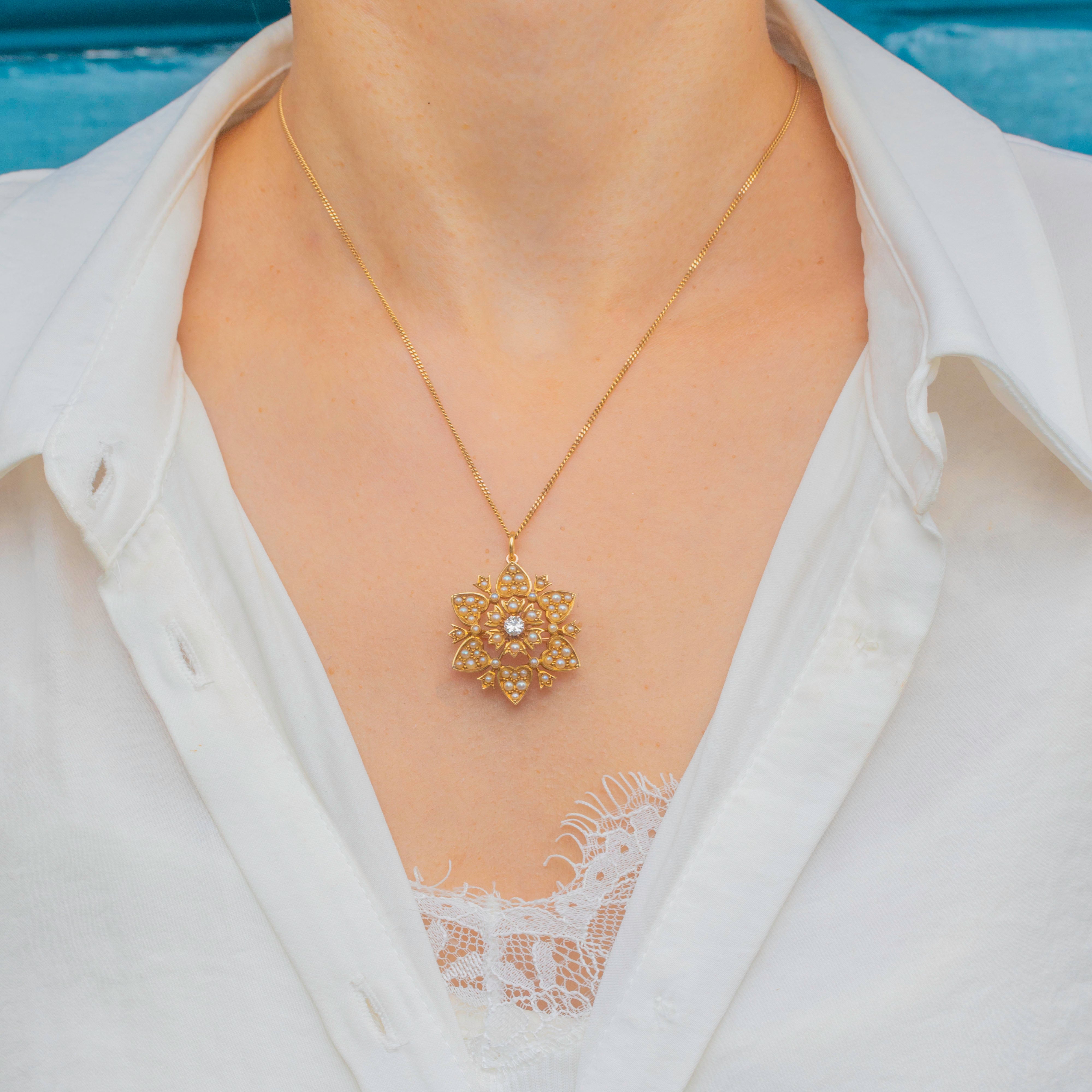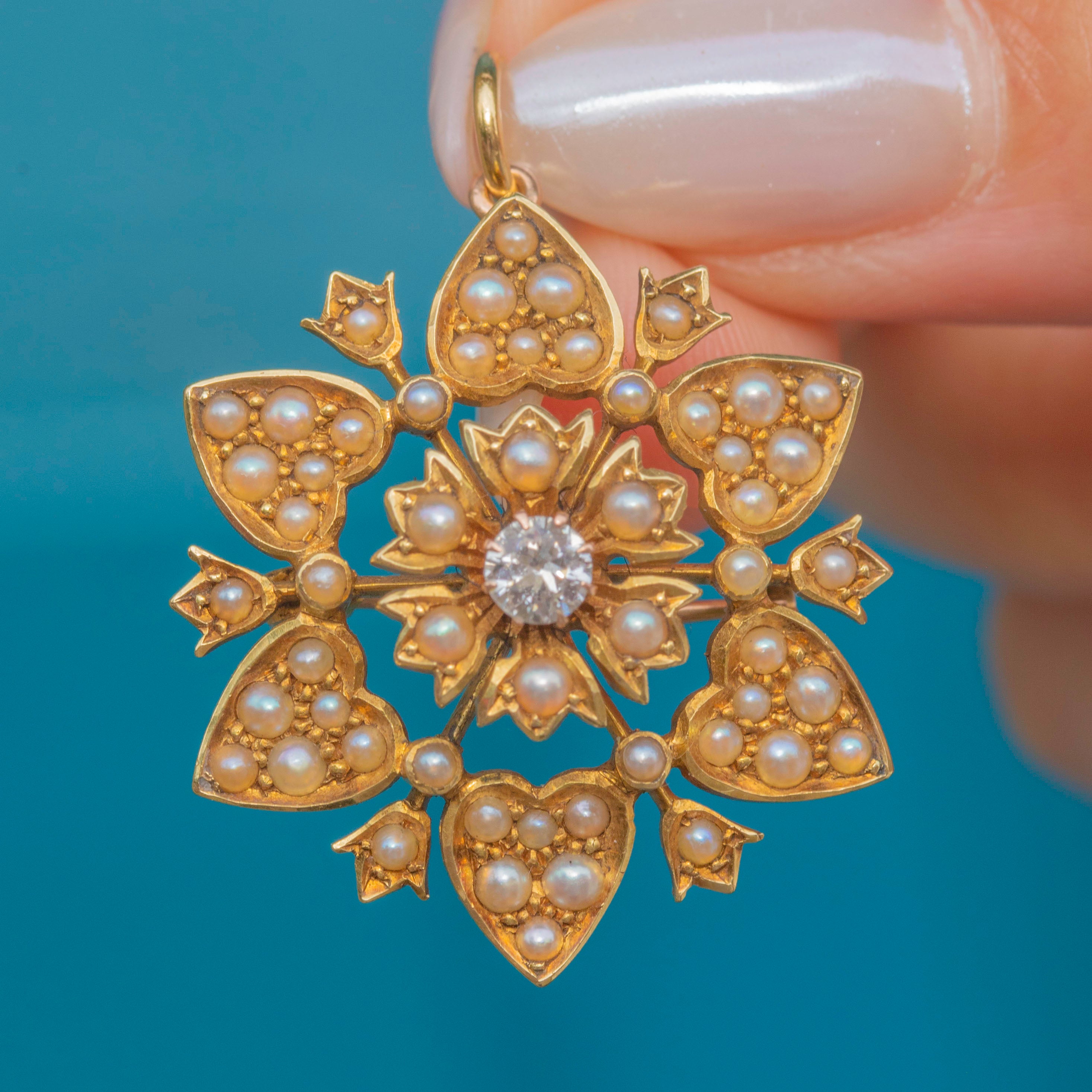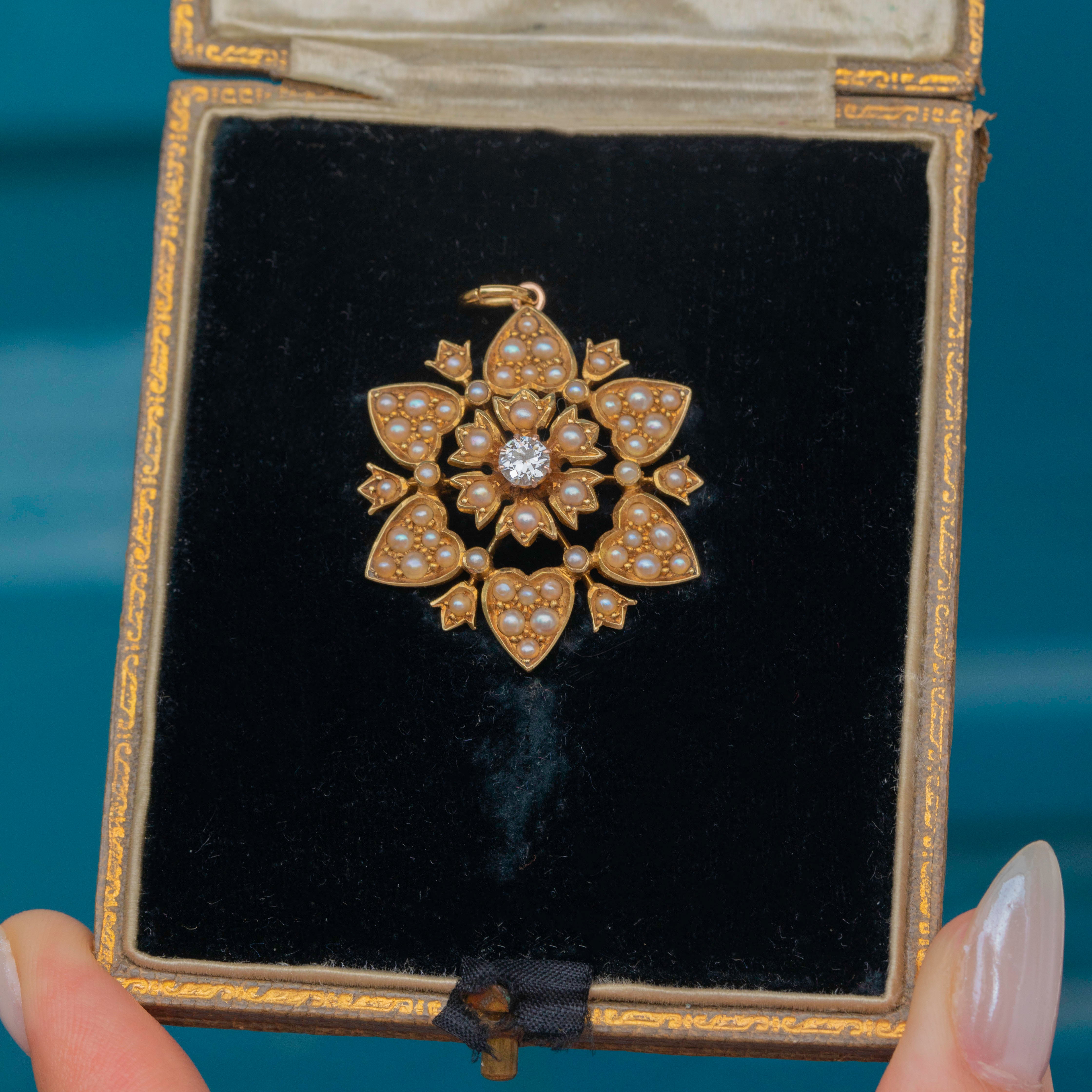Formed from rare 15ct Gold and bursting with iridescent Seed Pearls centred by a scintillating 0.17ct Diamond, this antique pendant is an exemplar of Victorian craftsmanship!