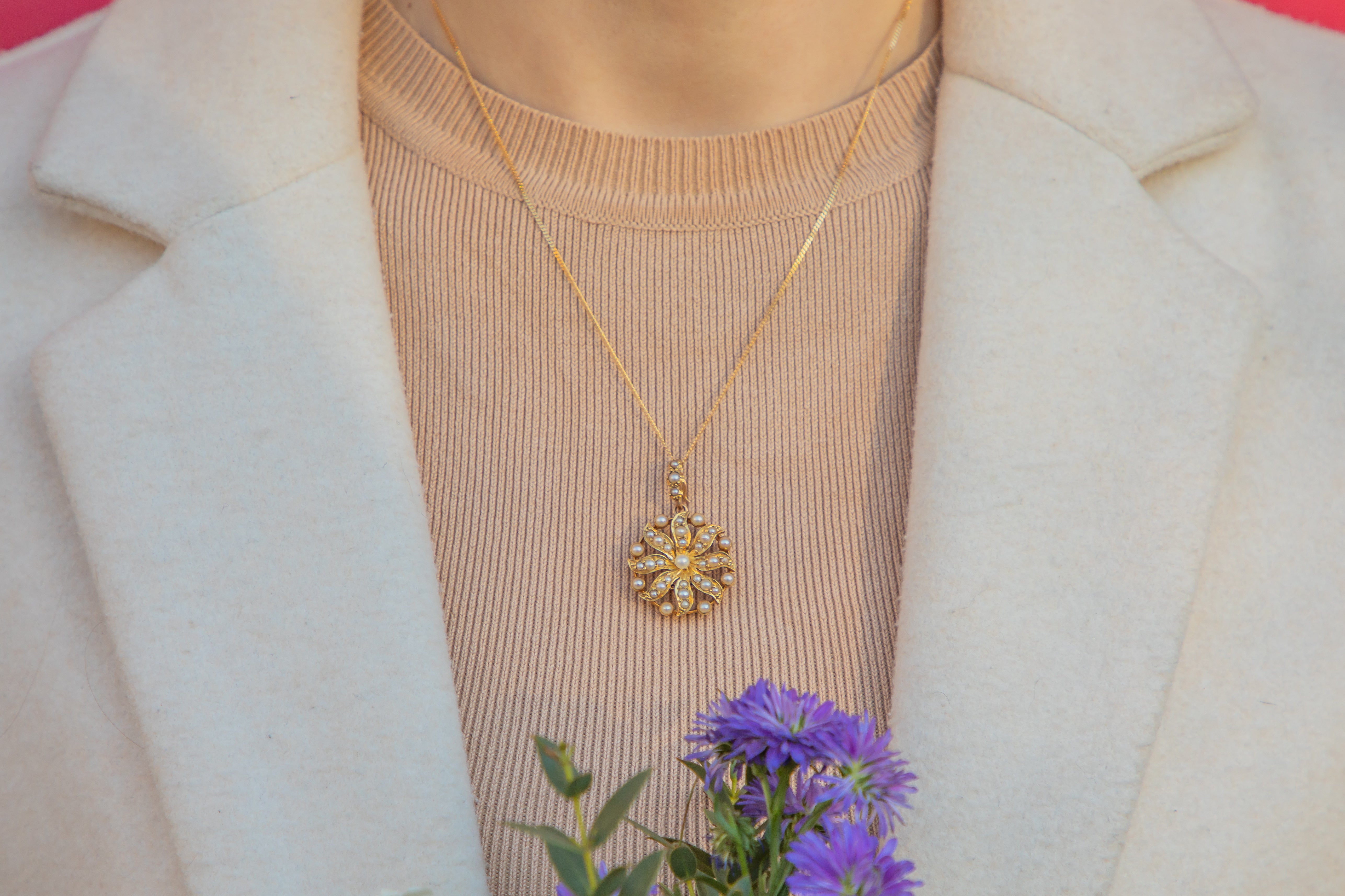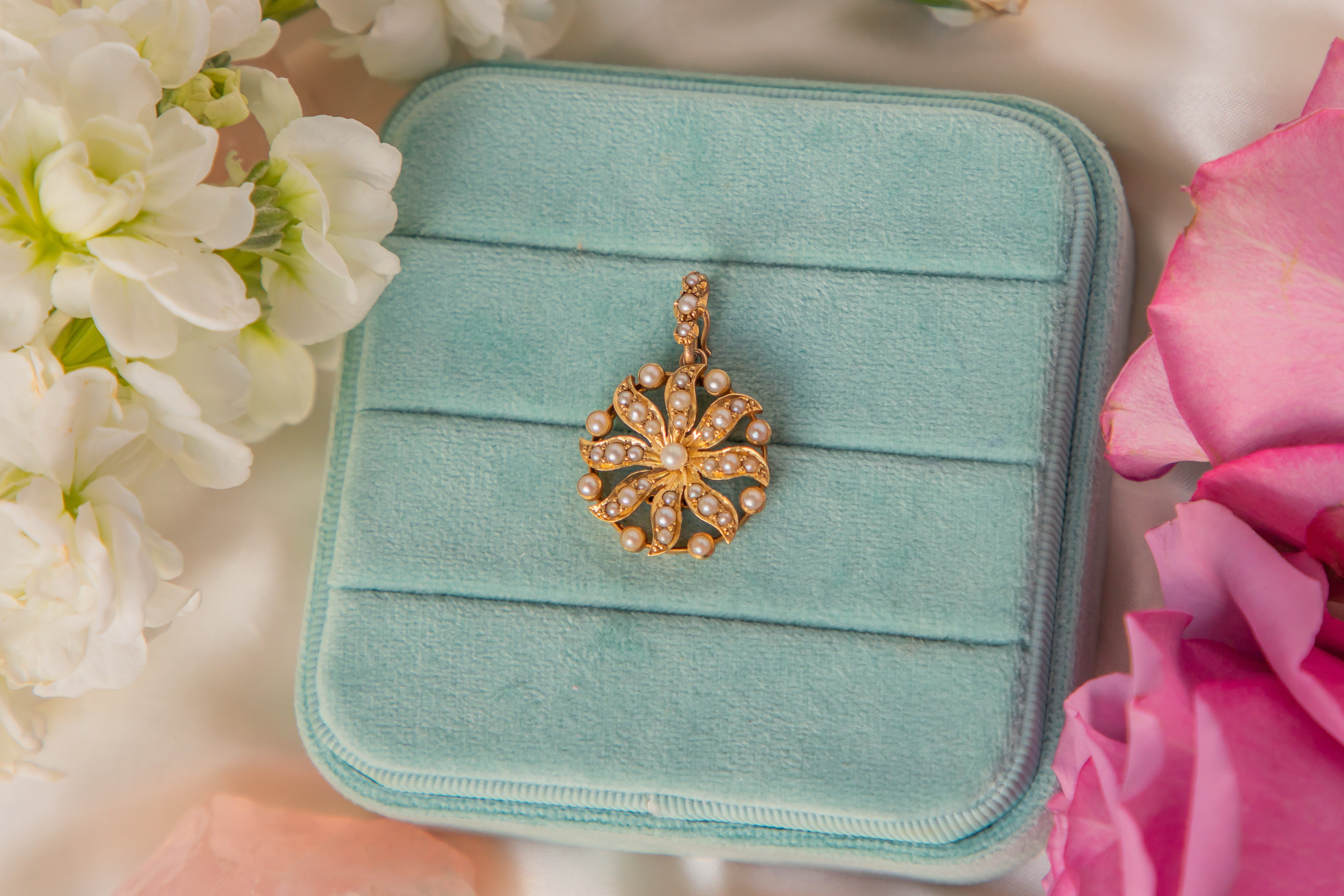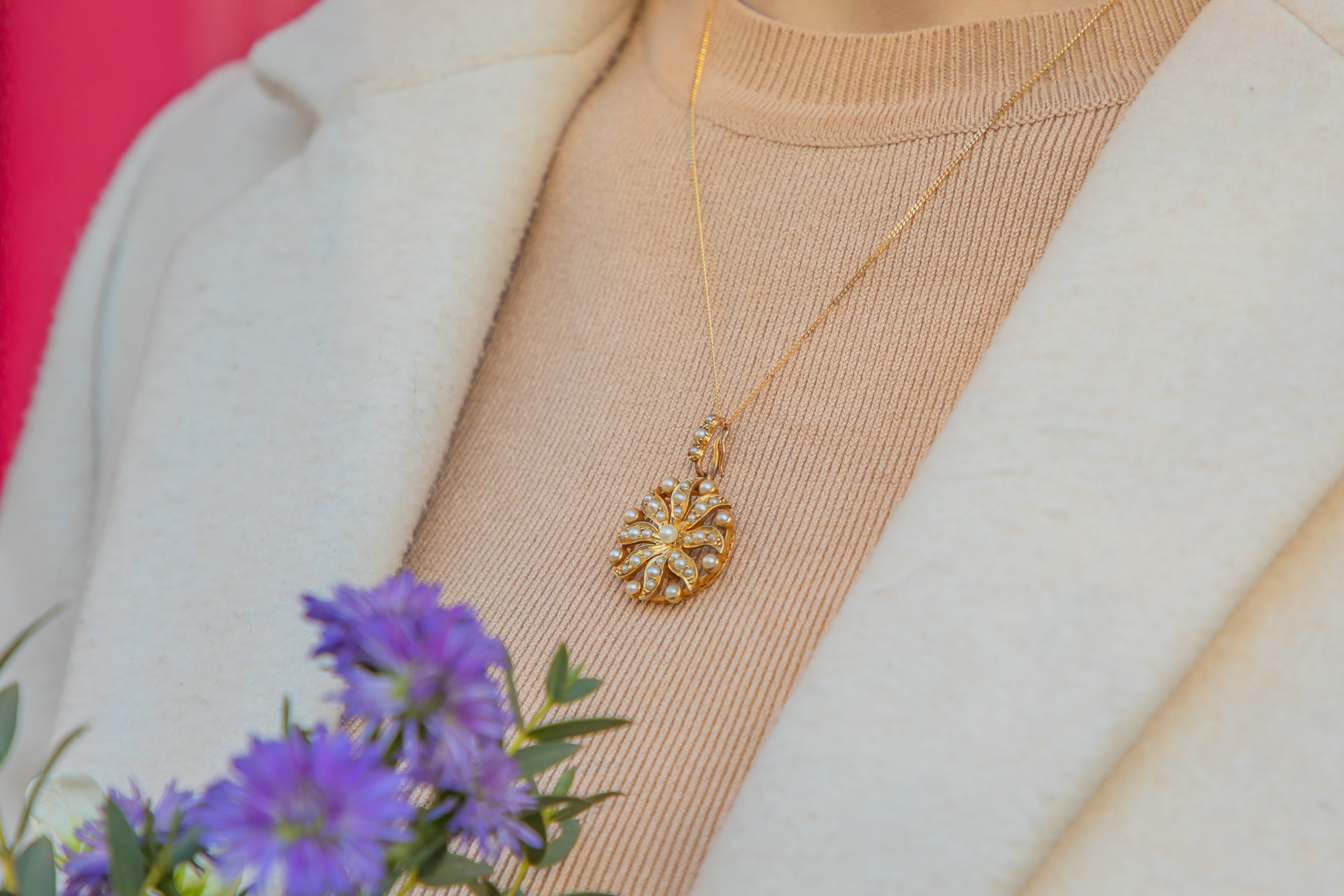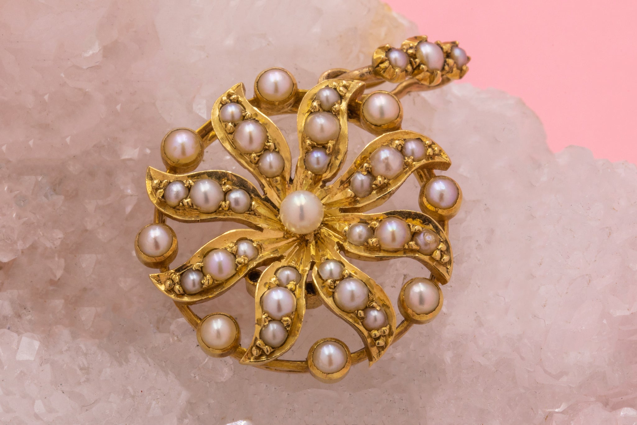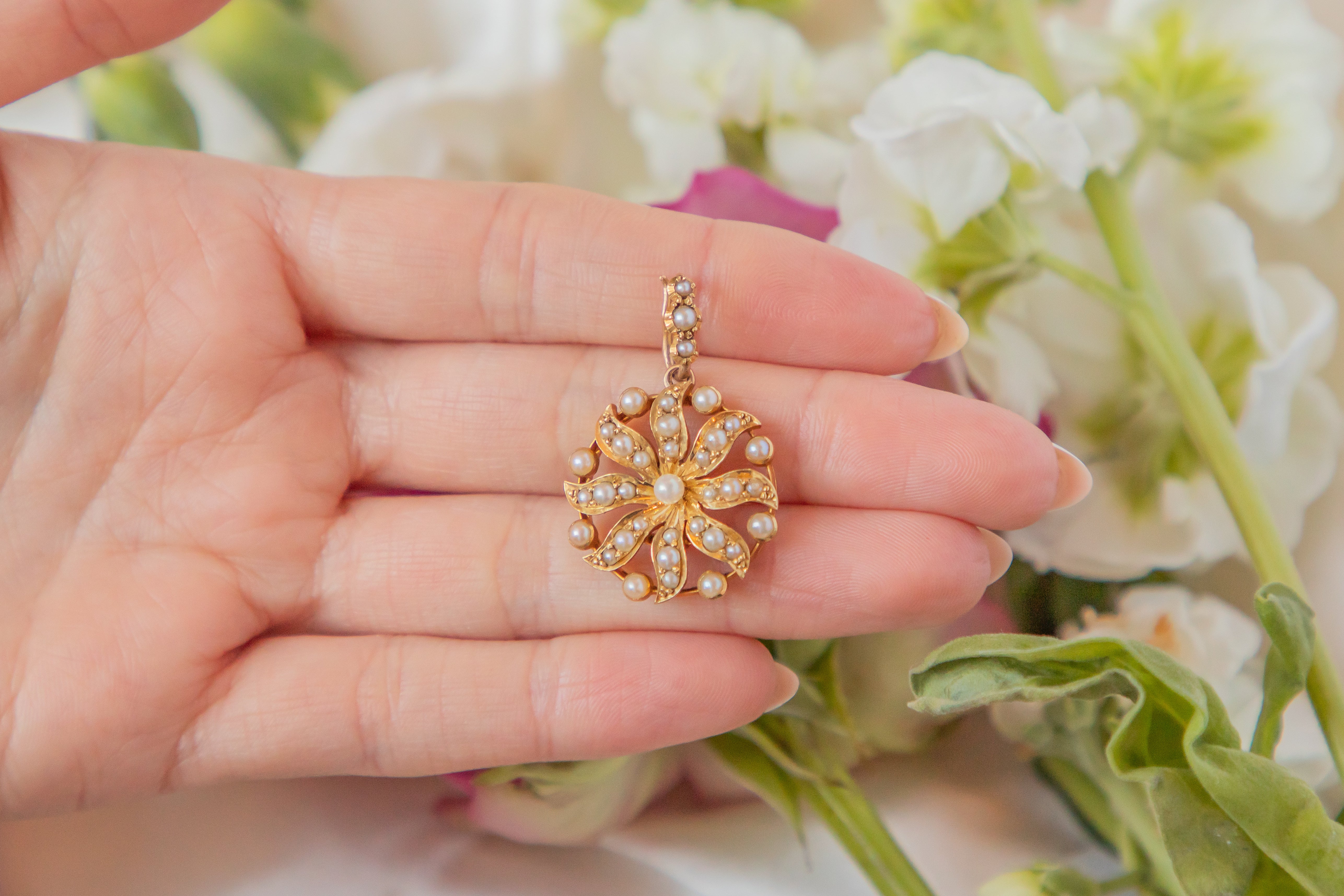 Floral and feminine, this antique 15ct Gold Pearl flower pendant is just heavenly! Boasting a curvaceous flower centre, every inch of her buttery 15ct Gold is embellished with lustrous Pearls.