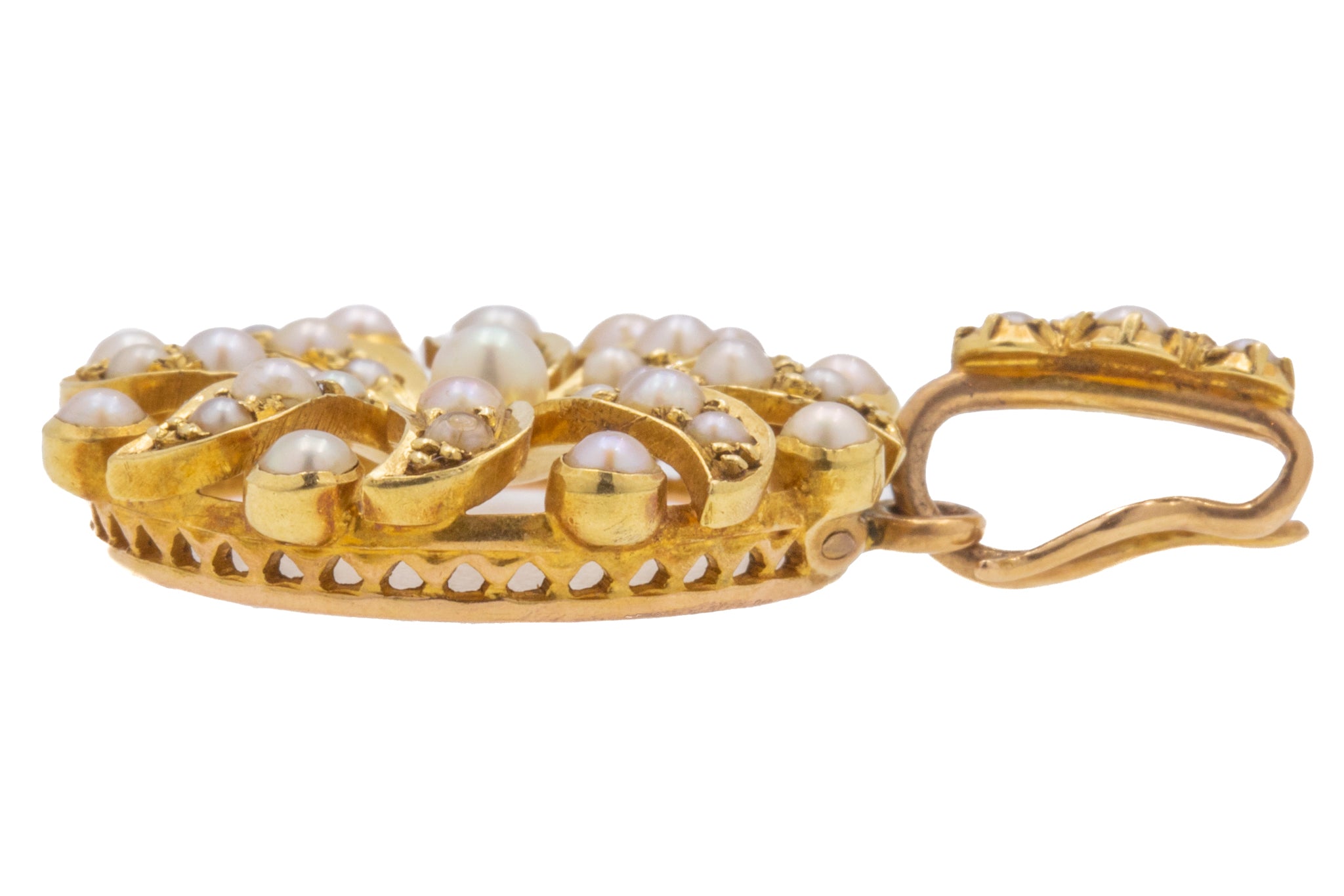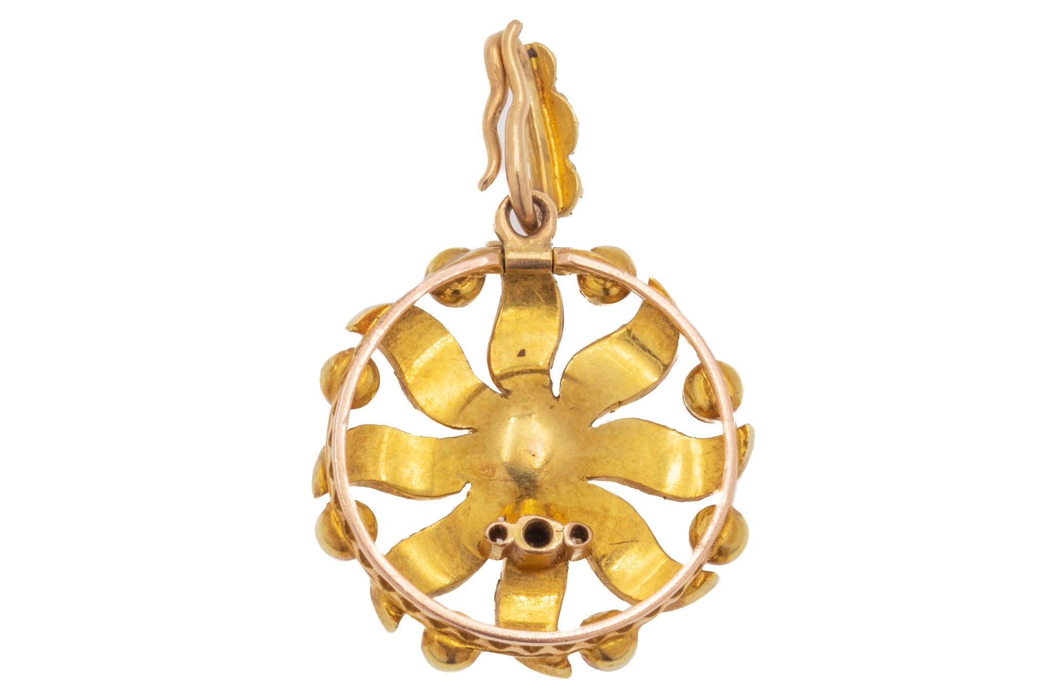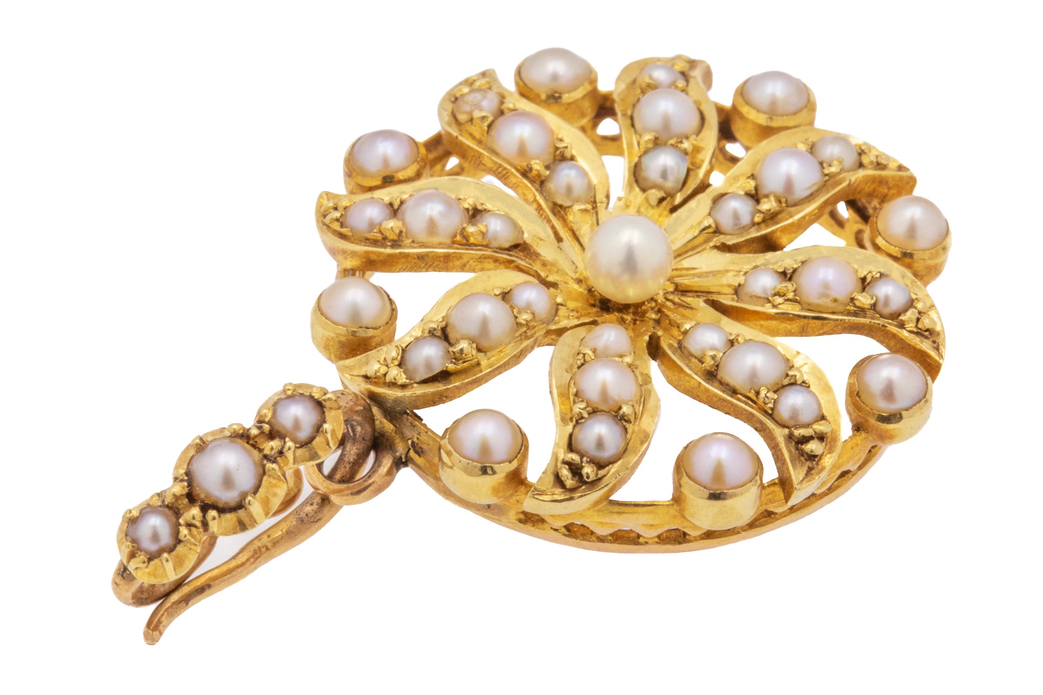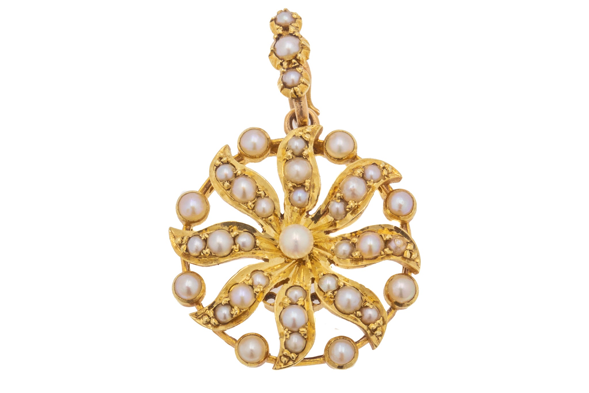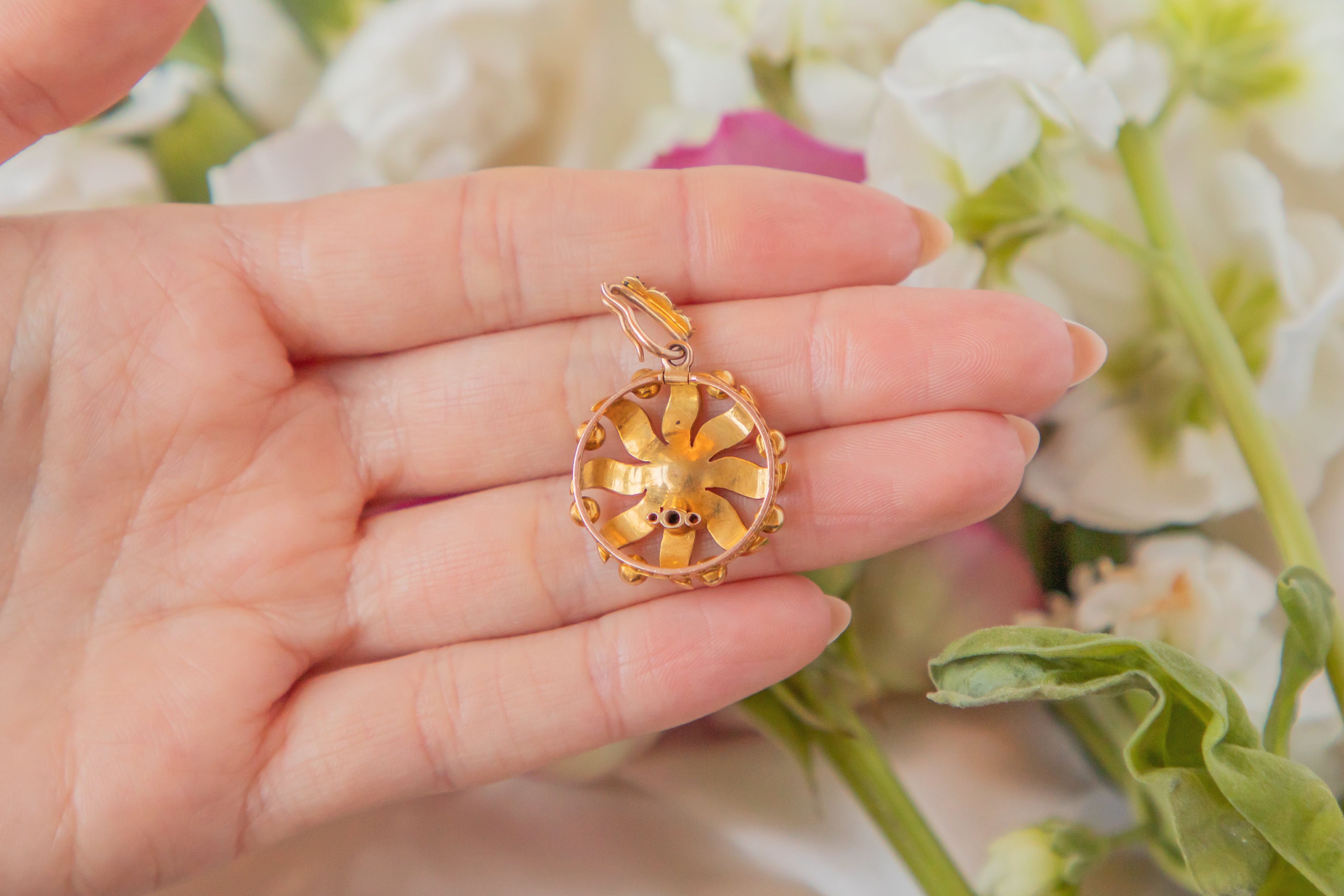 VERY GOOD-EXCELLENT: This antique 15ct Gold Pearl flower pendant is in excellent condition. Her rich 15ct Gold is like sunshine, buttery and golden in tone. Every inch is embellished with shimmering Pearls, each with their own tone, some cotton white, some champagne-hued! Note one smaller Pearl has a chip, however, all remain securely set, so you can wear this Victorian pendant with the utmost confidence!