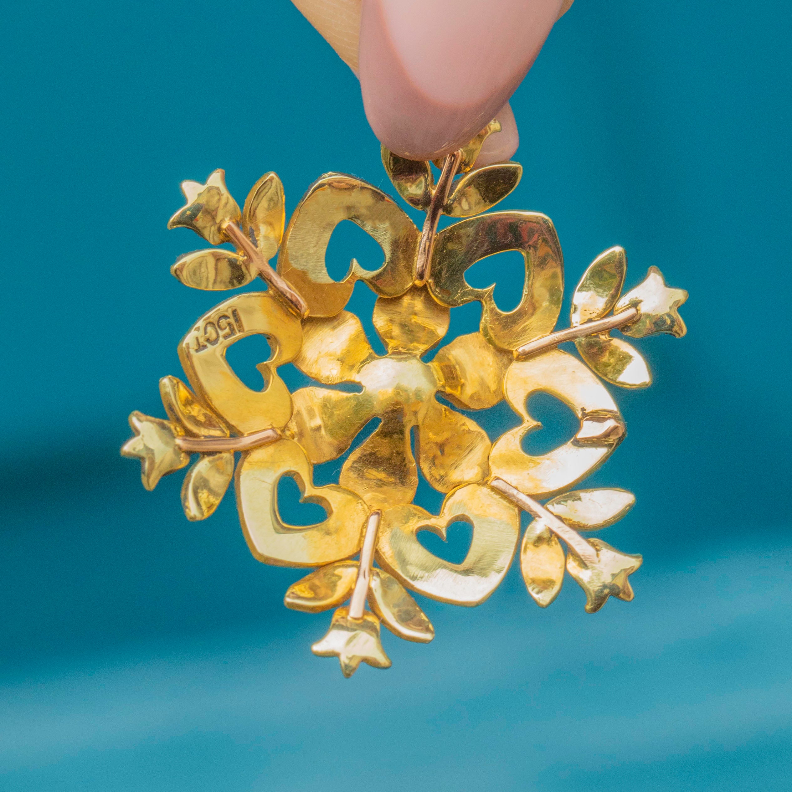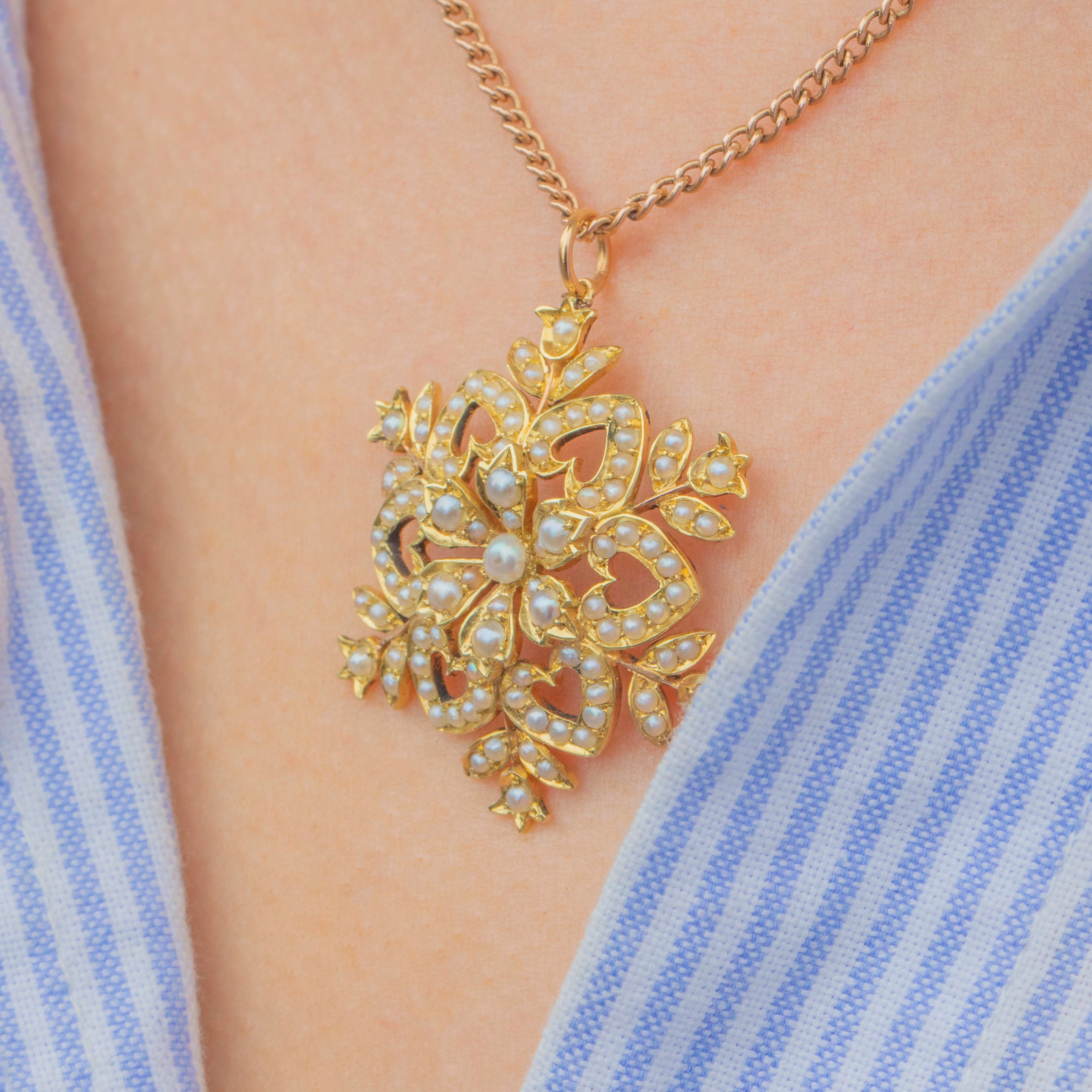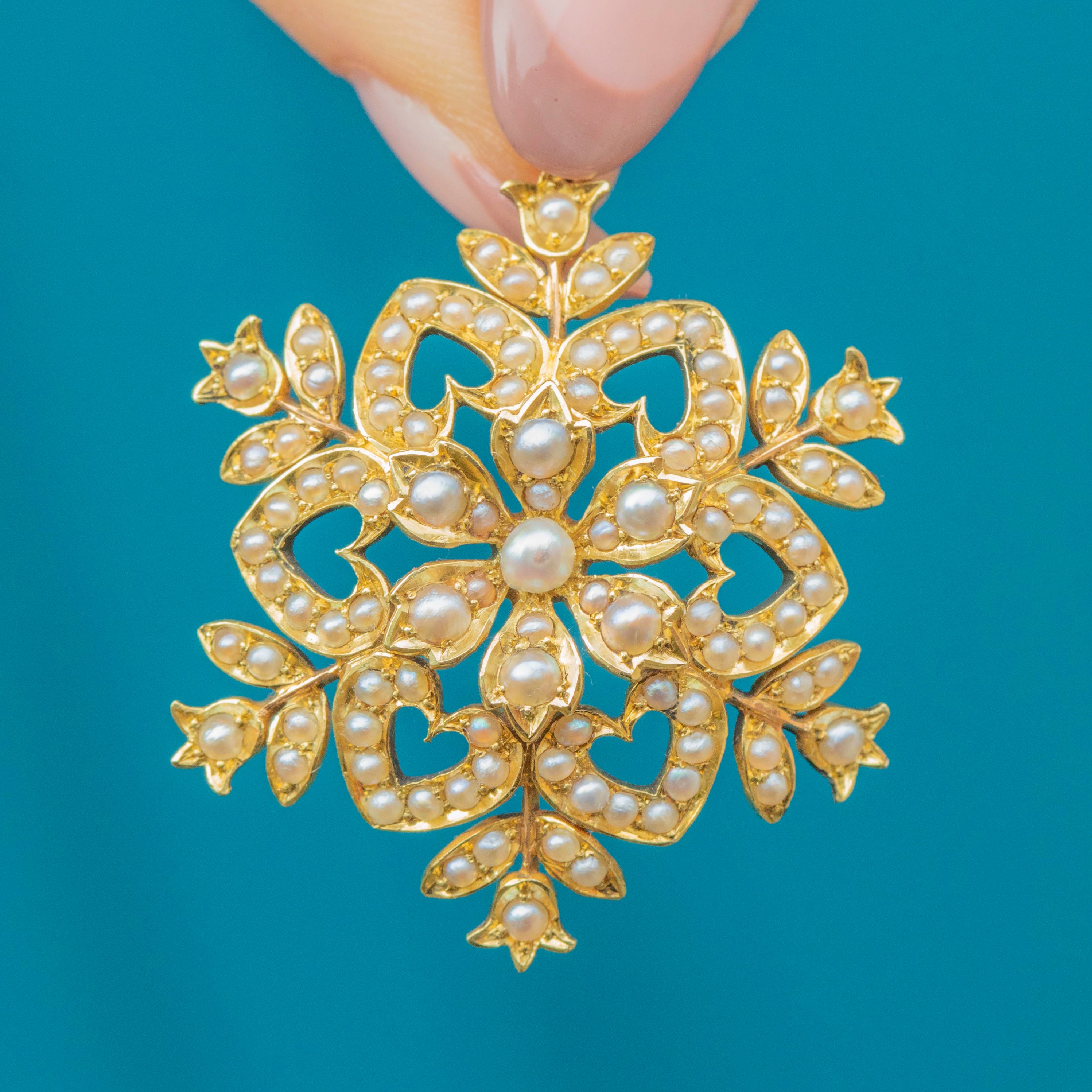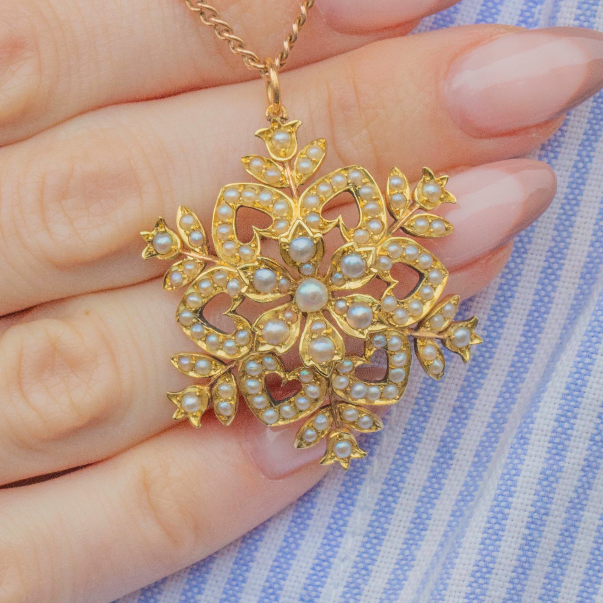 Antique 15ct Gold Pearl Snowflake Pendant, Heart Motifs