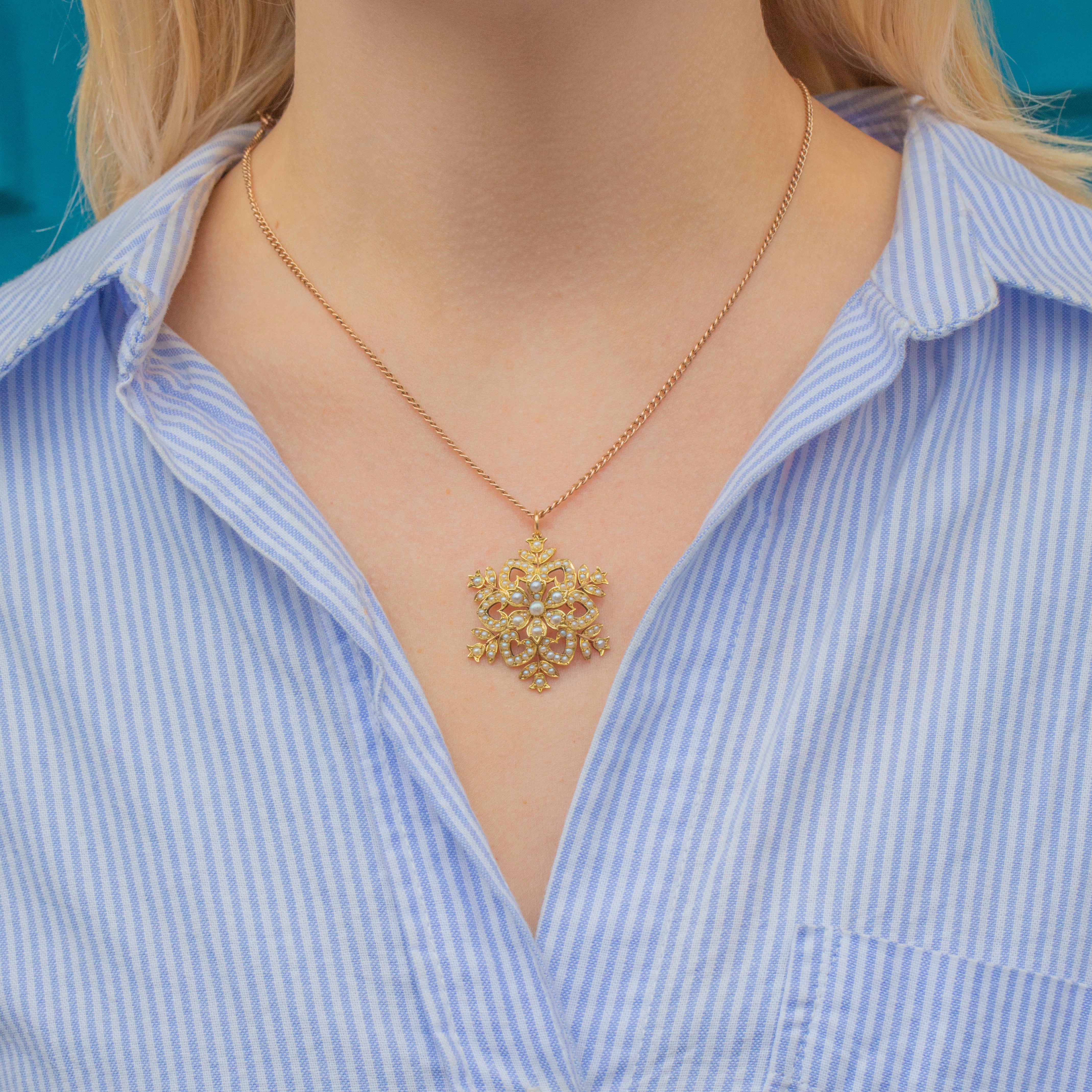 If you have a penchant for outstanding pieces of Victorian jewellery, this antique 15ct Gold Pearl snowflake pendant is a must-have addition to your collection! Exquisitely crafted from rare 15ct Gold and encrusted with shimmering Pearls, this Victorian pendant exudes feminity.