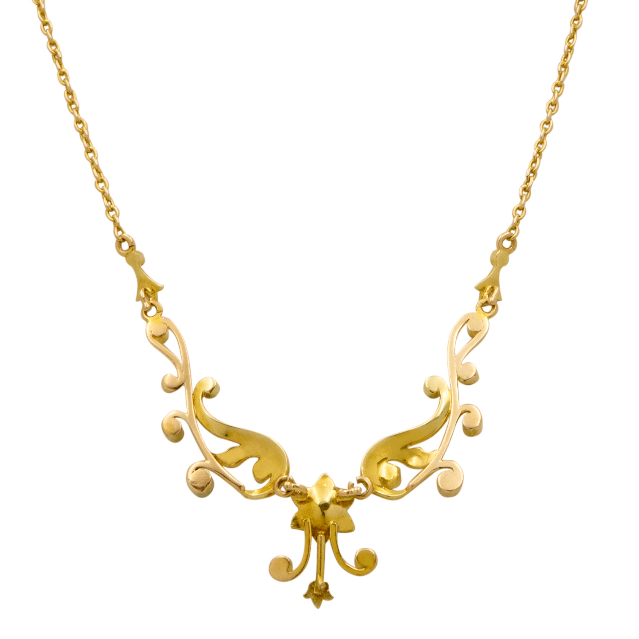 Crafted entirely from honey-hued 15ct Gold, her opulent charm radiates as she adorns your neck. At the perfect length of 16", she sits effortlessly along your collarbone and looks oh-so-flattering on; we can't get enough of this beauty and all that she has to offer, she will certainly make a fine addition to your antique jewellery collection!