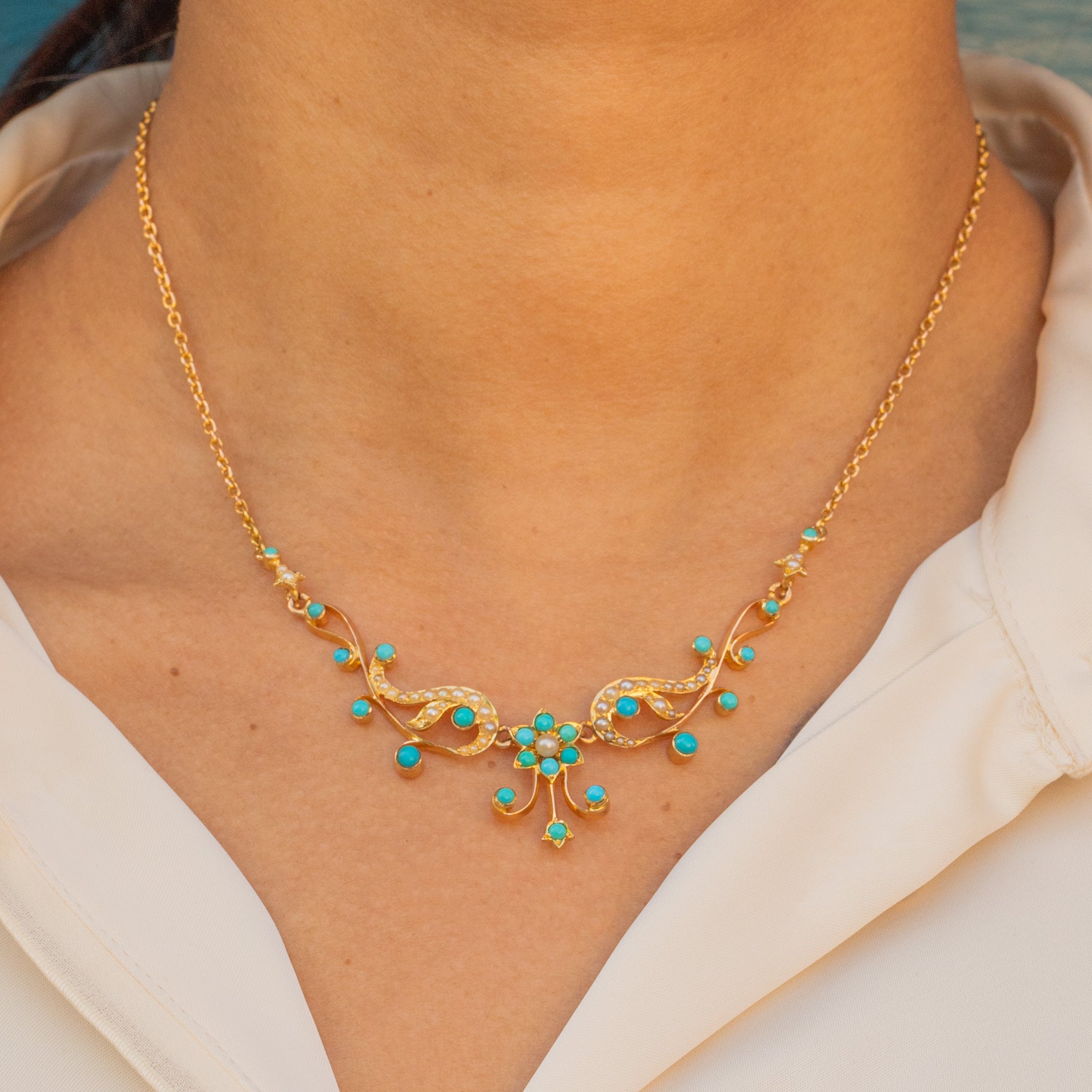 Antique 15ct Gold Turquoise Pearl Flower Necklace