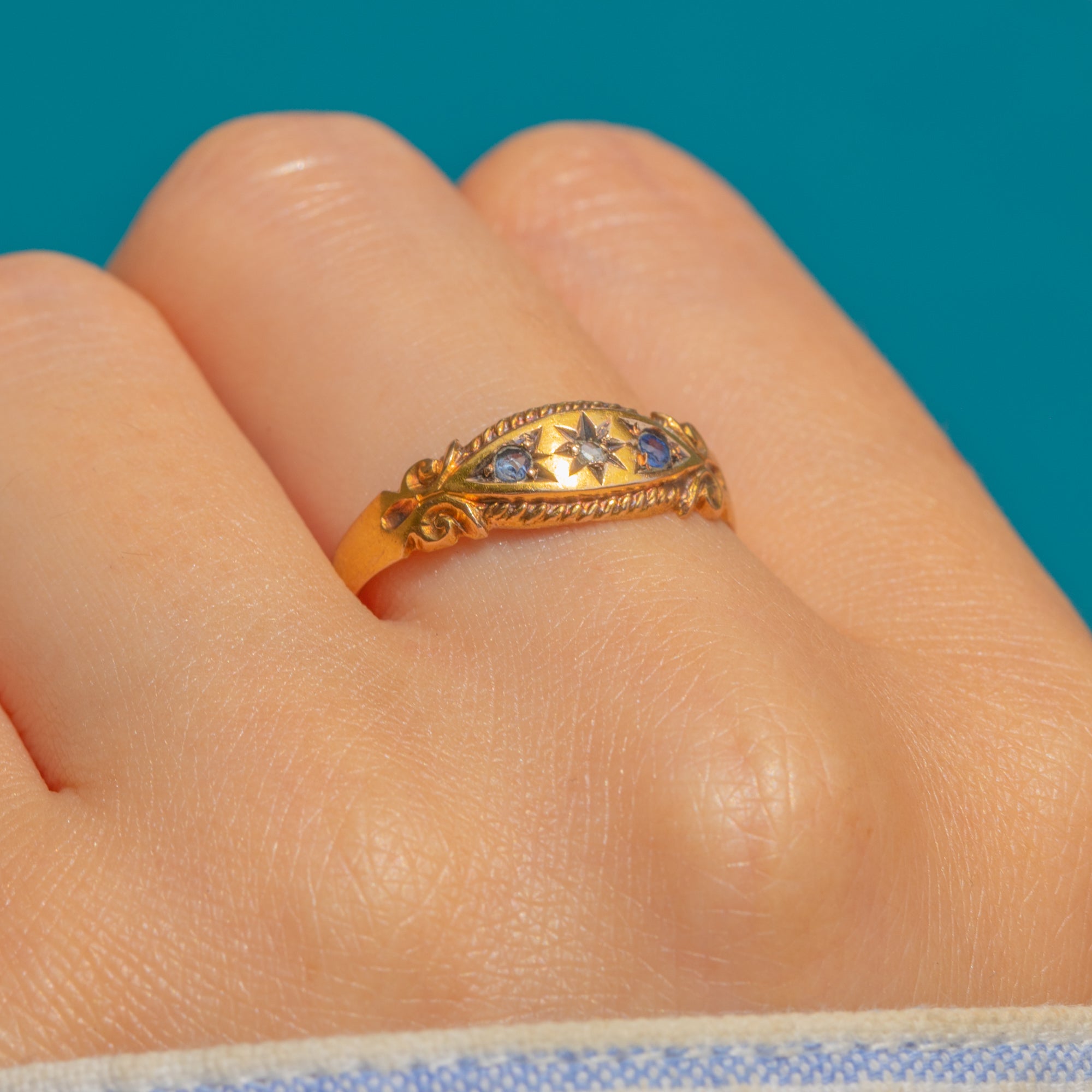 In her centre sits a scintillating Diamond flanked by Sapphires, each gemstone gleaming with a gorgeous radiance as they catch the light. These Victorian gemstones sit within bold settings, giving this antique ring a decadent charm.