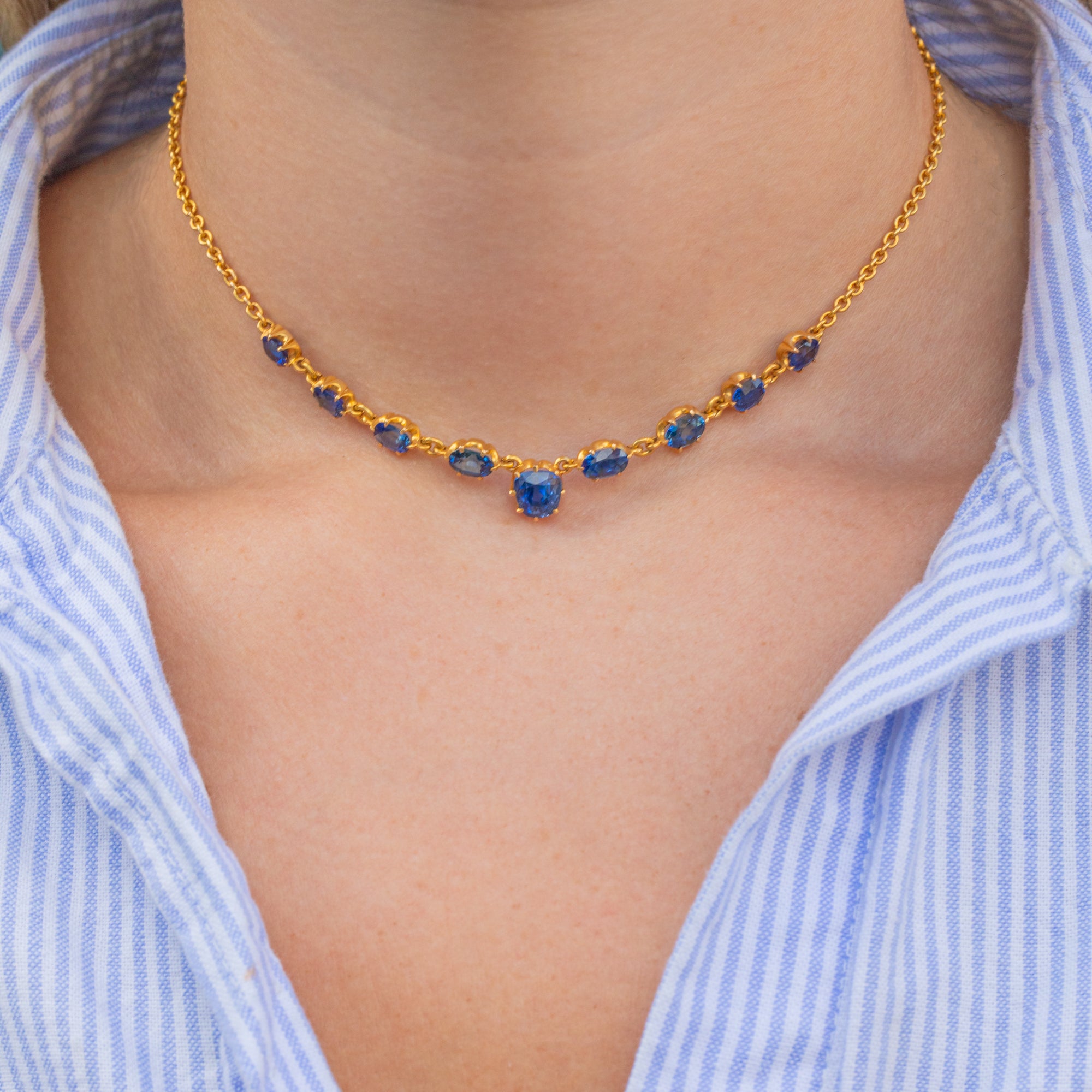 To enhance the vivid blue hues that dance between the facets of her natural Sapphires, she is bound together by highly saturated 15ct Gold, making for a striking pairing. At 13.5" long her row of Sapphire sits snug, accentuating your neckline effortlessly, but you are welcome to get in touch to discuss lengthening her to suit your personal needs!