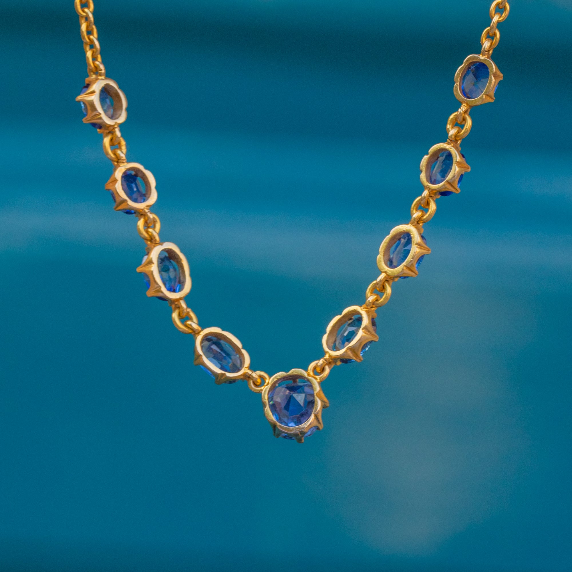 Discover the timeless elegance of this exquisite antique 15ct Gold Sapphire necklace. This stunning Victorian necklace is a testament to the fine craftsmanship of a bygone era, showcasing 7.20ct's of beautifully hand-cut natural Sapphires, flaunting electric blue hues.