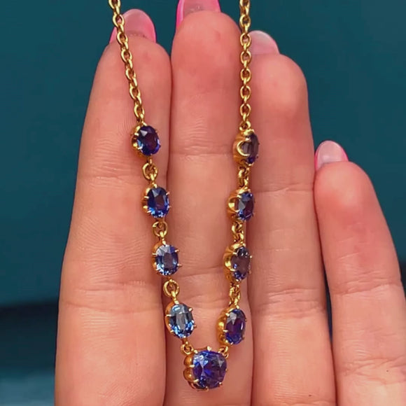 VERY GOOD-EXCELLENT. This antique 15ct Gold Sapphire necklace is in very good to excellent condition! Each Sapphire is secure and the vivid blue is harmonious throughout. There are some subtle surface marks to the central stone, however, this can only be seen through a jeweller's loupe.  The 15ct Gold links are uniform and have a rich saturation throughout. With a fully functioning bolt-ring, this Victorian necklace can be enjoyed with confidence!
