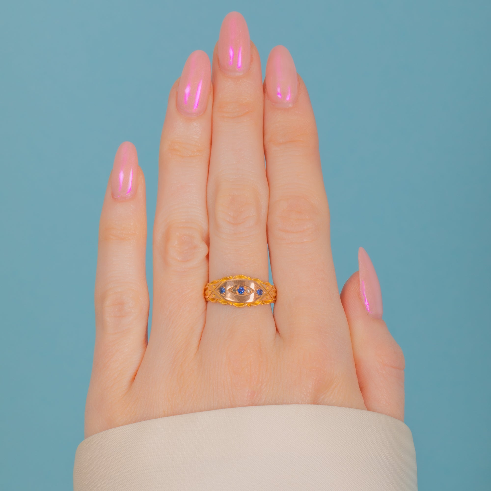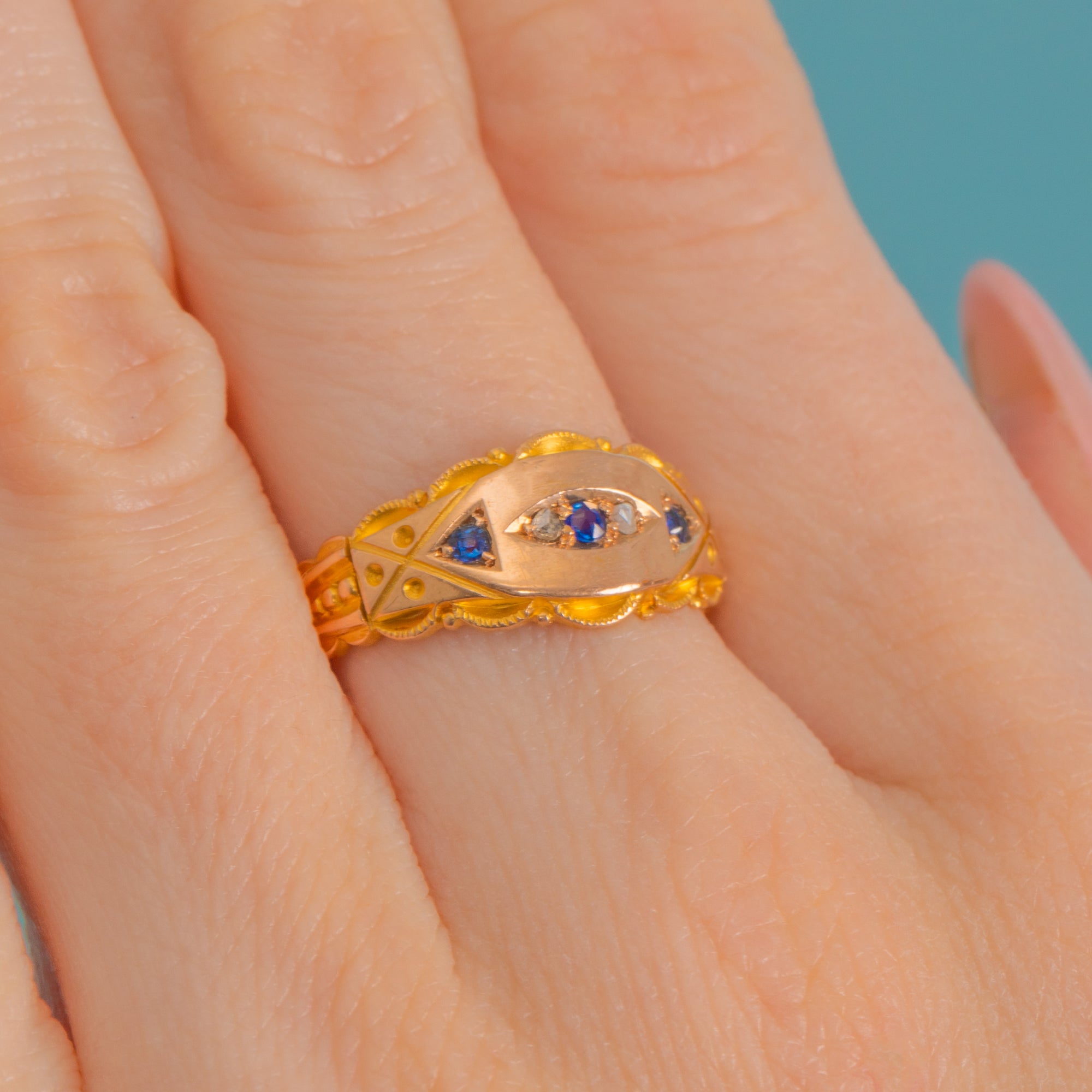Antique 15ct Gold Sapphire Rose-Cut Diamond Gypsy Ring, c.1902