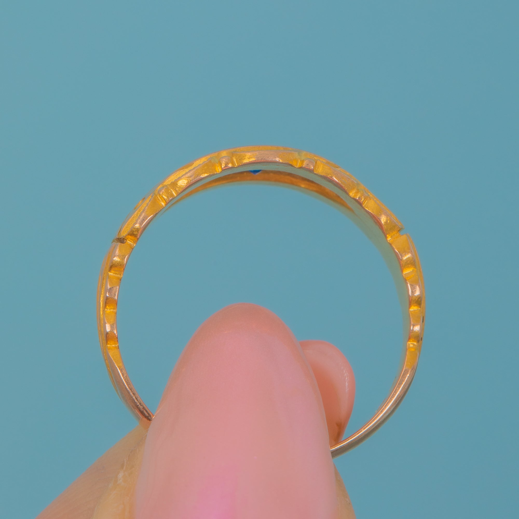 Our hearts have been captured by this stunning antique 15ct Gold Sapphire rose-cut Diamond gypsy ring! This Edwardian beauty hosts one of our favourite gemstone combinations, Sapphire and Diamond, in a classic and timeless gypsy ring style.