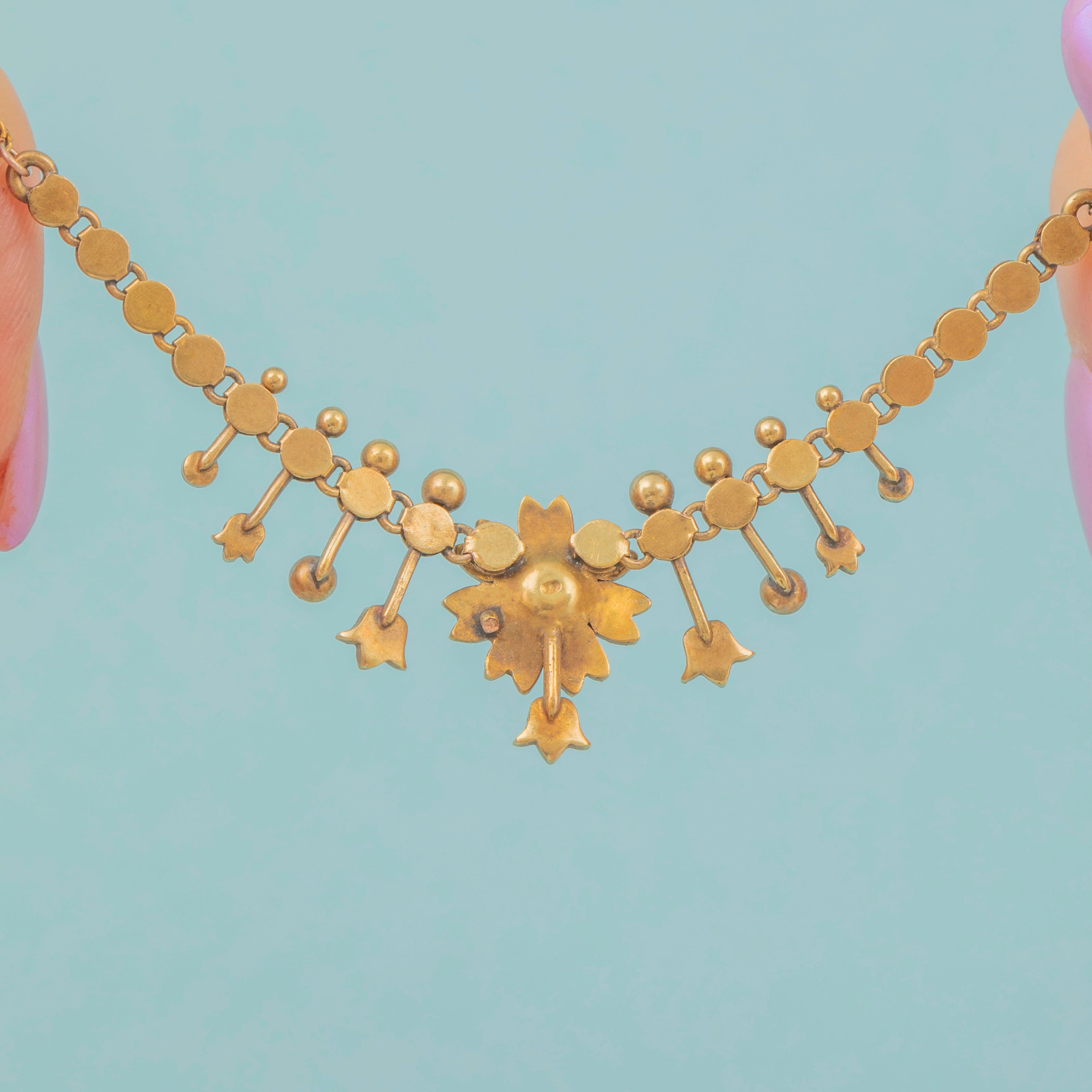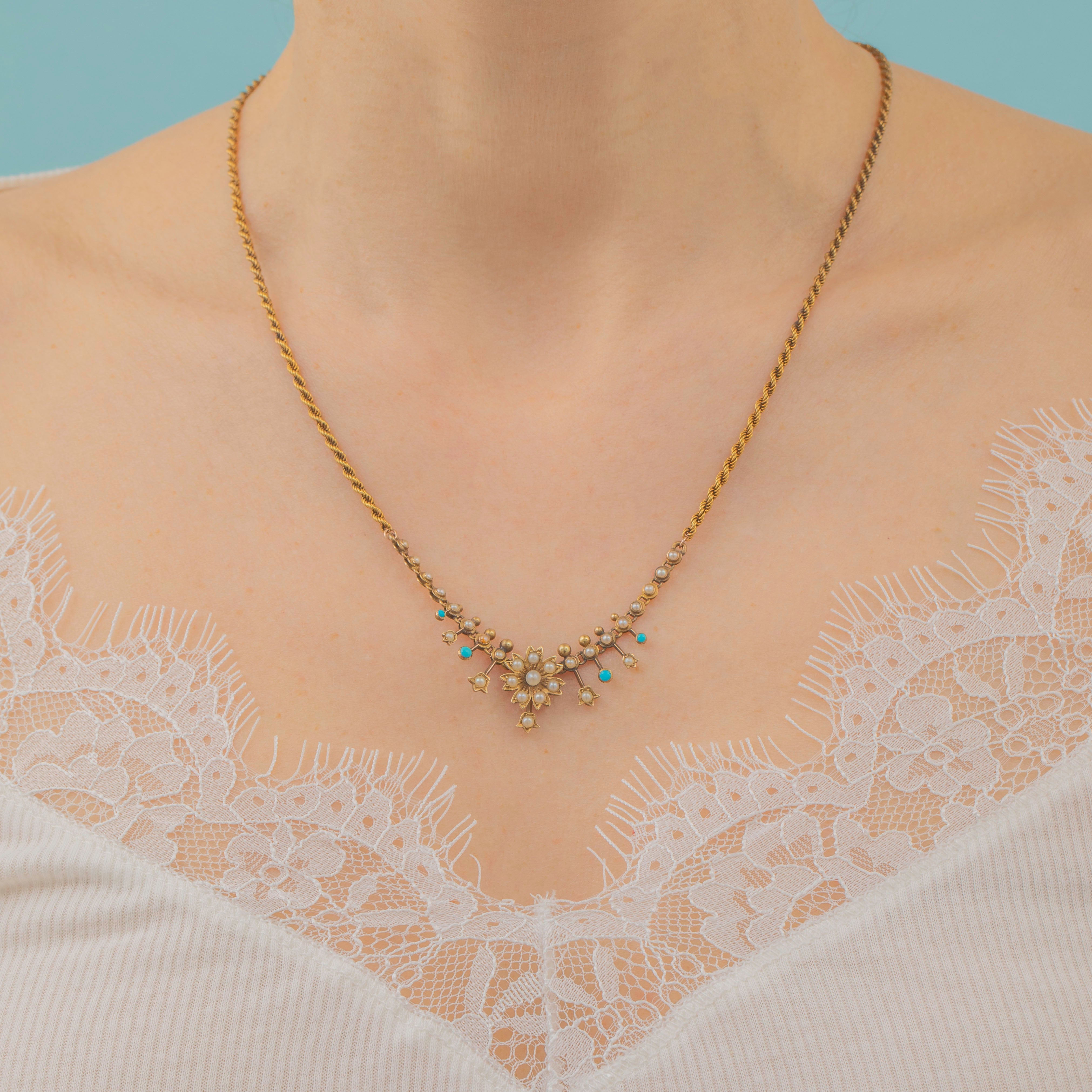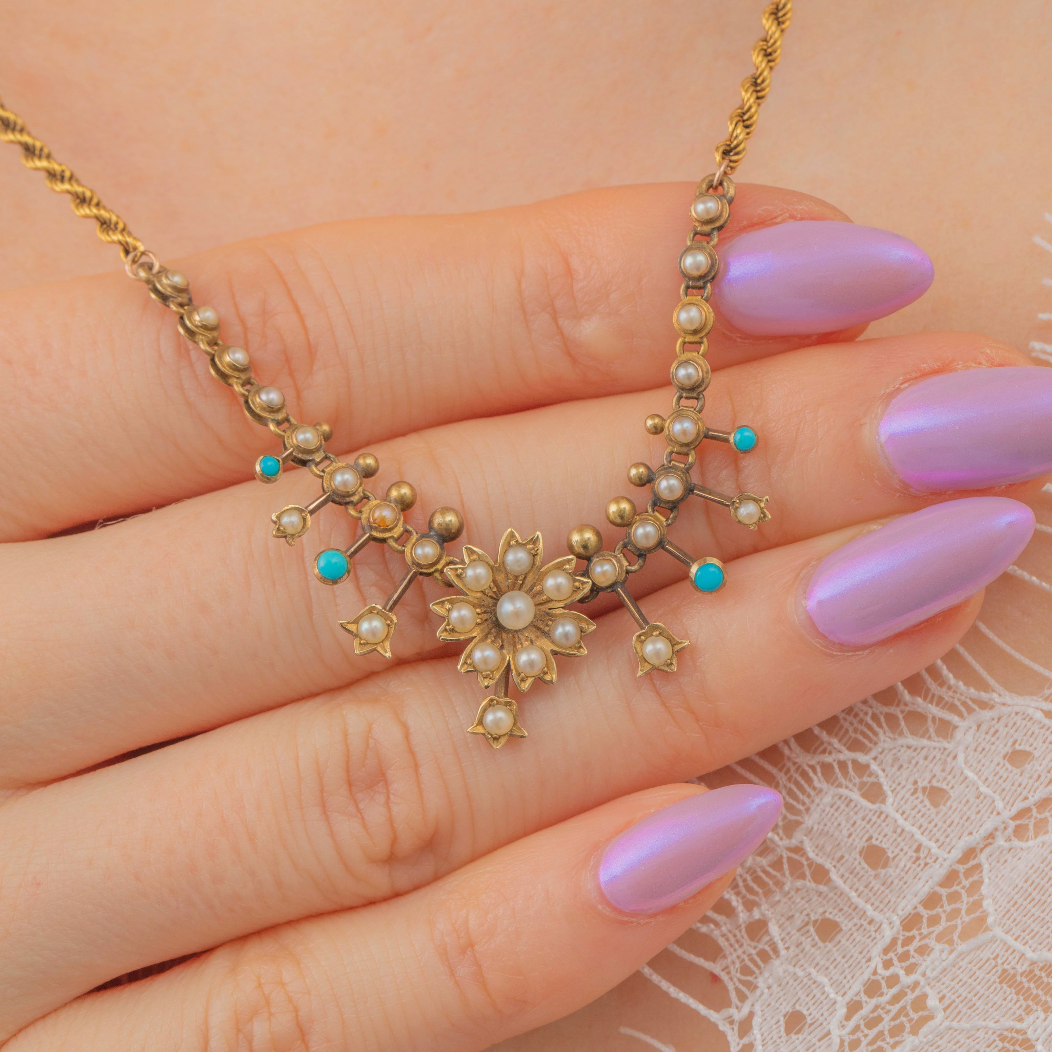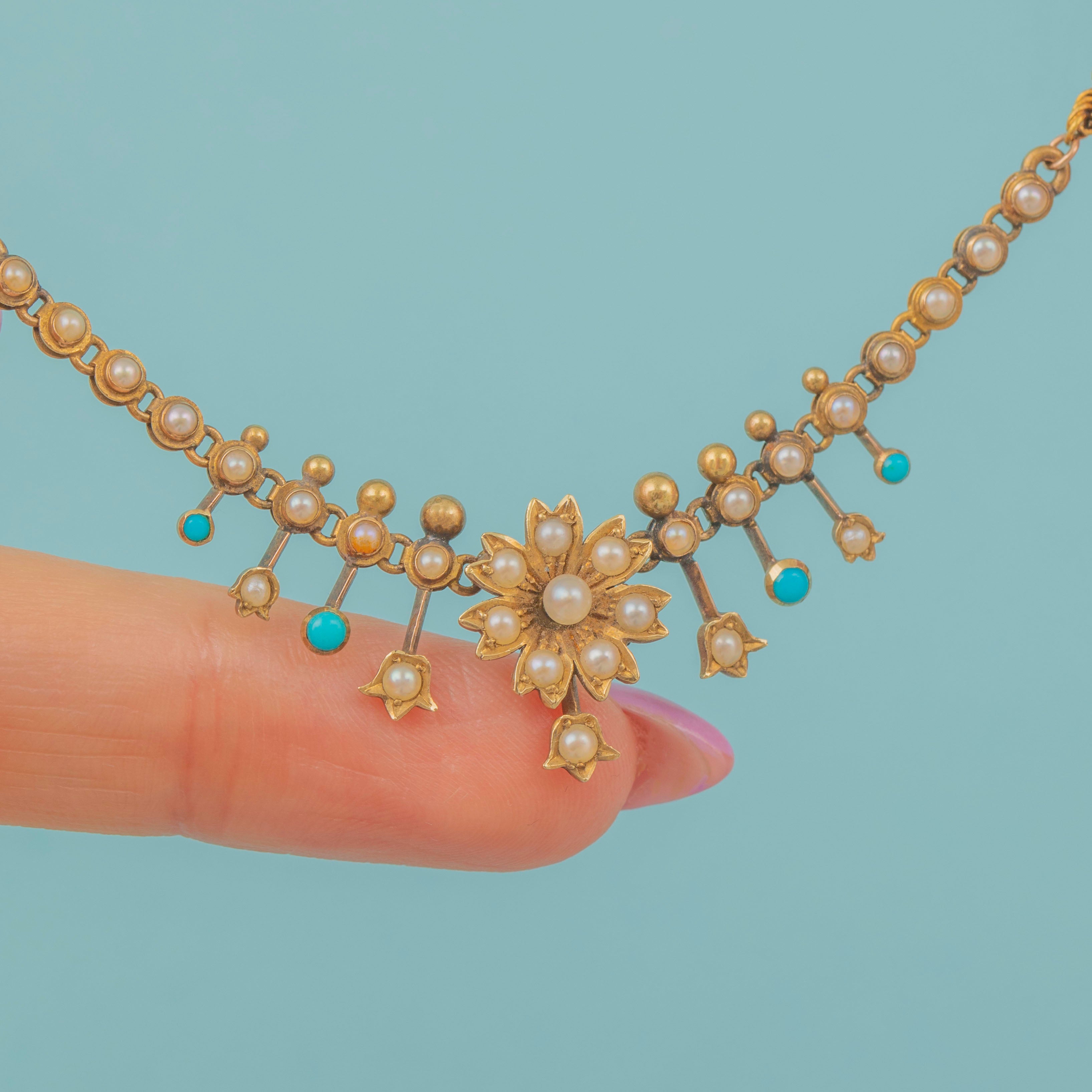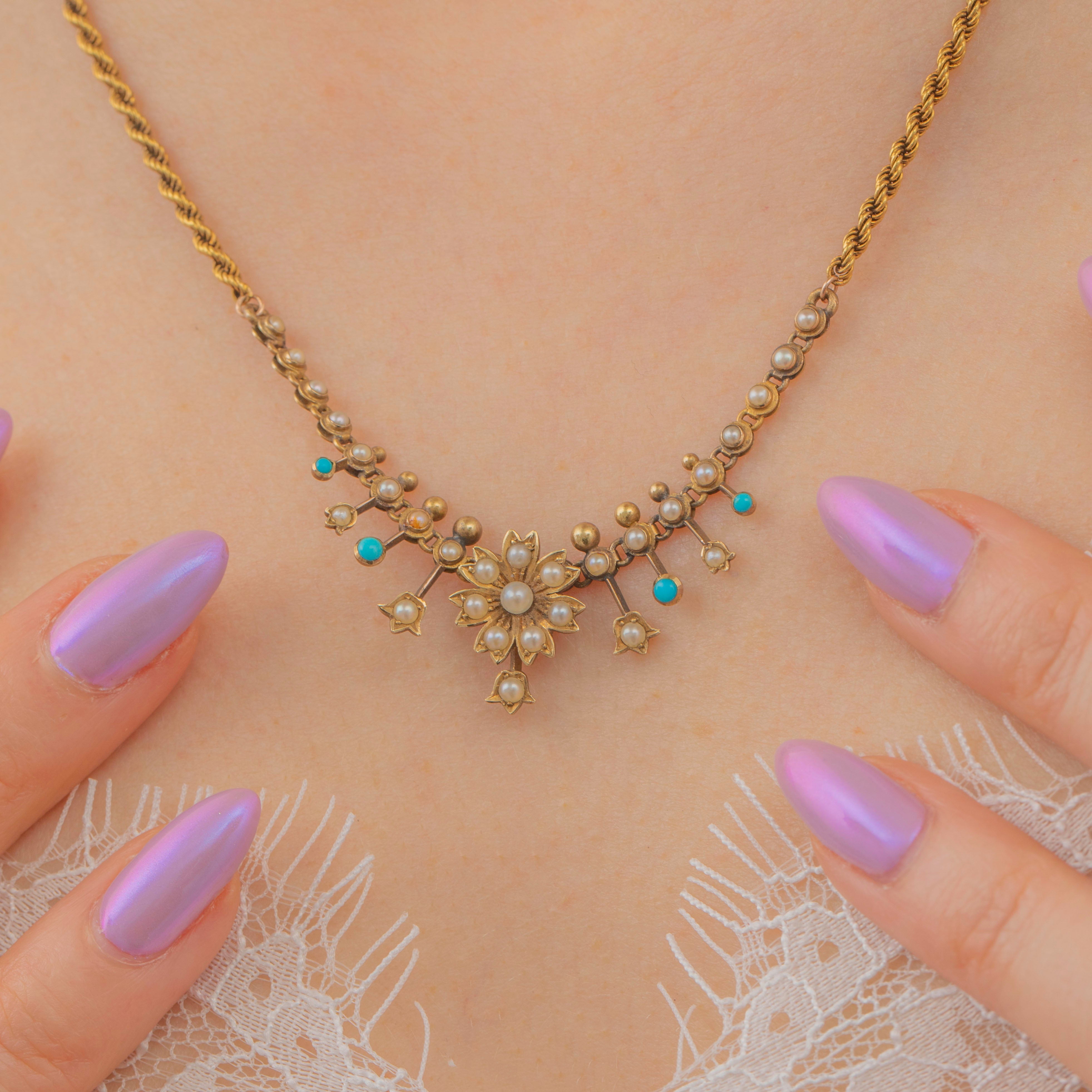 VERY GOOD. This antique 15ct Gold Turquoise Pearl floral necklace is presented in very good condition. Her Pearls and Turquoise are all present and securely set into their Gold settings, with some subtle variation within the hue of some of the Pearls. The Gold has aged well over the years, with only some mild discolouration and wear to the necklace's body. There is a residual attachment on the back of the necklace,  an indication that there was an additional part of the necklace that has since been removed. The chain has accrued a patina over the years adding a rich antique feel to the piece as a whole.