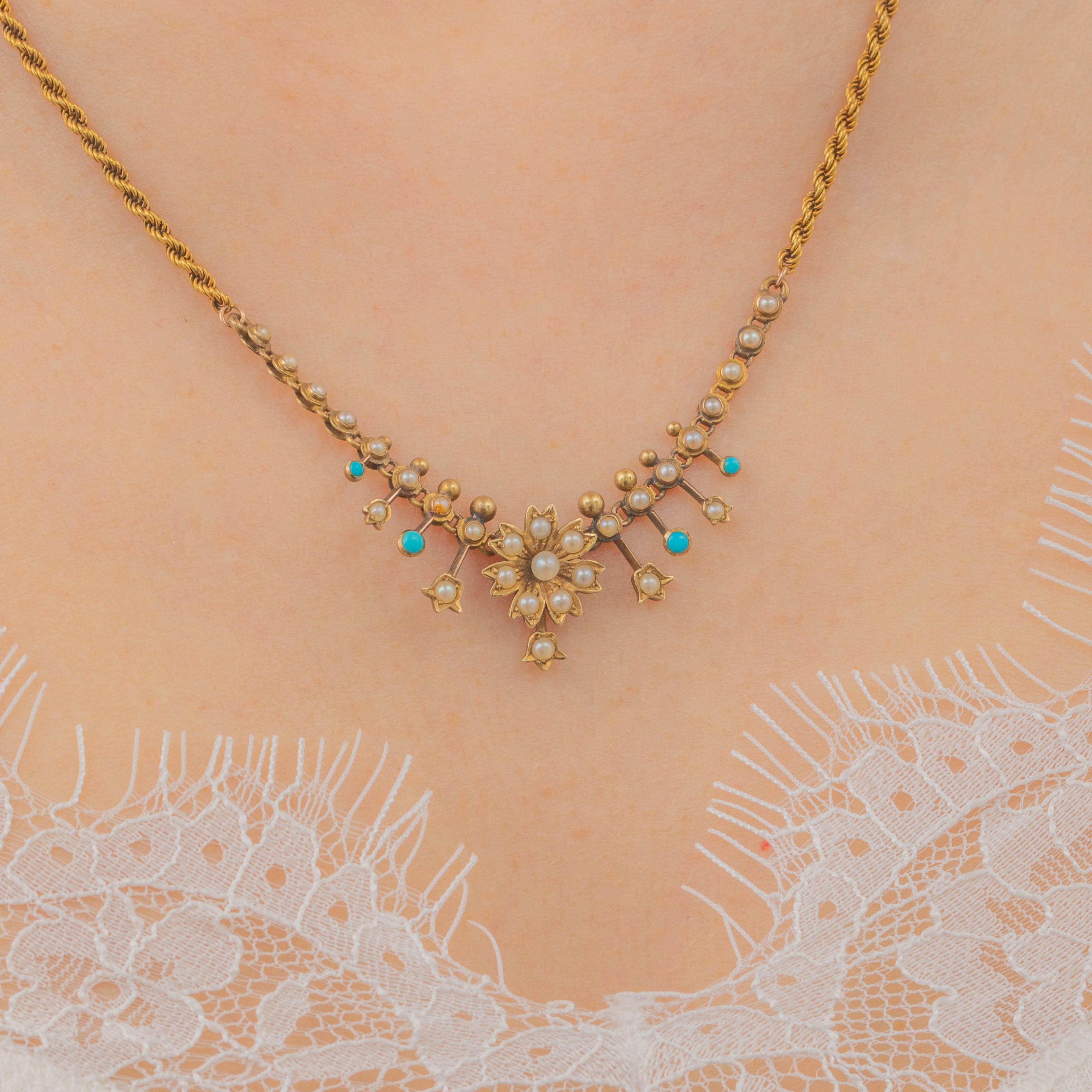 Antique 15ct Gold Turquoise Pearl Floral Necklace