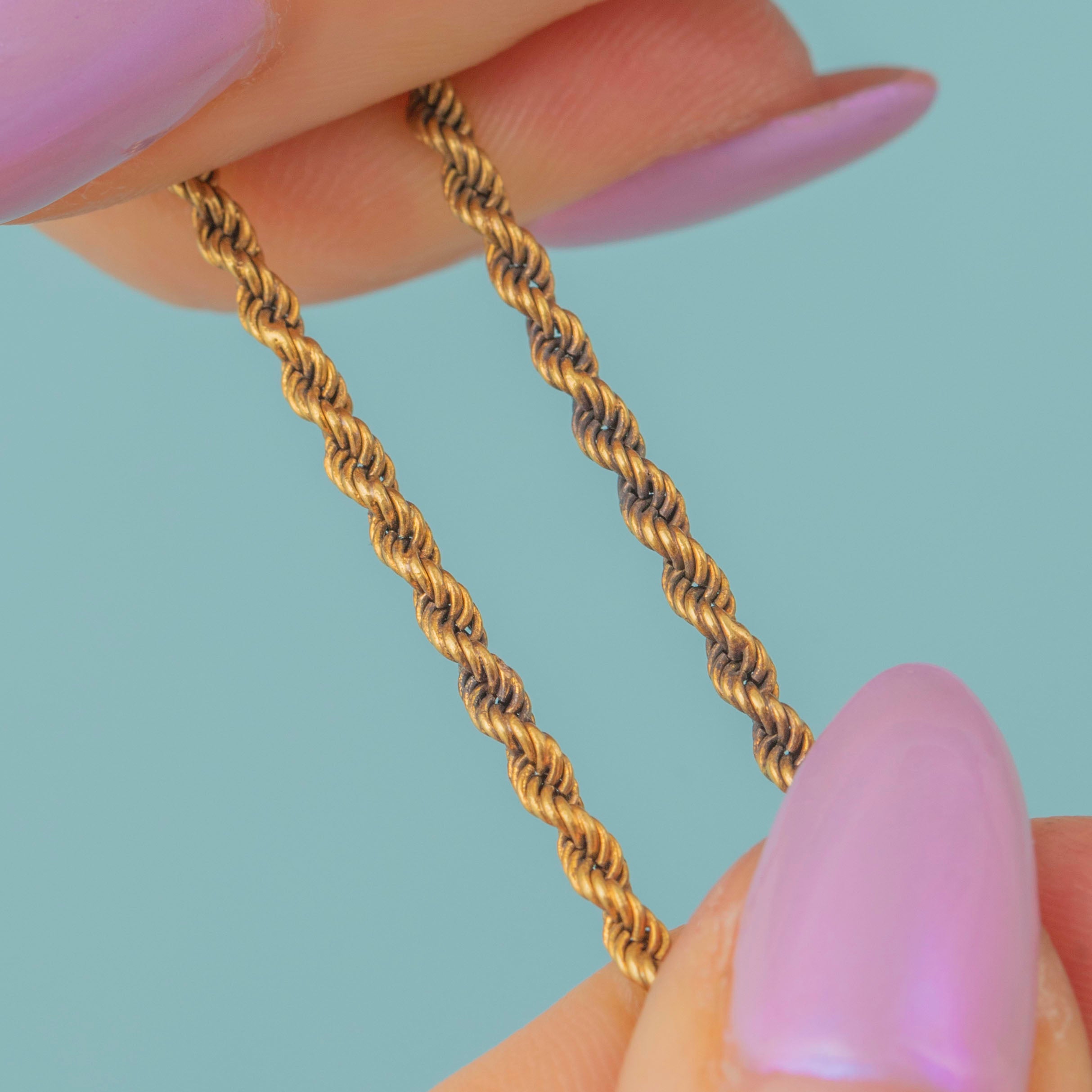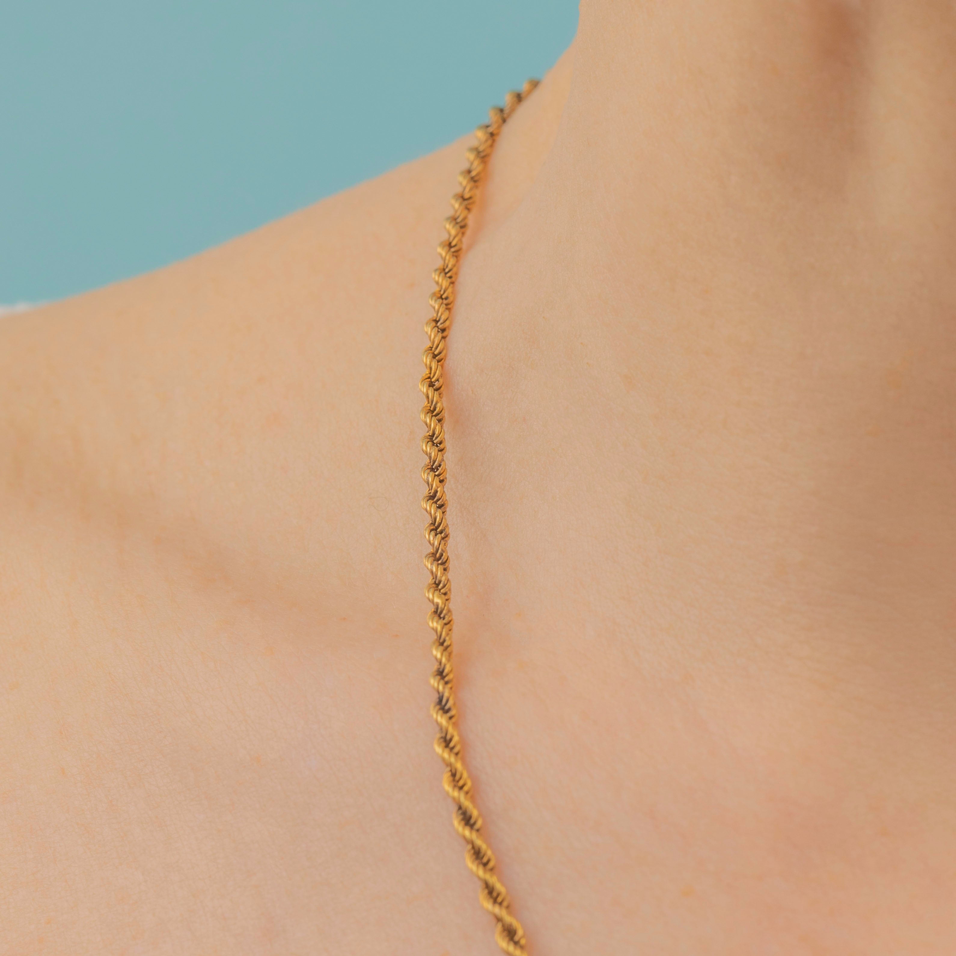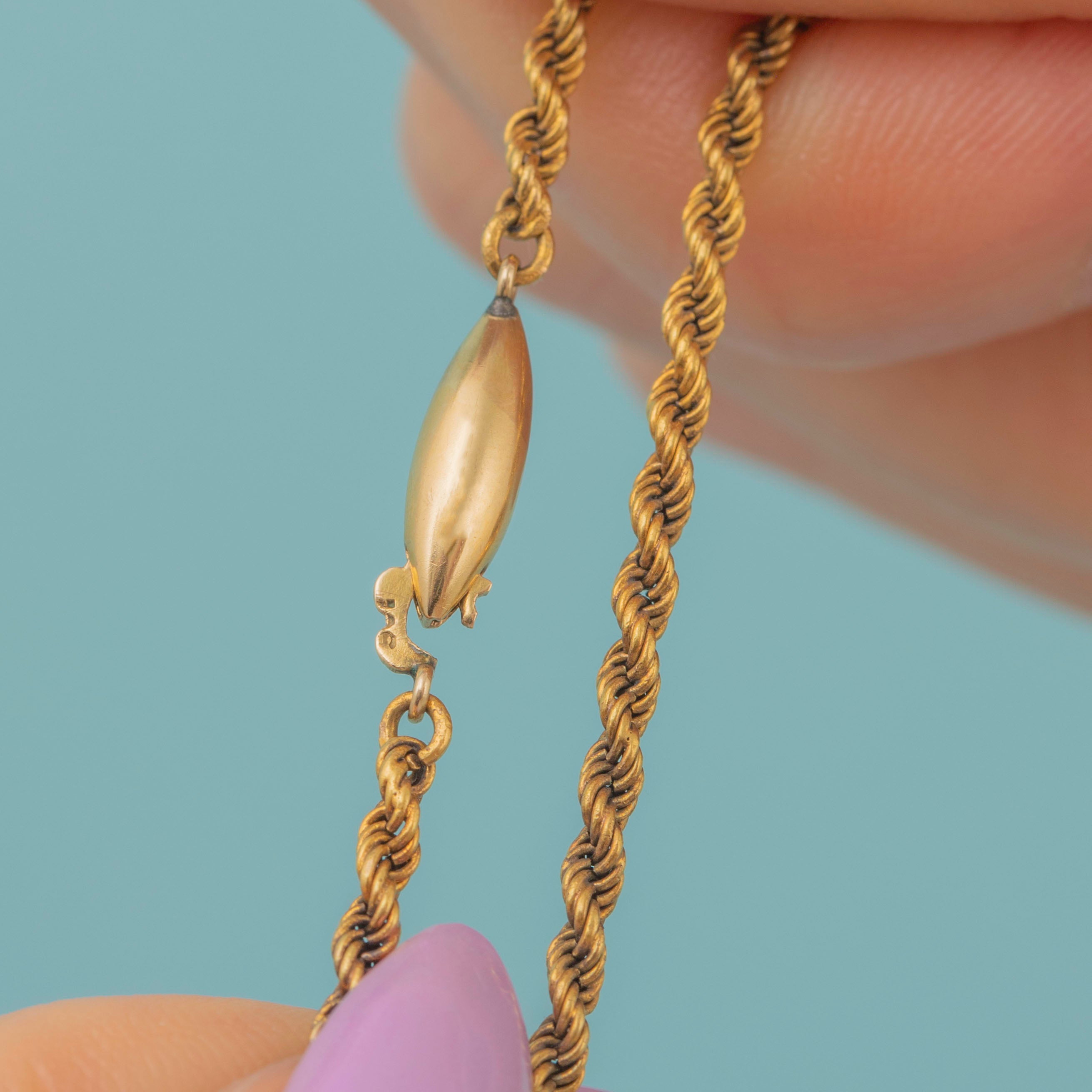 Crafted from flawless 15ct Gold, her luxurious allure shines as she grazes your neck. At the perfect length of 19 inches, this magnificent piece is held together with a decadent twisted rope chain, boasting honey-hued tightly woven links. You'll just adore the way this Victorian necklace sits against your décolletage!
