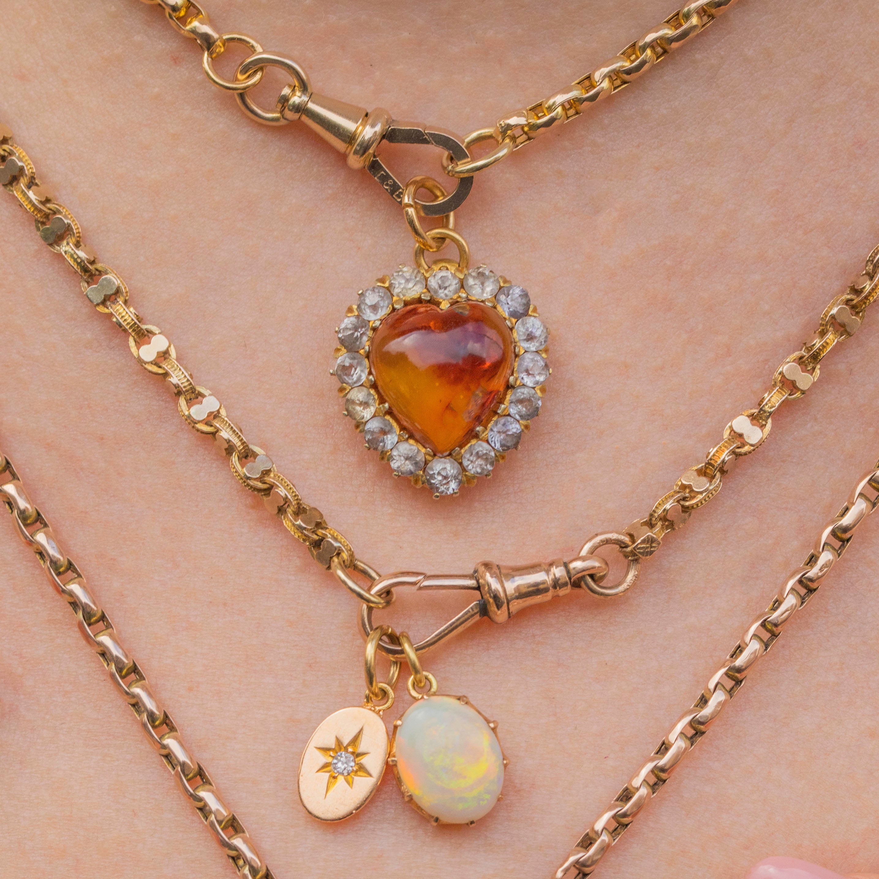 VERY GOOD. This antique 18ct Gold Amber & White Sapphire heart pendant has retained her timeless beauty, with natural inclusions in the Amber adding to her unique charm. A small chip on the Amber is present but this is subtle and doesn’t detract from her elegance. All the Sapphires are present, with only minor abrasions on one or two, but this does not impact their sparkle, complementing the warm 18ct Gold and preserving her overall allure. A timeless and graceful addition to your antique collection.