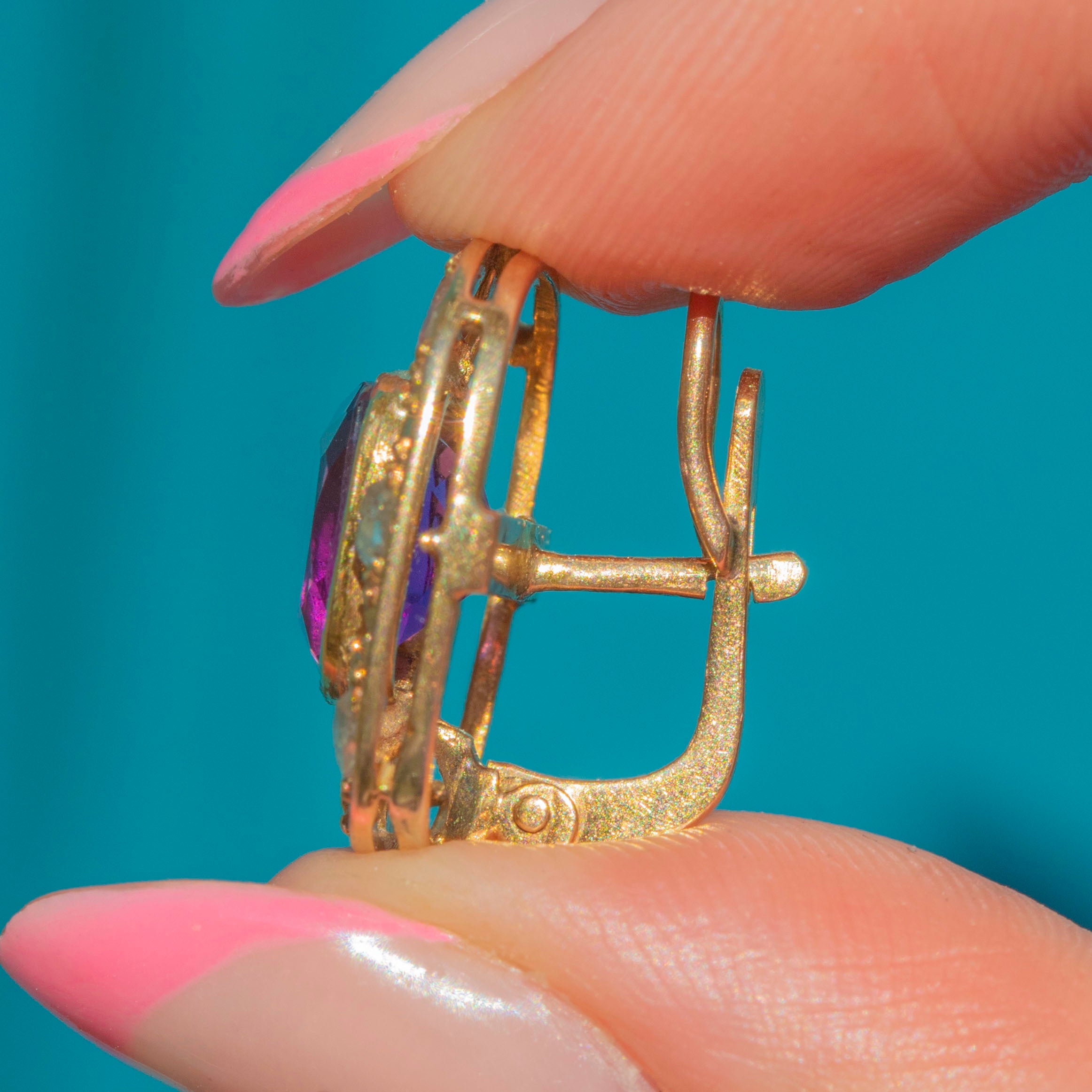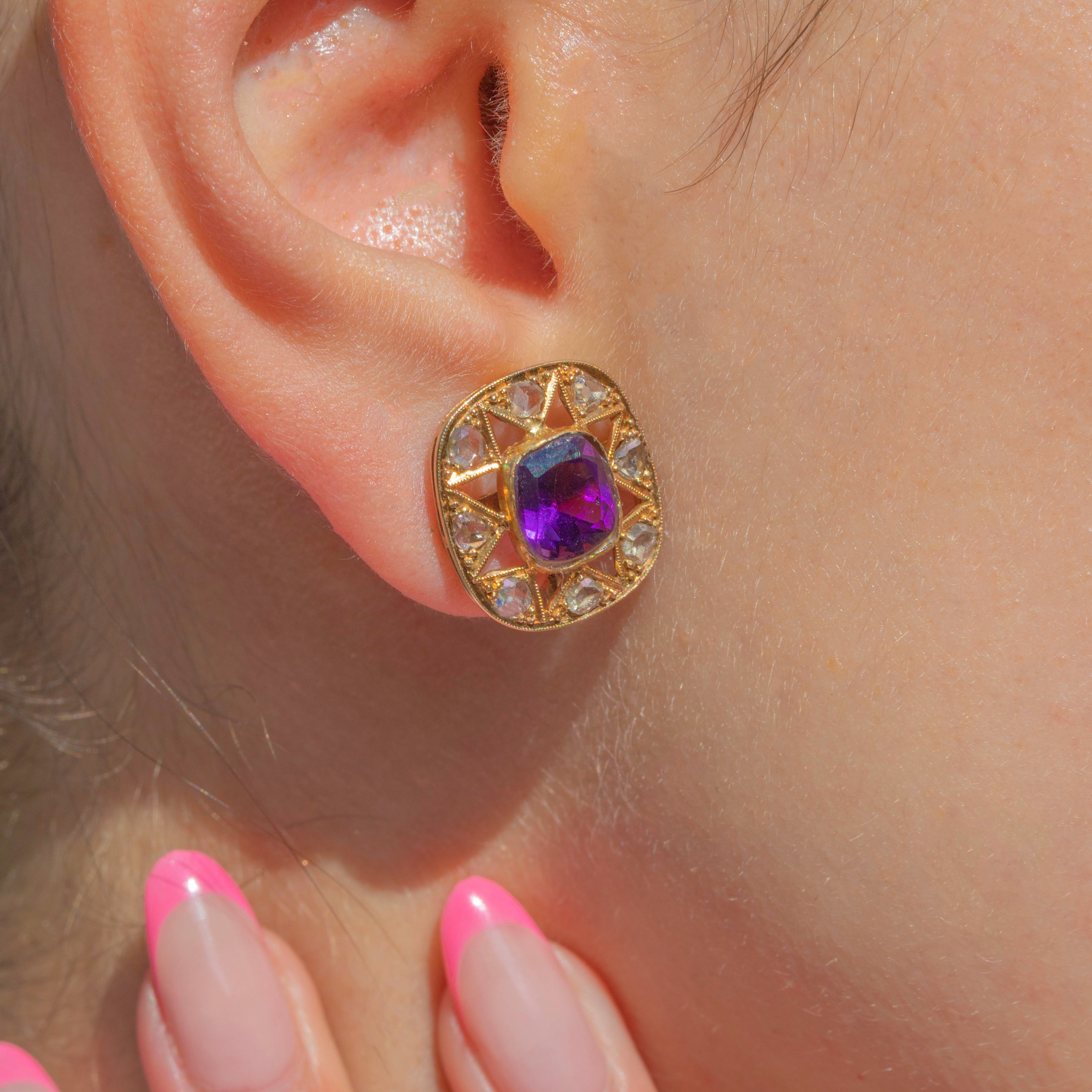 GOOD: These antique 18ct Gold Amethyst rose-cut Diamond star cluster earrings are in good condition. The Amethyst and Diamonds sparkle beautifully and while one or two of them do have some minor chips to the surface, they still captivate all who set their eyes on them. The openwork details remain stunning, providing secure settings for her remarkable gems. The back of one of the earrings shows signs of being repaired in the past, meaning she is slightly stiff to open and close and must be treated with gentle, loving care.