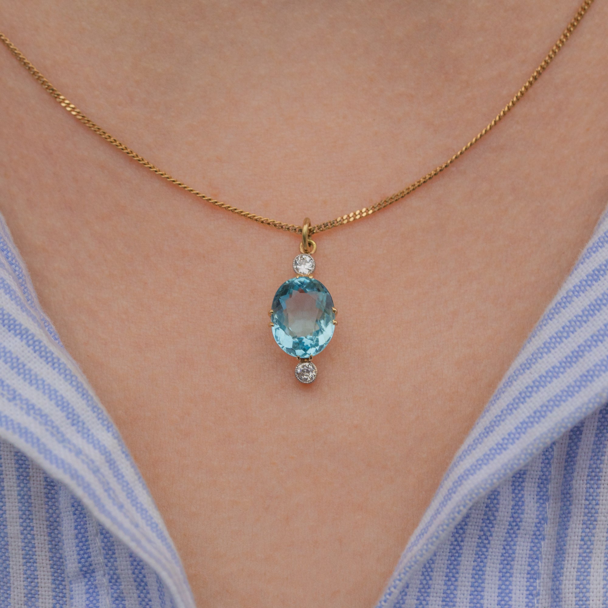 This antique 18ct Gold Aquamarine Diamond pendant has stolen our hearts! A quintessentially elegant and timeless Edwardian pendant, this piece boasts a 5.10ct glacial Aquamarine at the centre, accented by two scintillating Diamonds set in Platinum, akin to frozen droplets of ice.