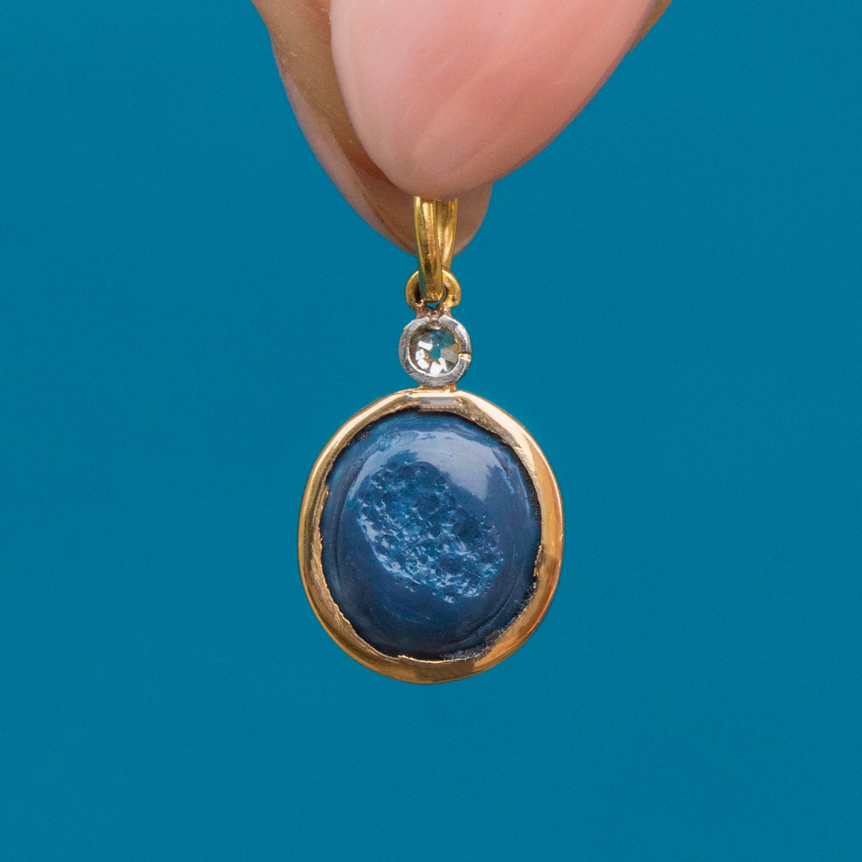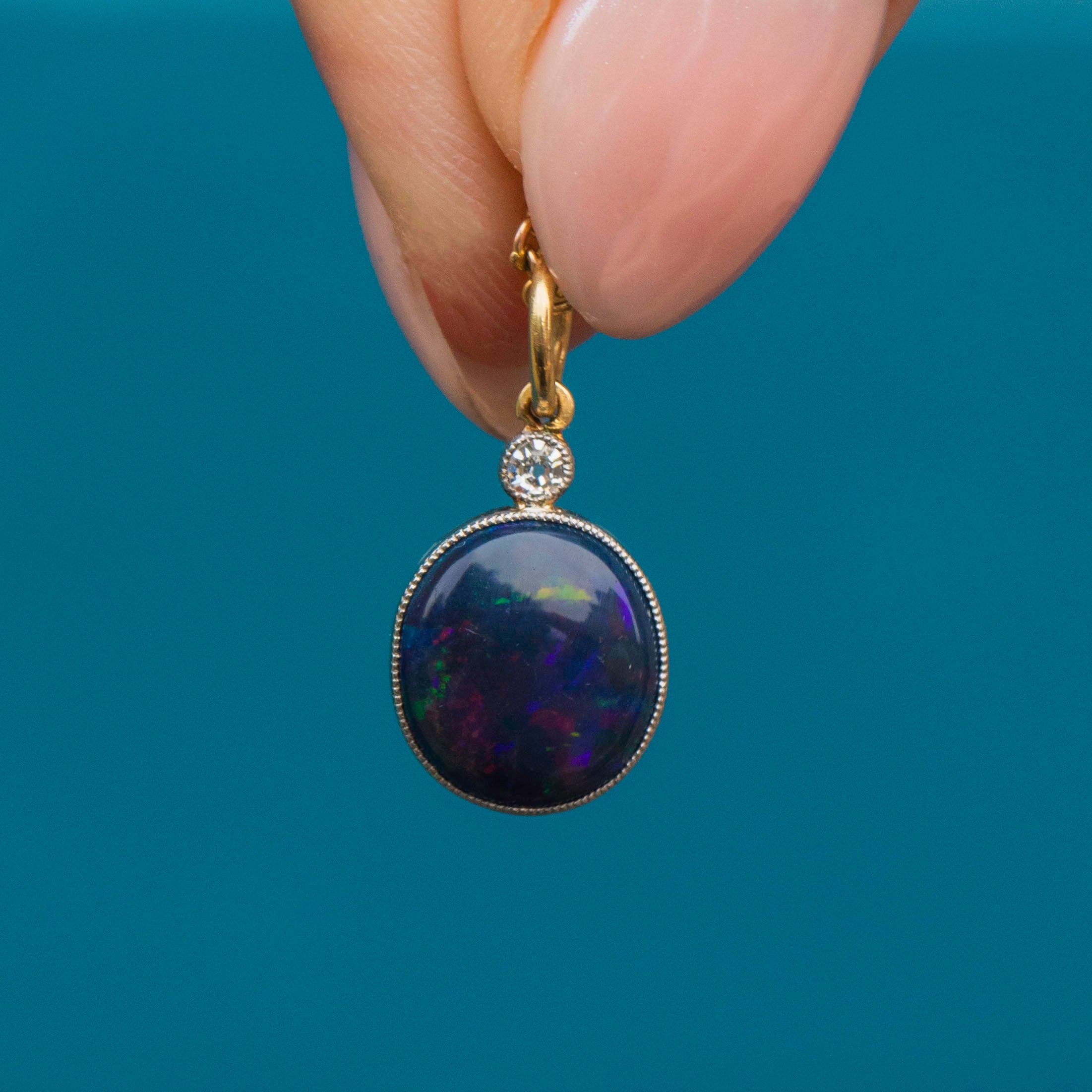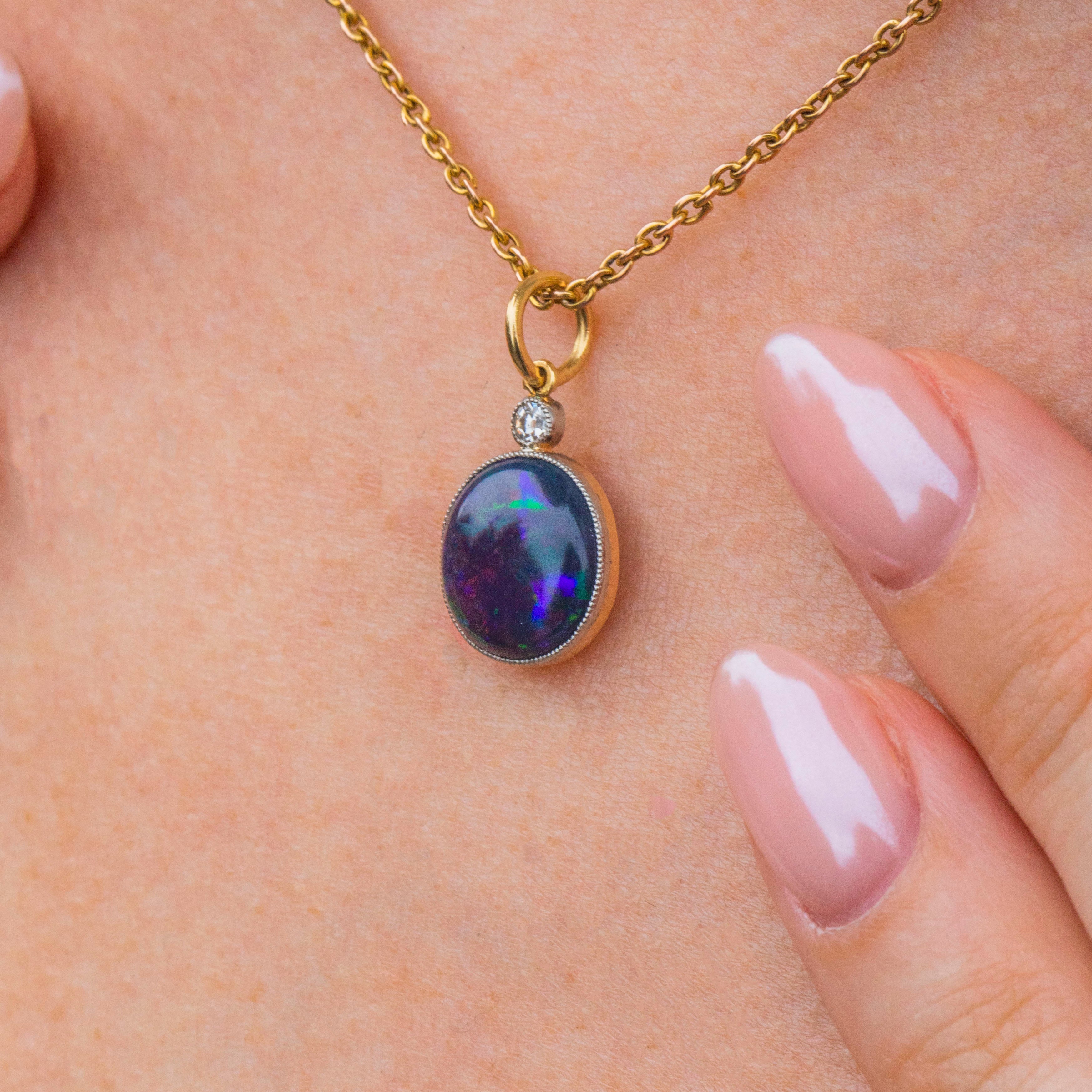 EXCELLENT. This antique 18ct Gold Black Opal Diamond charm is in excellent condition. Her glorious Opal is set securely in her bezel, with no chips or scuffs to her surface. On the underside of the Opal is a natural and uneven layer of 'potch', which contributes to her vivid dark colour, making her even more sough-after. Her glittering Diamond is also set securely with no fleabites visible. Simply add a chain and wear with pride!