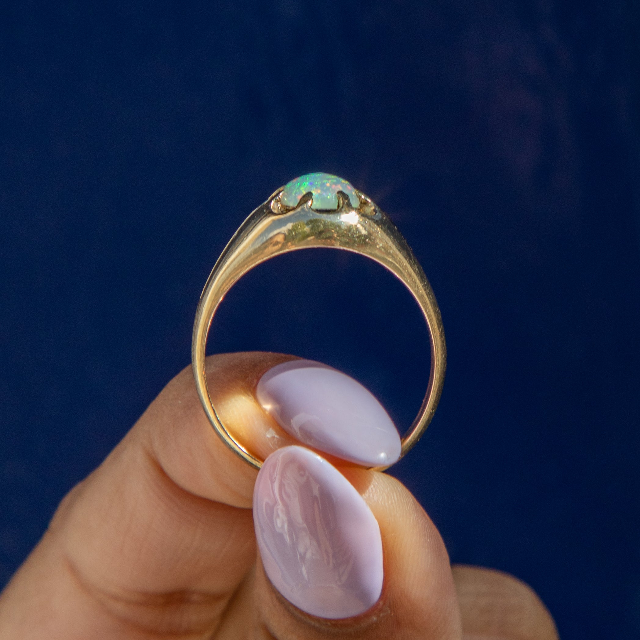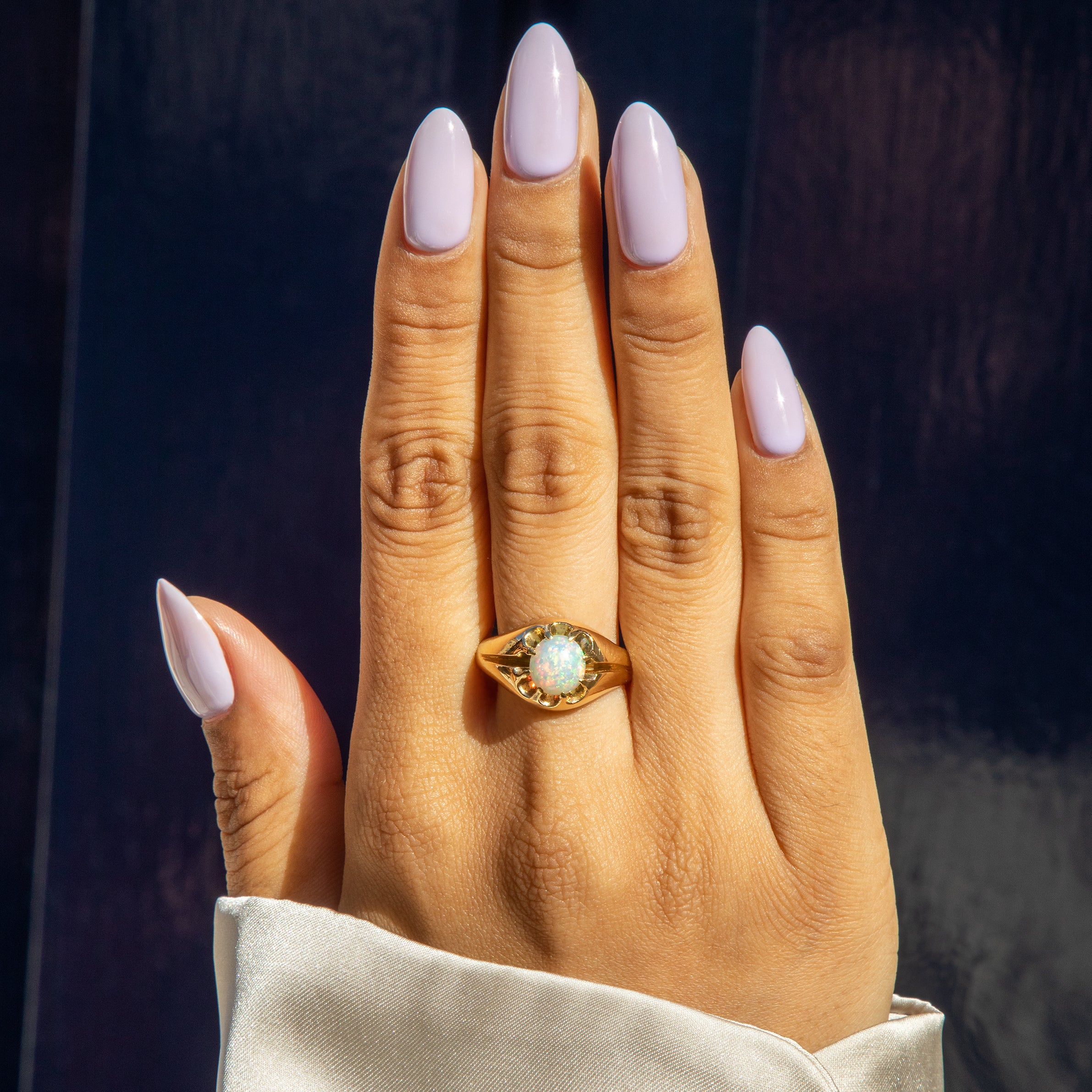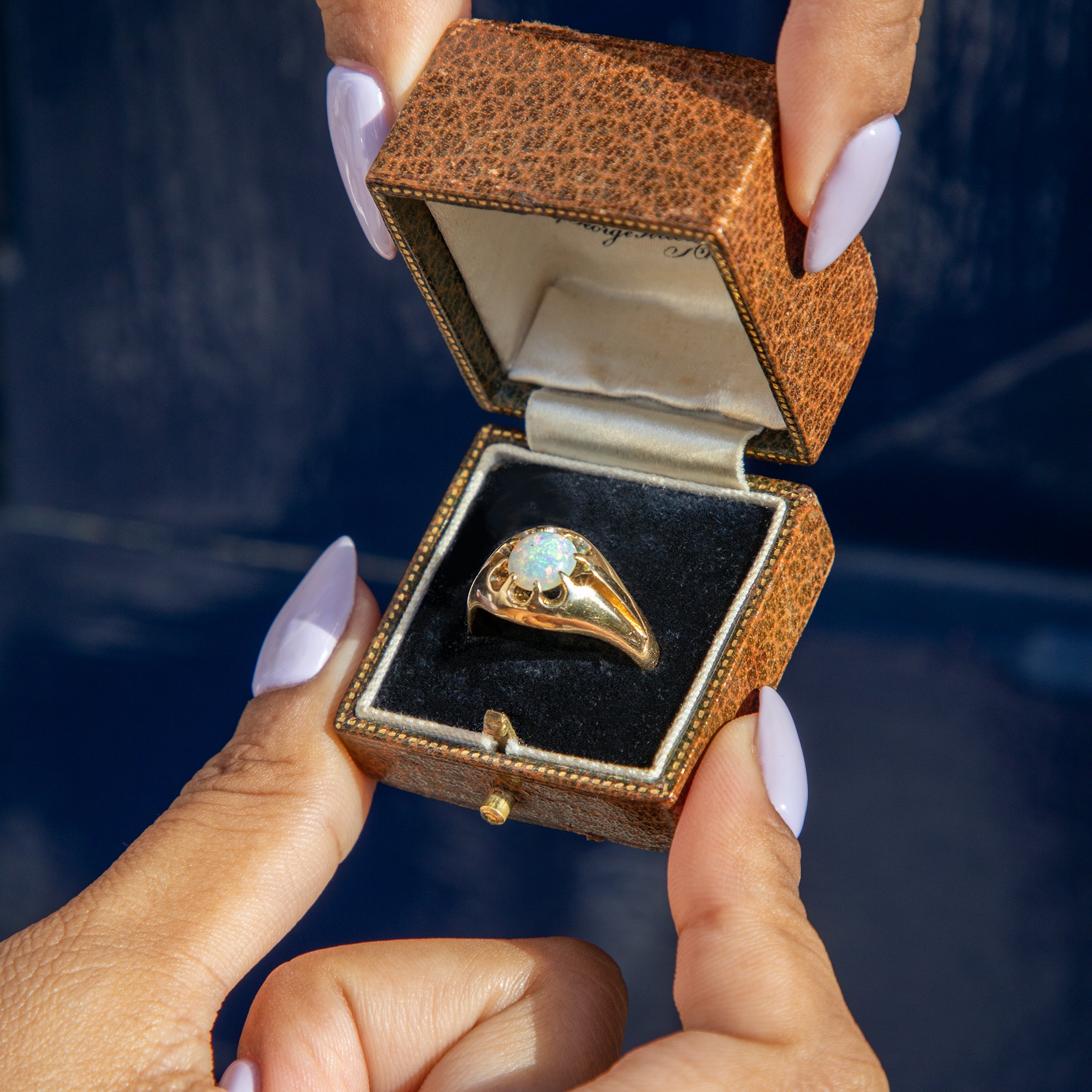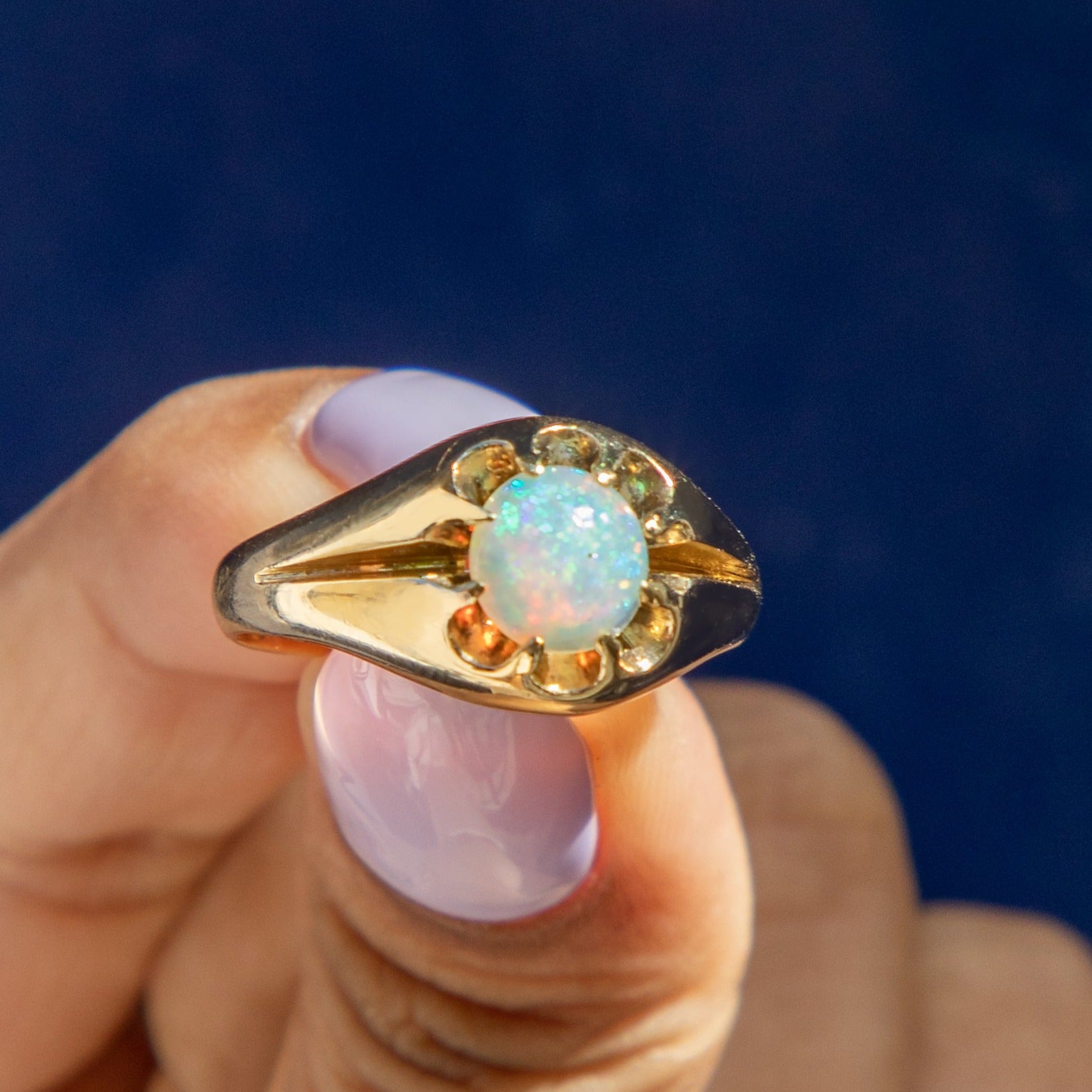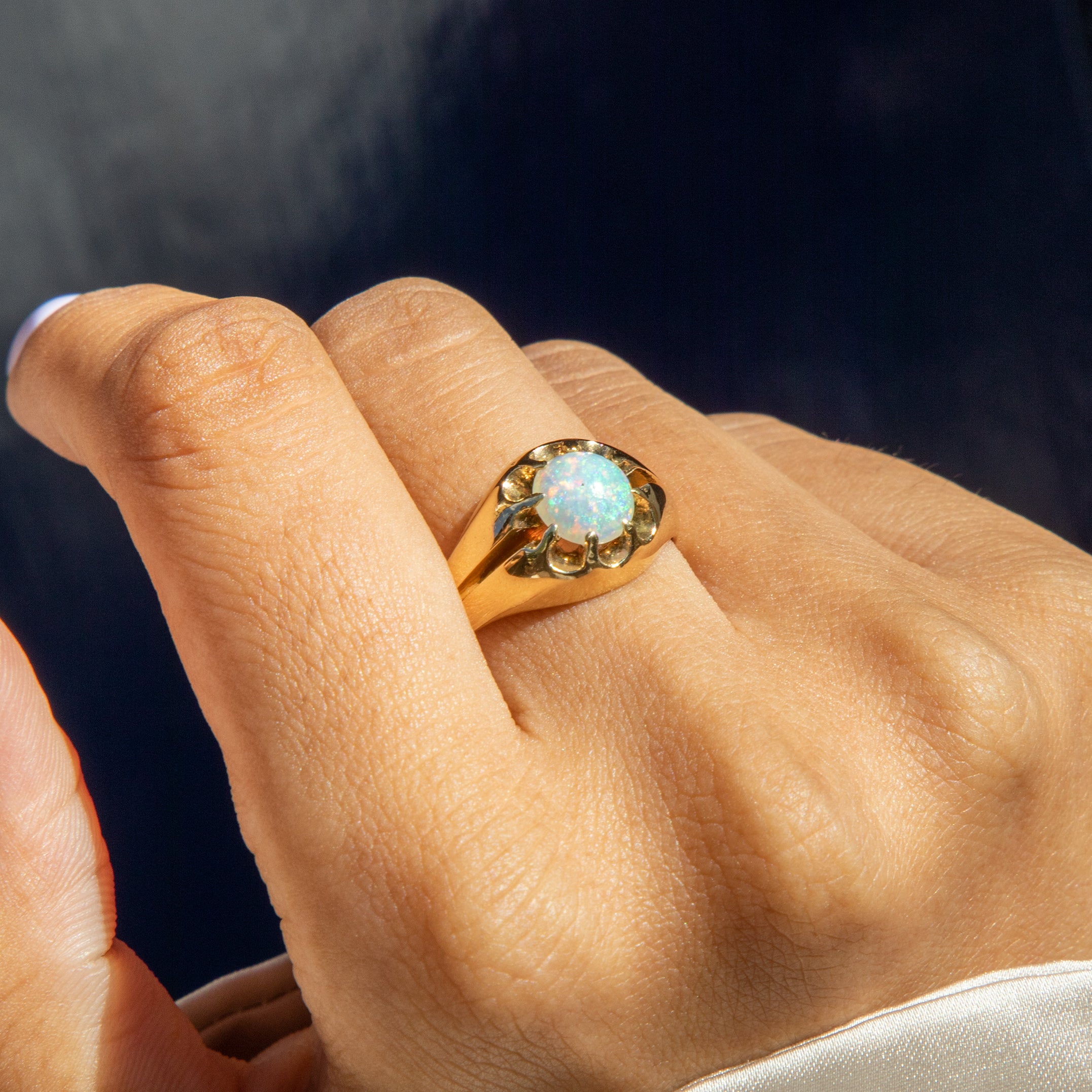 In true Victorian style, the Opal is held within a sweet buttercup setting and is crafted entirely from honey-hued 18ct Gold. The chunky design provides impressive finger coverage and her smooth surface allows her to effortlessly glide onto your hand. This Victorian Opal ring is a show-stopping piece!