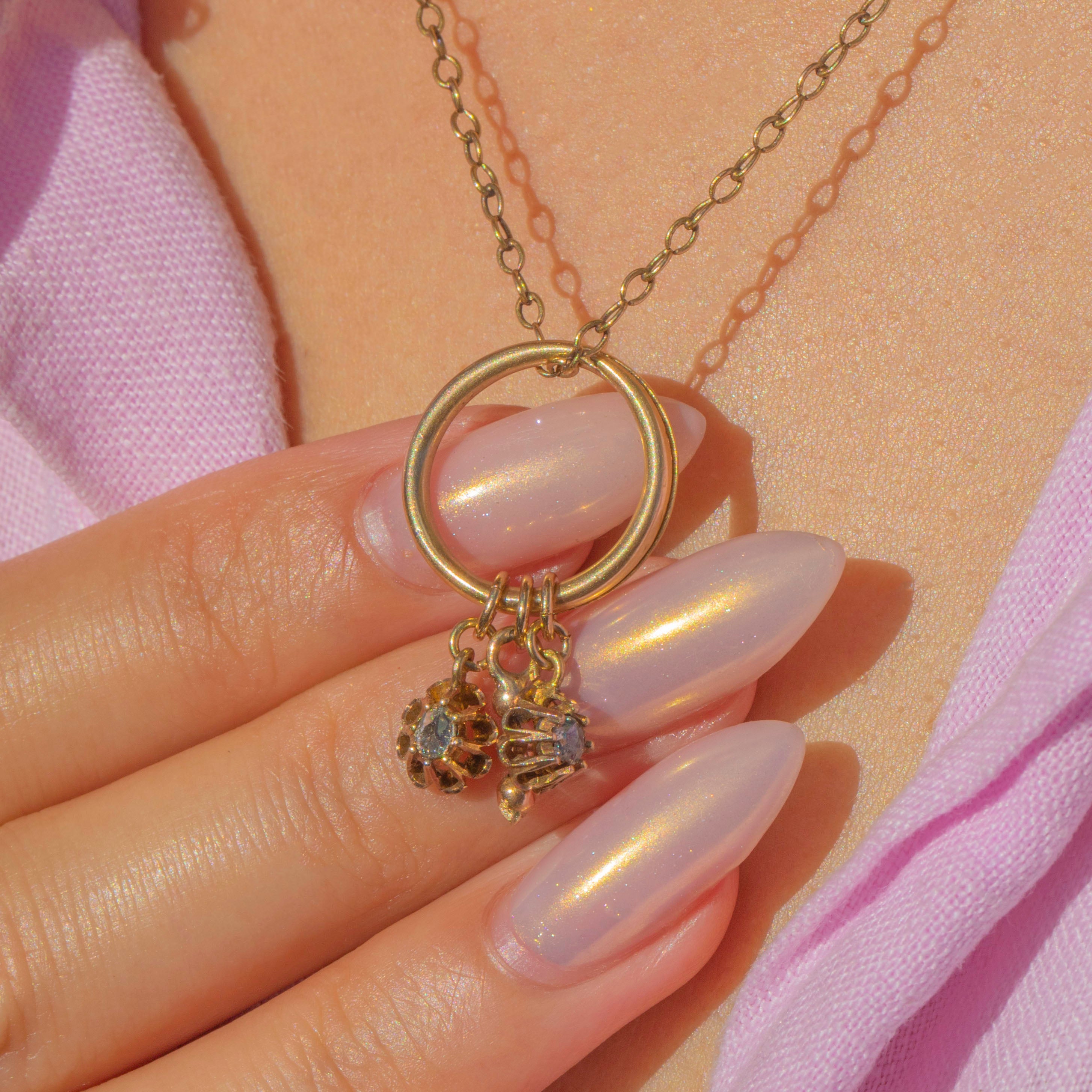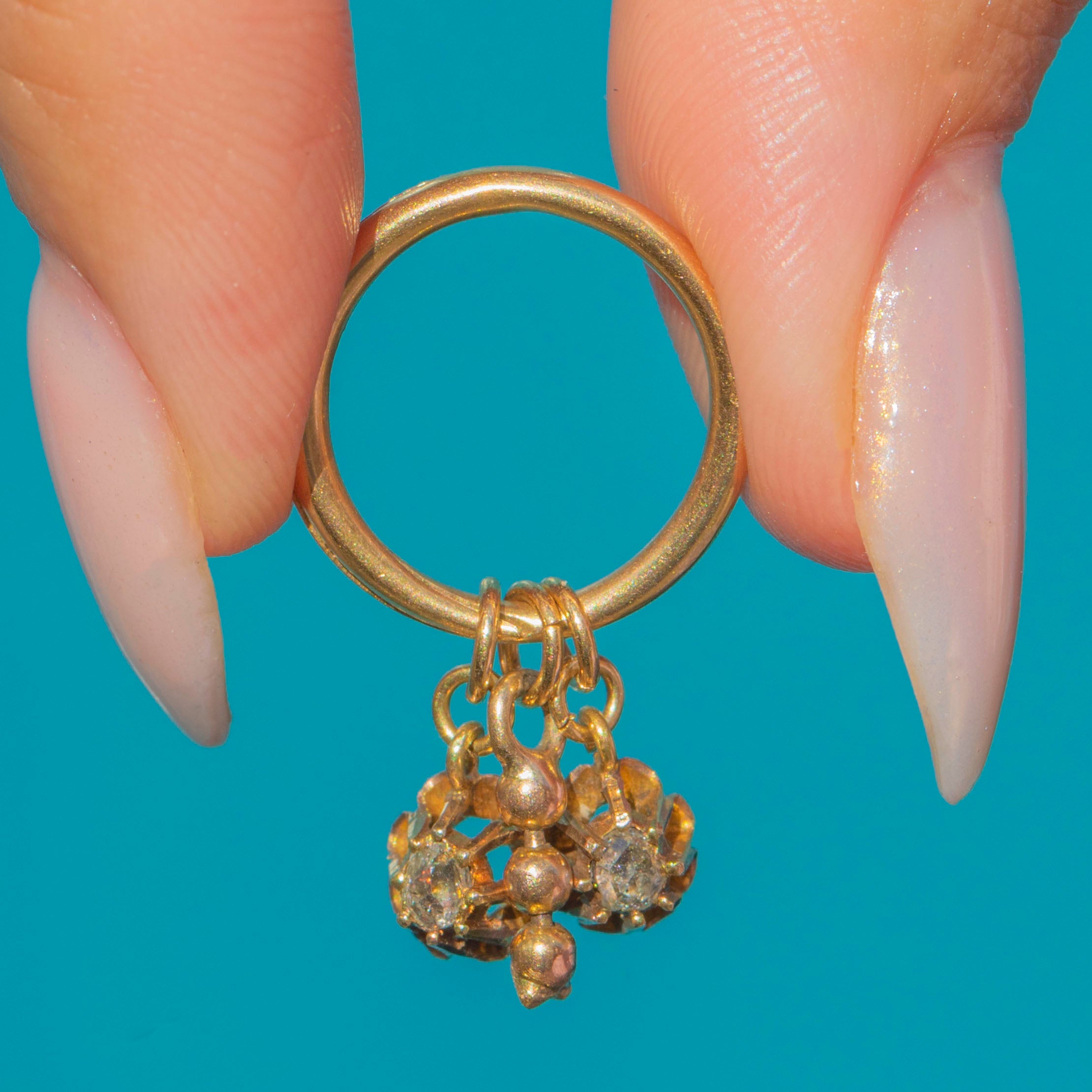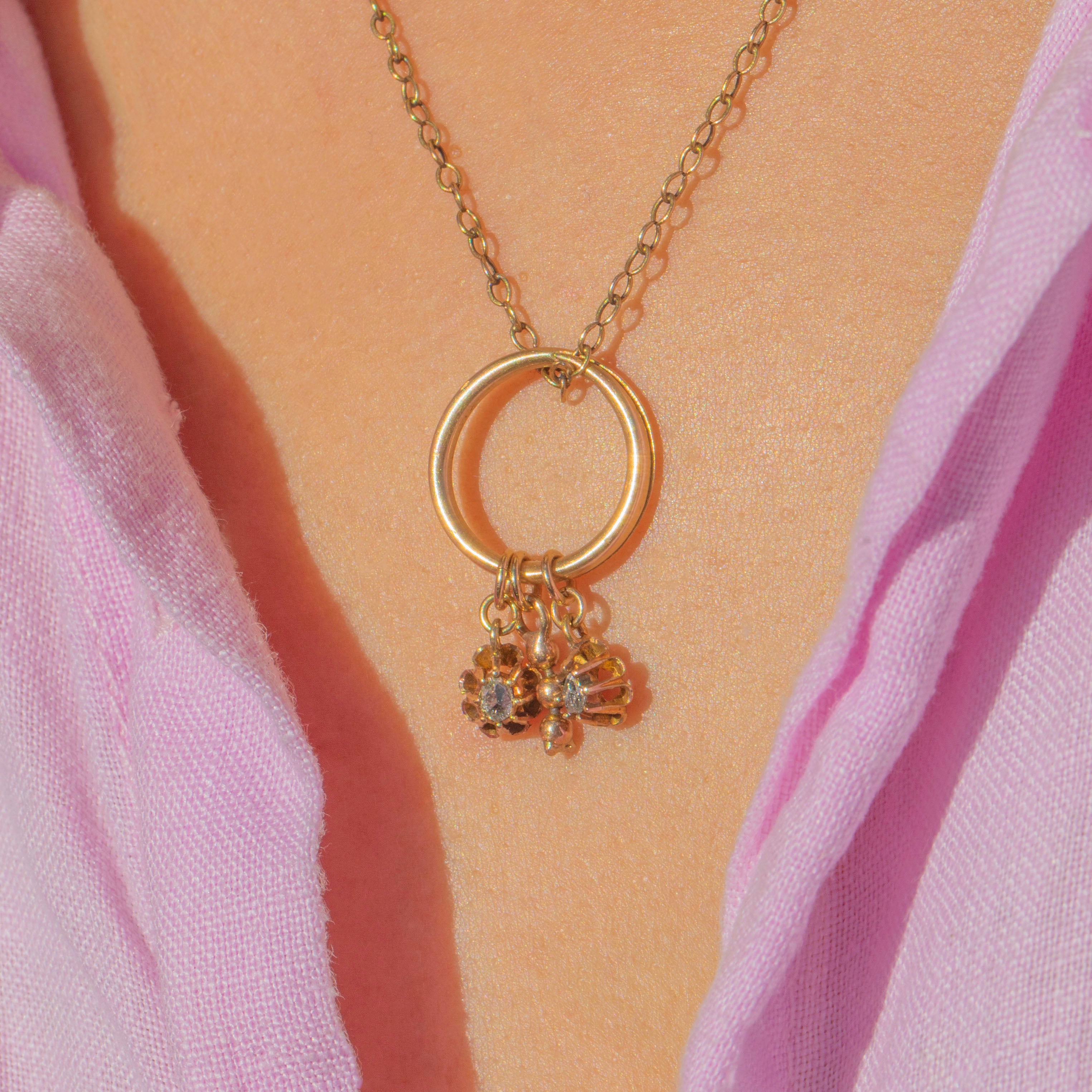 This charming antique trio pendant features an 18ct Gold split ring suspending two delicate rose cut Diamond charms alongside a beaded Gold charm. The split ring allows for the charms to move freely, creating a playful and tactile design with a lovely antique character. With two glittering rose cut Diamonds set in traditional crown collets, this piece is both elegant and versatile, perfect to wear on a chain as a pendant or to add to a charm bracelet.