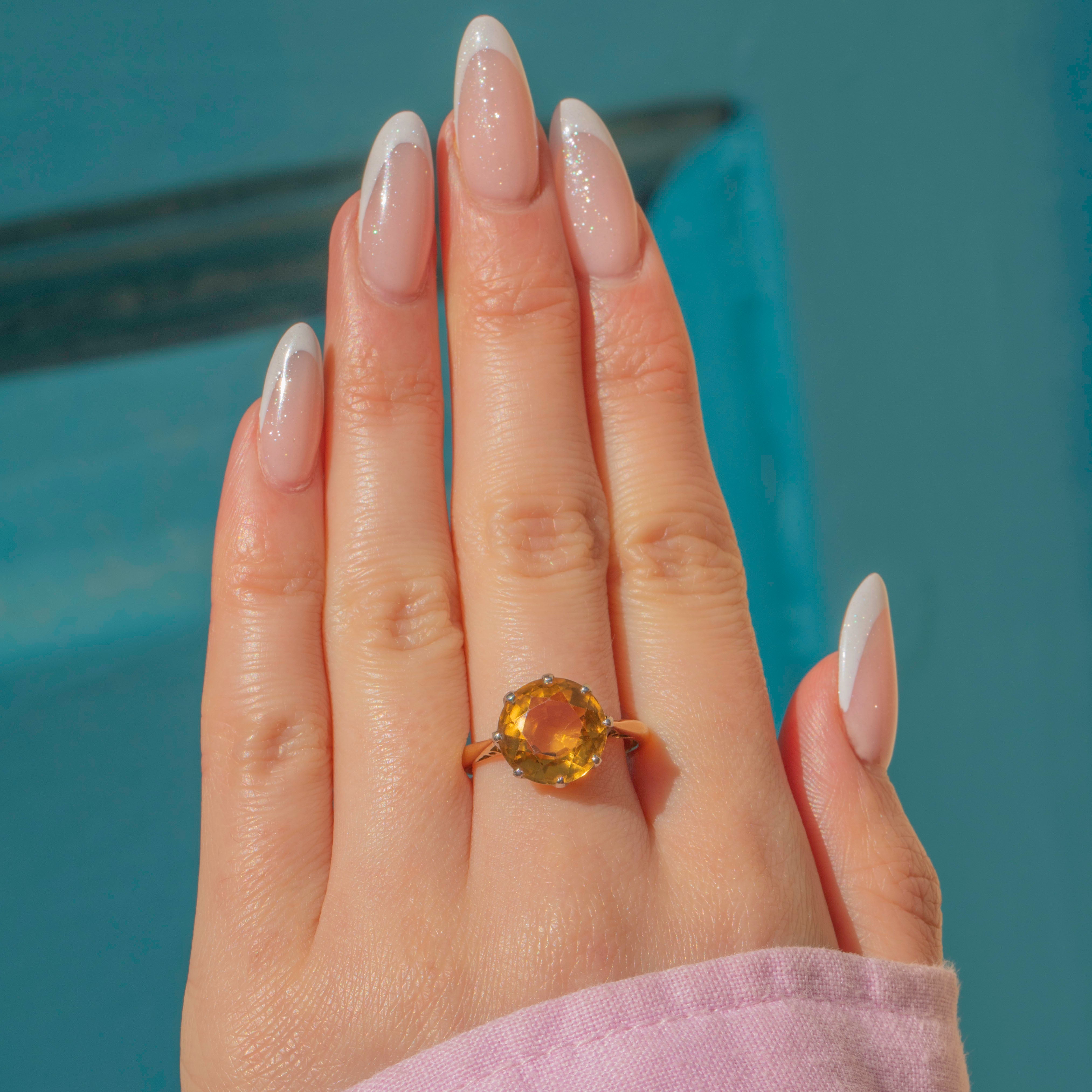An effortless combination, this Citrine is set atop a buttery 18ct Gold band providing a luxurious throne for the spectacular gemstone. This Art Deco Citrine ring is a show-stopping piece!