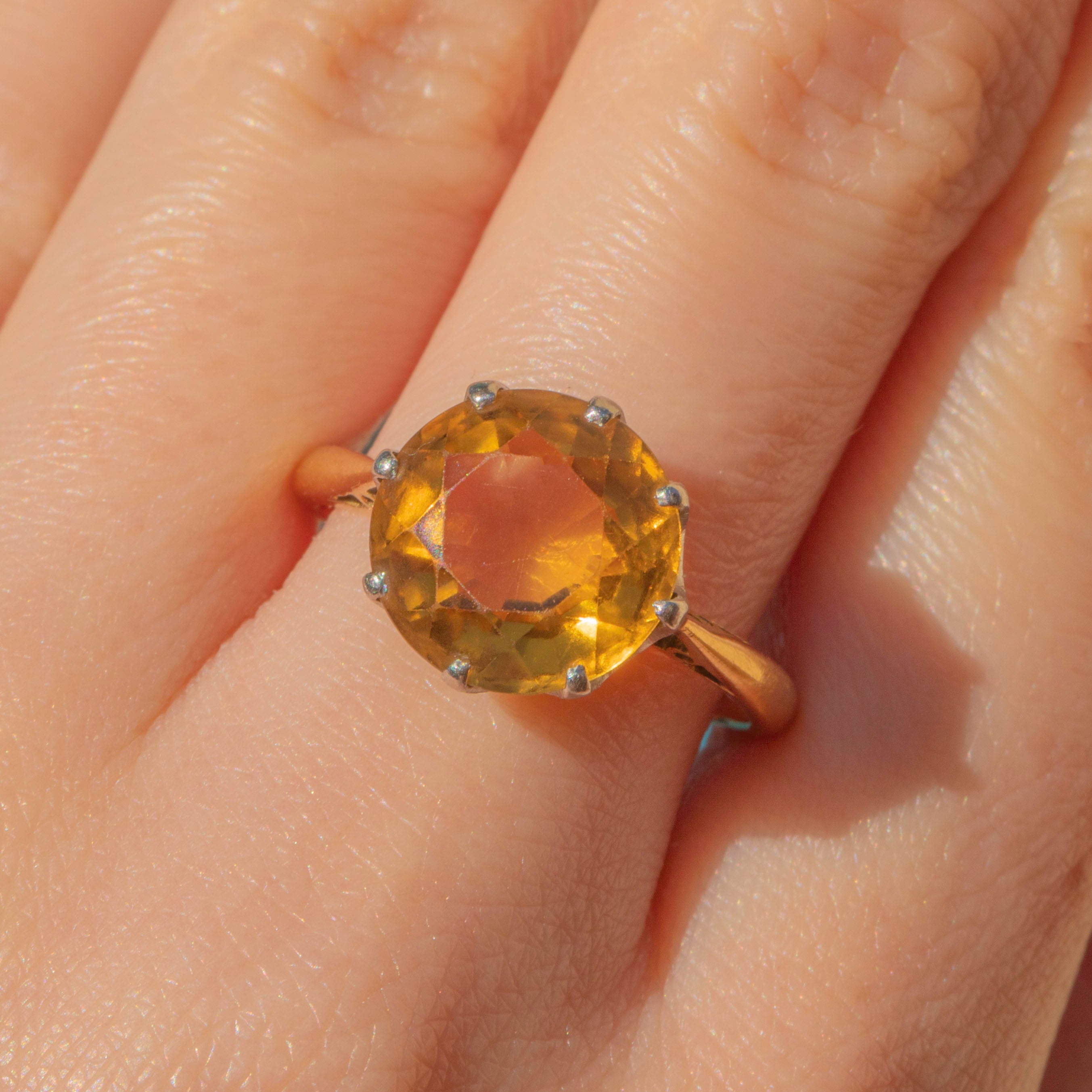 VERY GOOD: This antique 18ct Gold Citrine solitaire ring is in very good condition. Her Gold is smooth and sleek, holding her Citrine securely, and the Citrine has a crisp set of facets and is completely free from any chips or scuffs. There is a resize mark on her back but this is minor and doesn't impact the overall look of the ring!