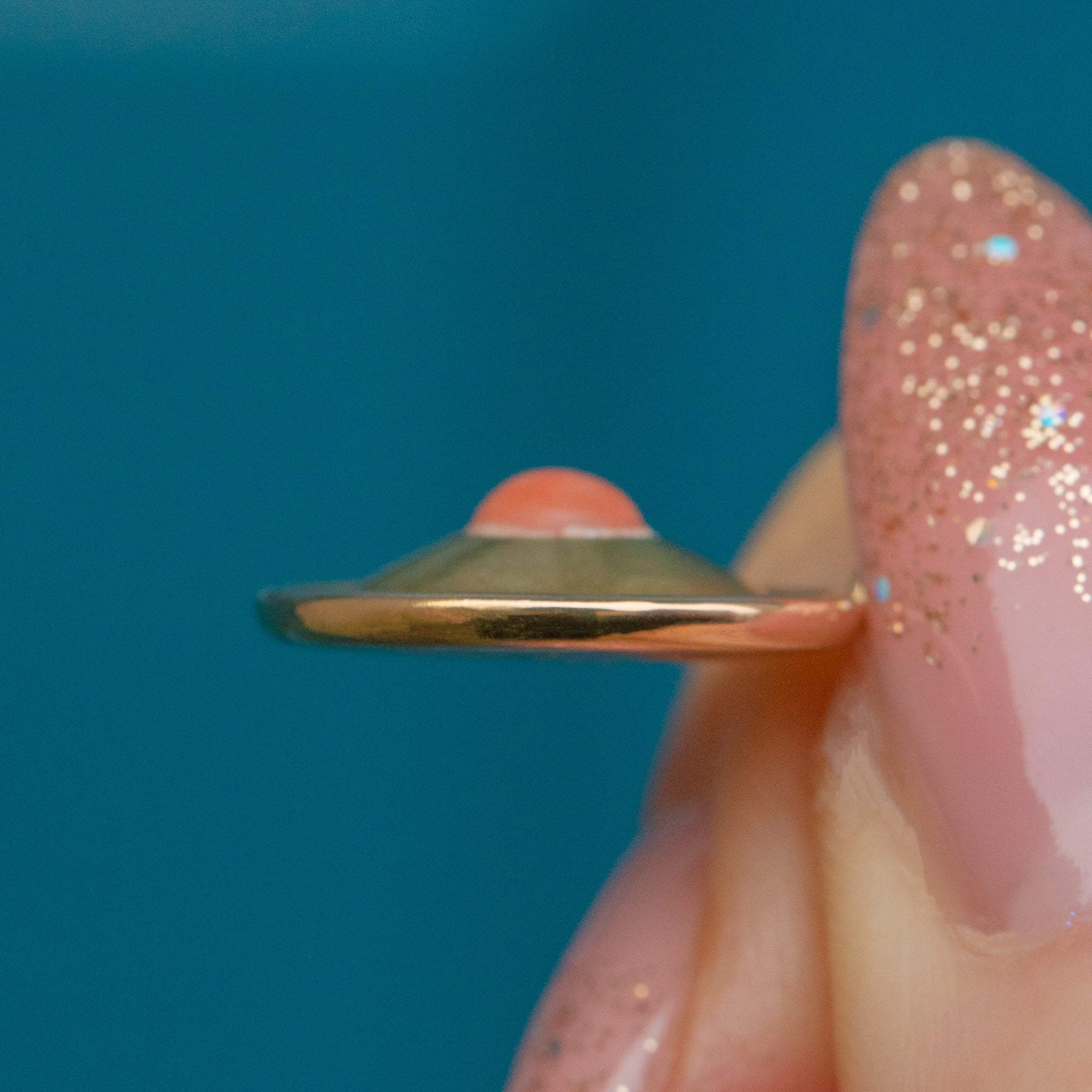 Adorned with a lovely blush coral at her centre, she emits warm, golden-hour tones—an ideal addition to your jewellery collection going into midwinter.