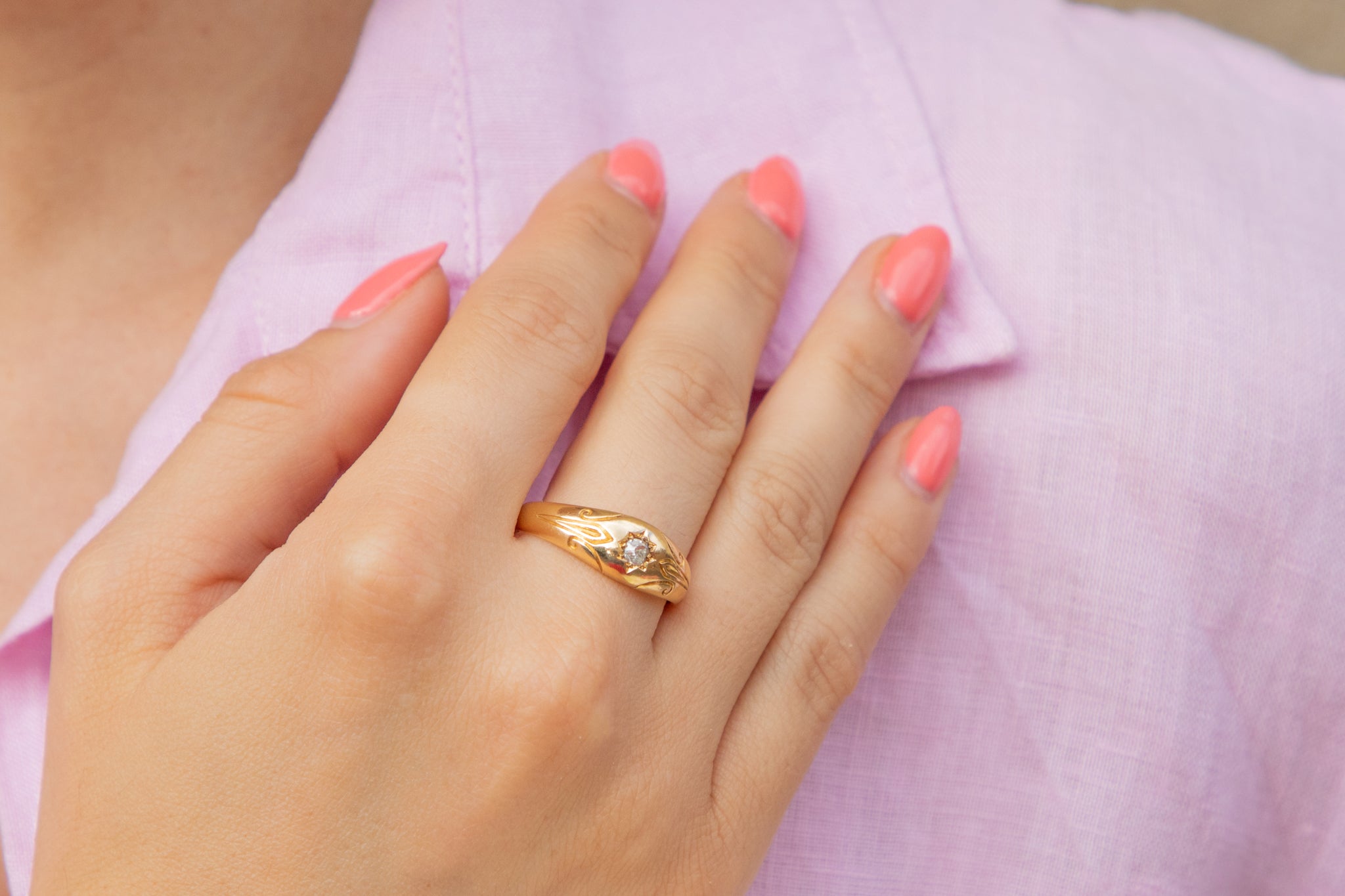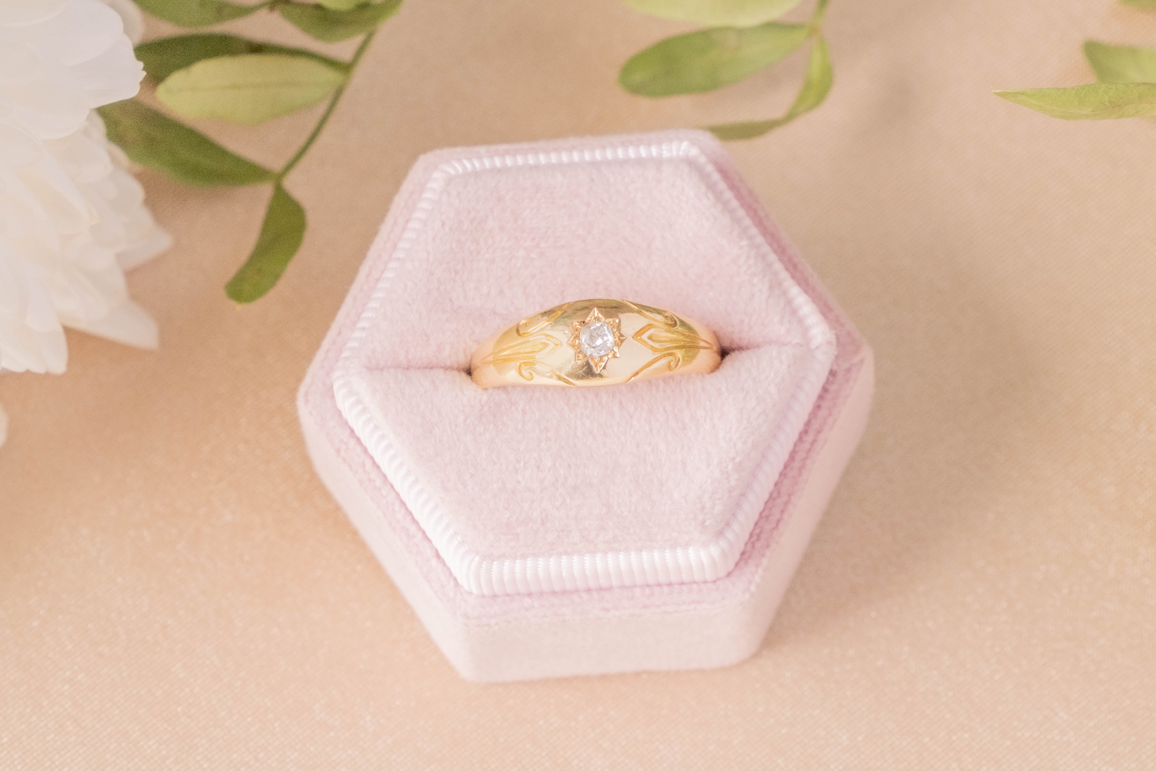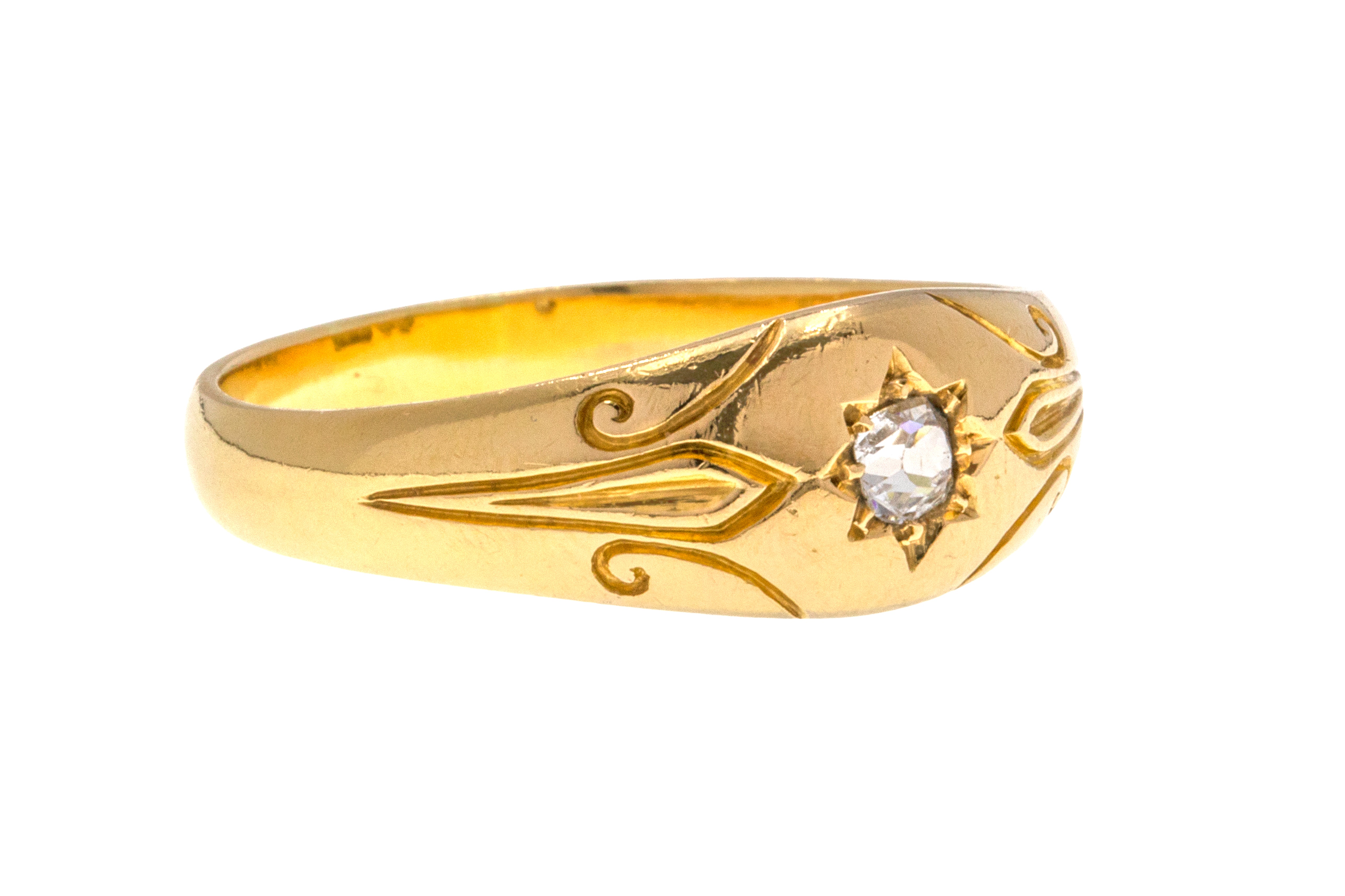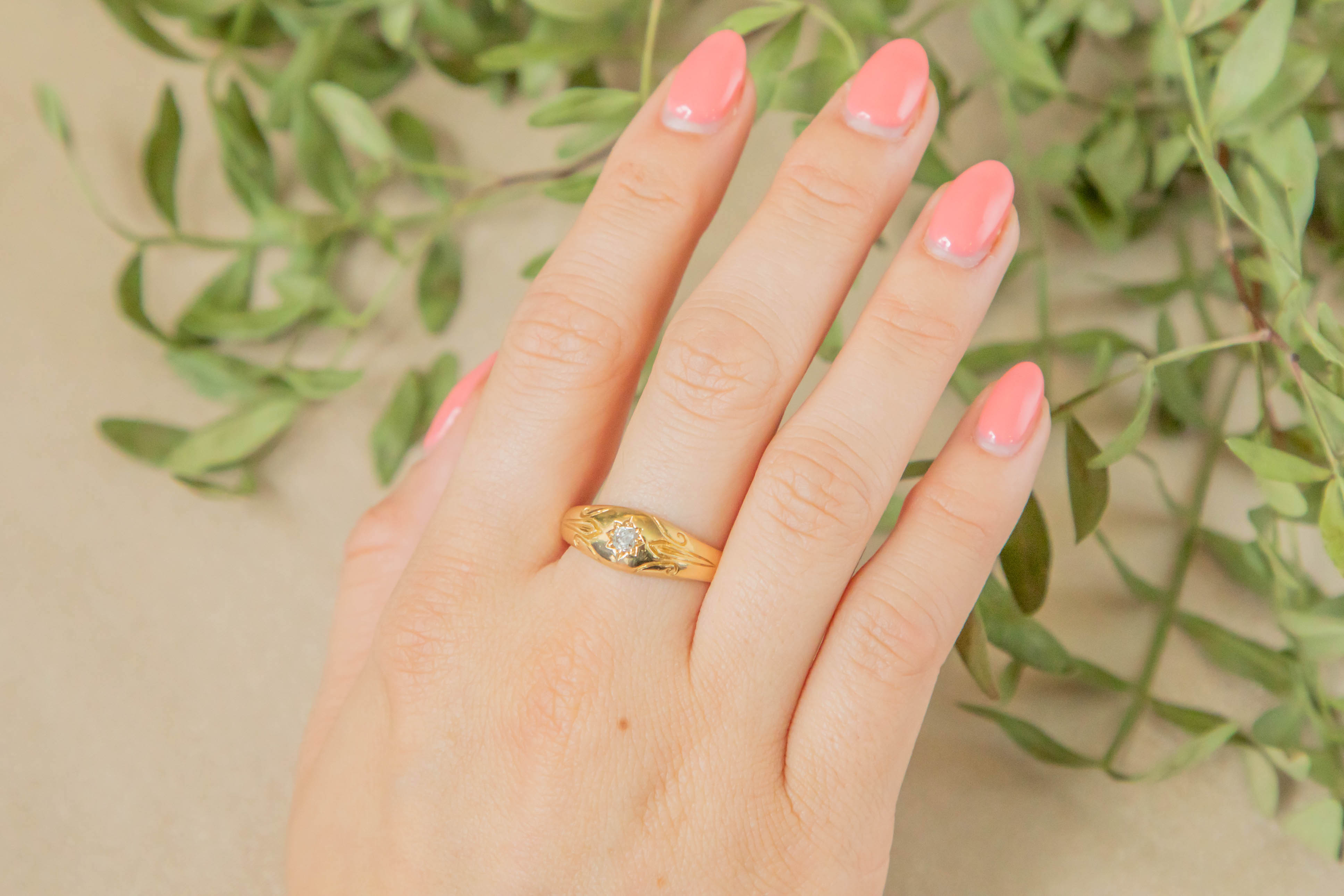 A timeless antique 18ct Gold Diamond gypsy ring, emanating luxury from every angle. With a twinkling 0.10ct Diamond nestled in her starry centre, she boasts ornate scrolled engraved shoulders and a gorgeous glossy finish!