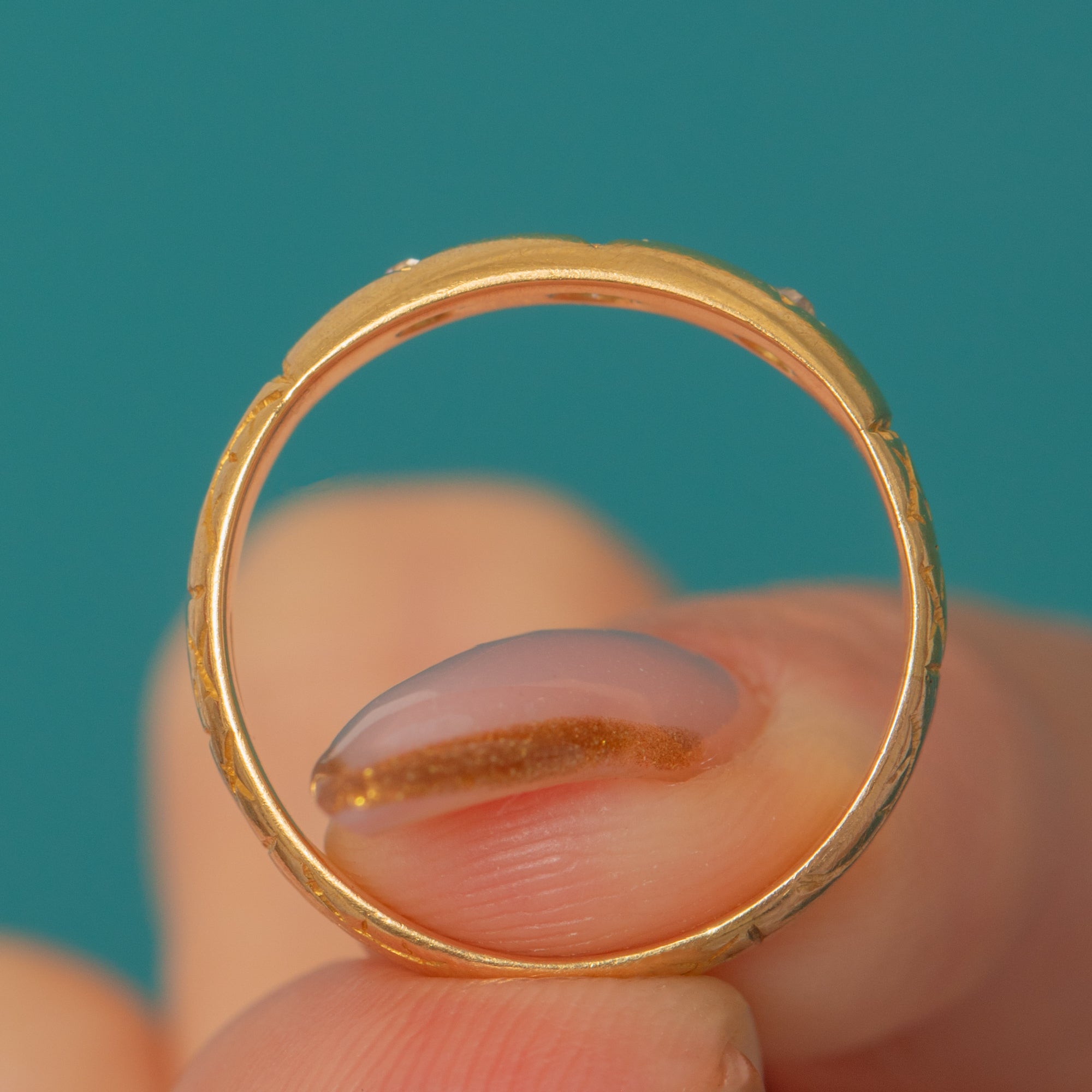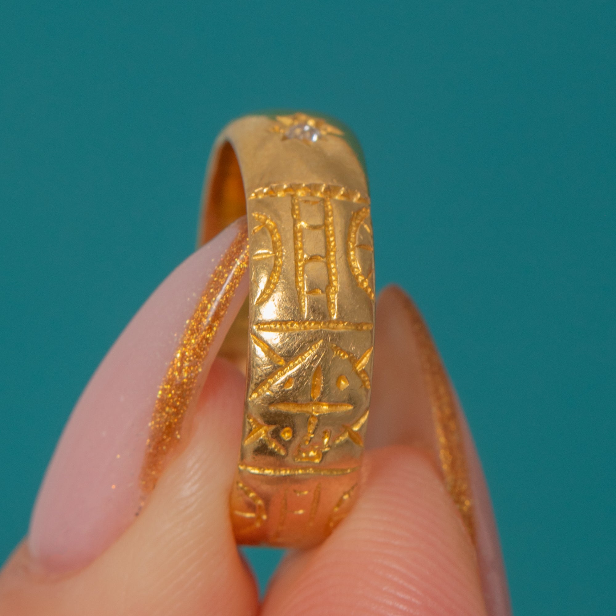 The shoulders are deeply engraved with ornate patterns that catch the light and give wonderful texture and depth to the design. A perfect piece for stacking or wearing alone, it embodies the charm and craftsmanship of the late Victorian era.