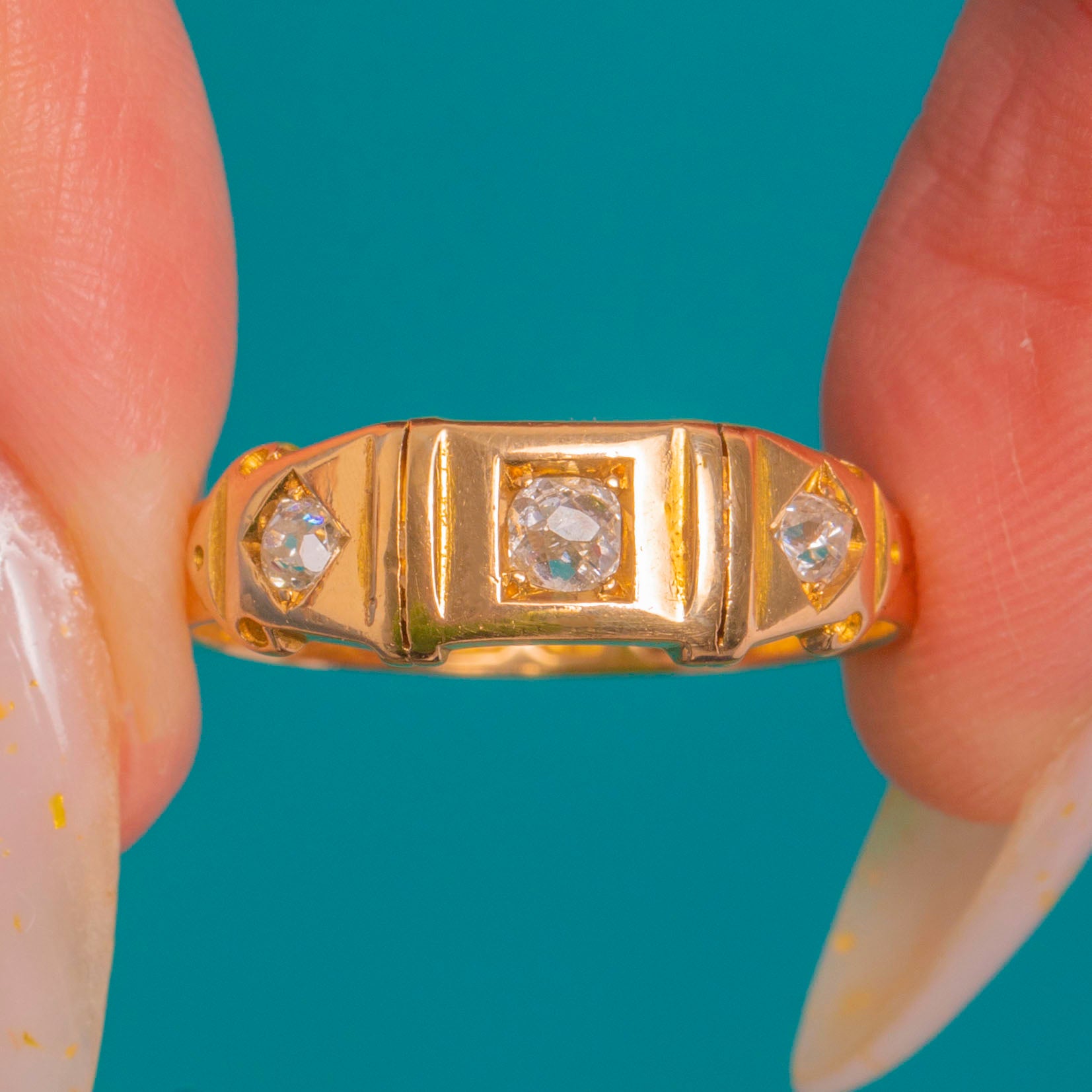 A refined Victorian 18ct Gold buckle ring set with a crisp trio of gypsy-set Diamonds. The low-profile band and sleek, geometric head give this antique classic a streamlined, architectural presence, while the flush settings lend a smooth, comfortable fit and understated sparkle.