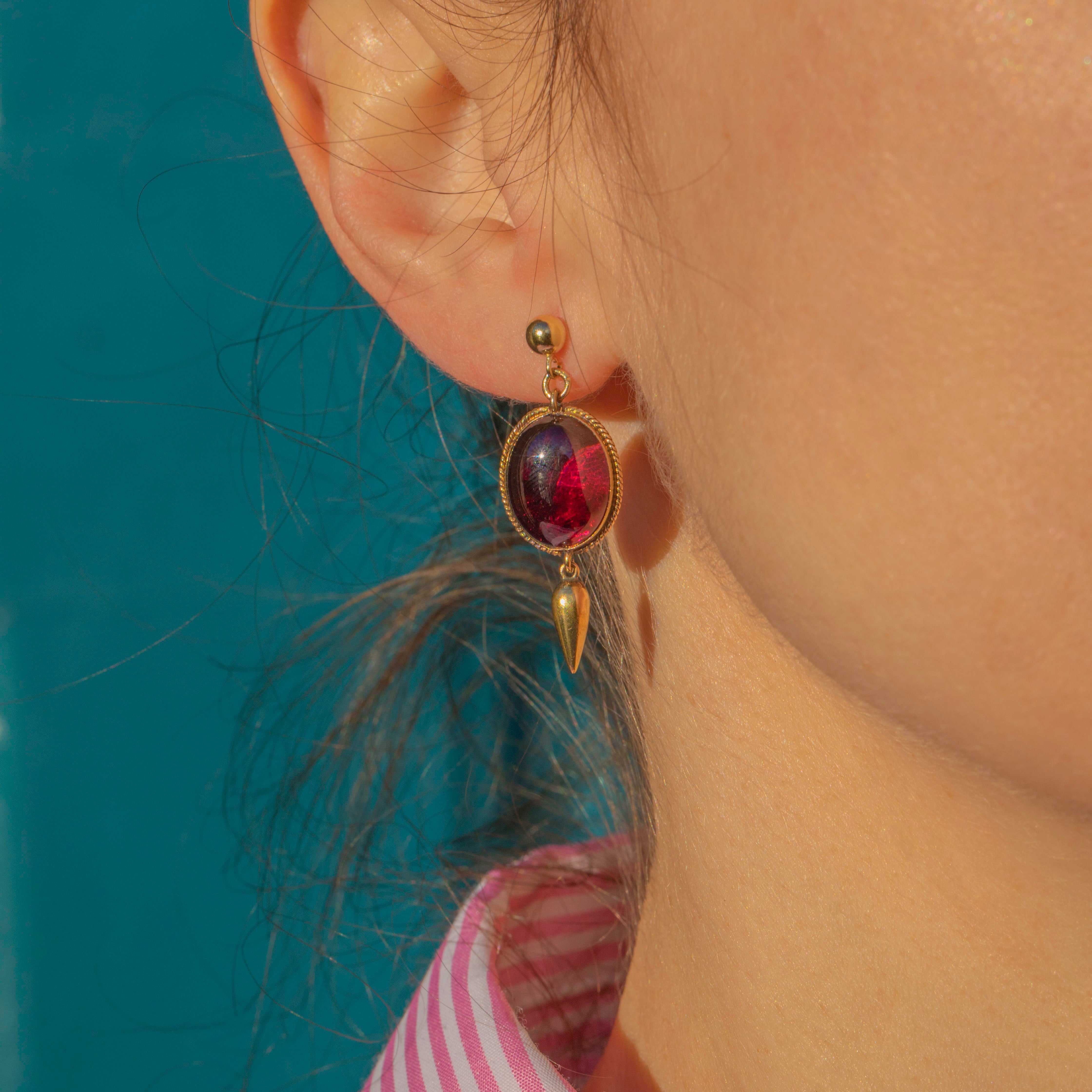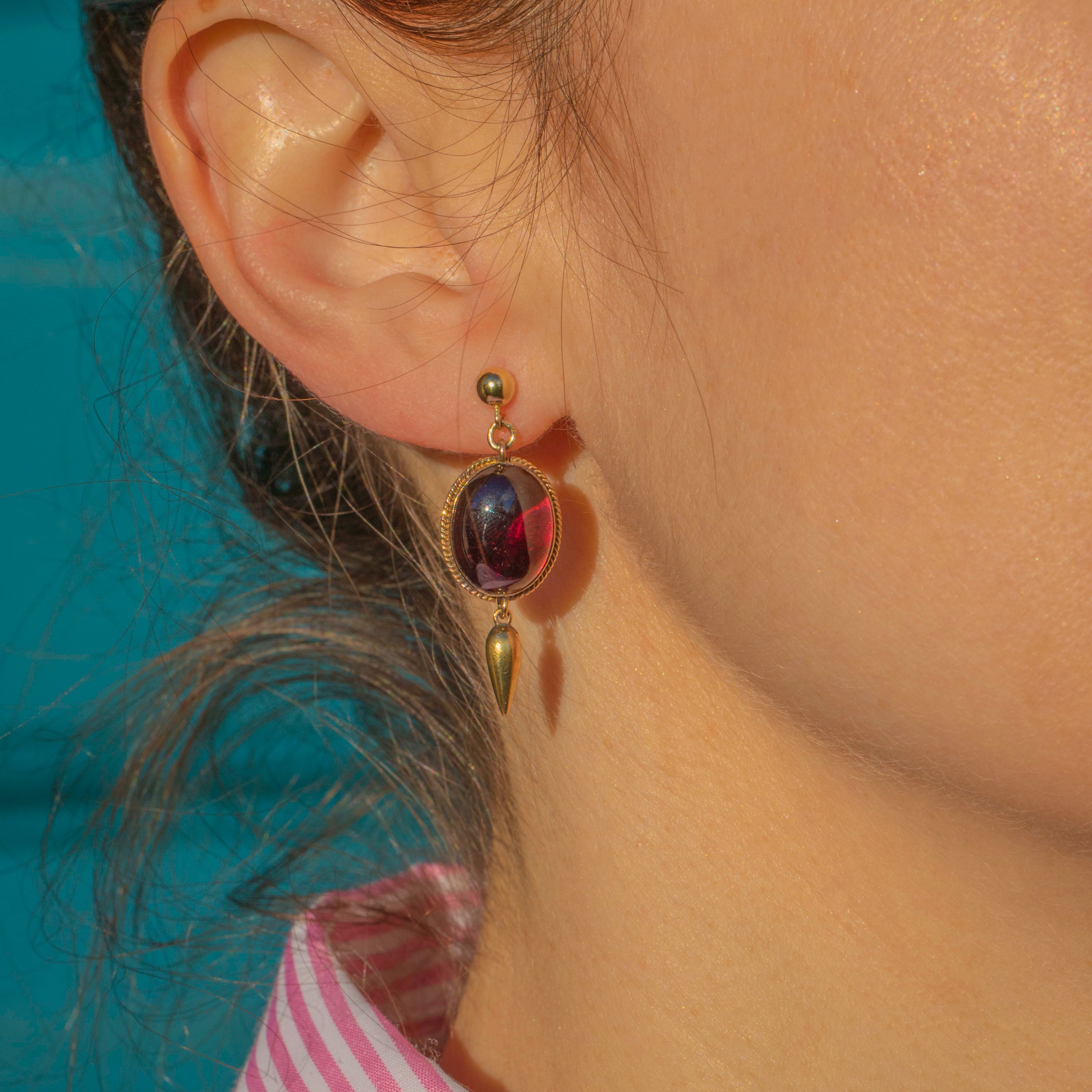Completing the design, each earring features a refined 18ct gold torpedo drop, offering a graceful movement that shimmies as they suspend from your lobes. The combination of saturated 18ct Gold with crimson Garnets creates a regal appeal that will delight for generations to come!