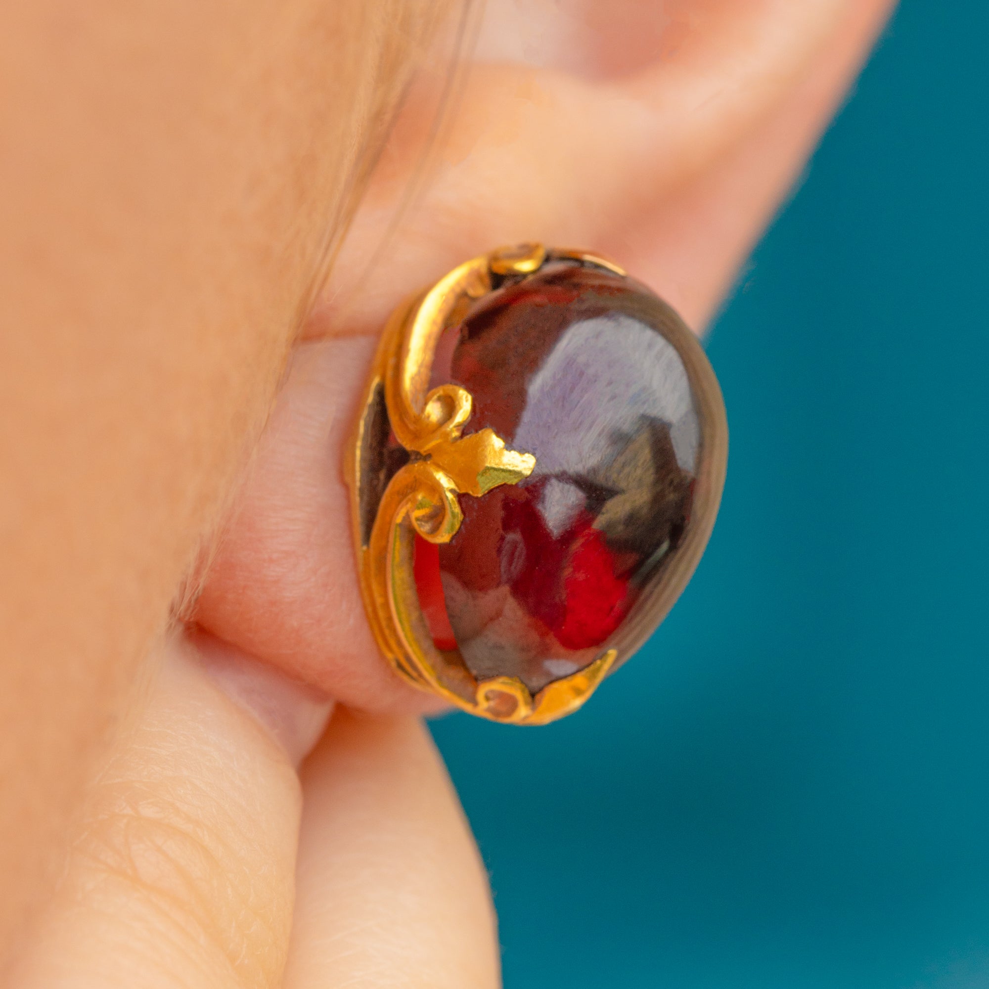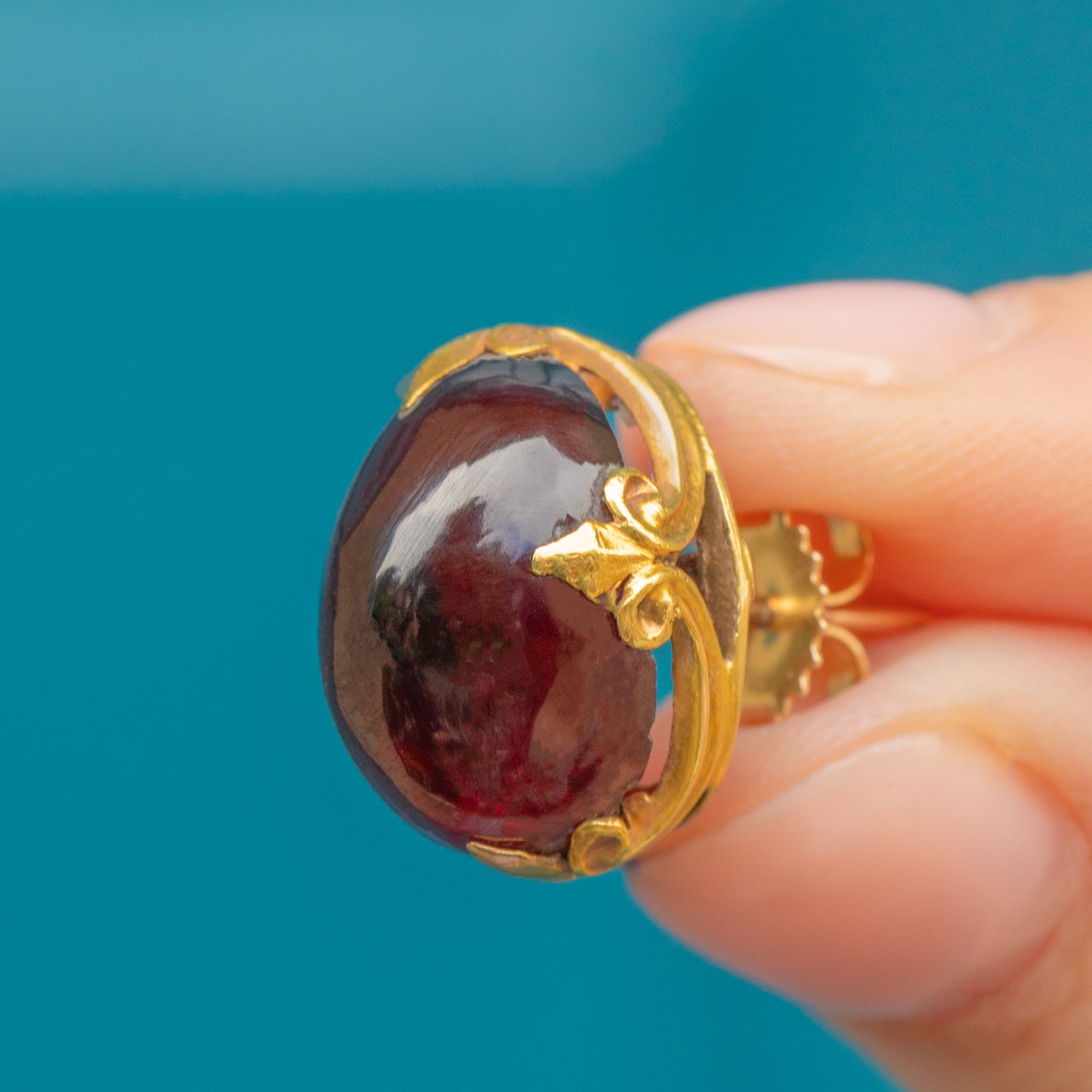 MATERIALS: Tests as 18ct Gold, Cabochon cut Garnets.