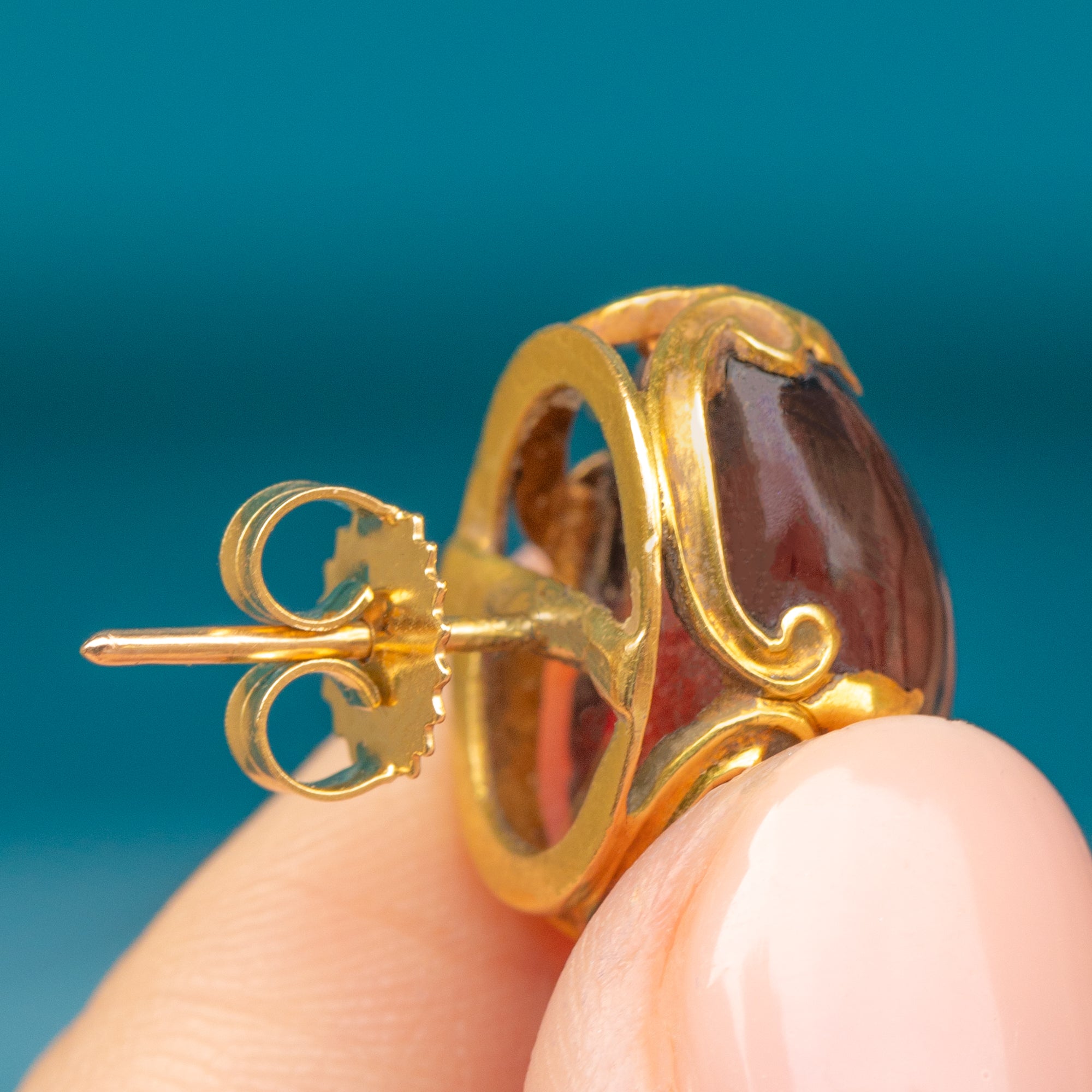 These phenomenal antique 18ct Gold Garnet cabochon Fleur-De-Lis earrings are a rare treasure indeed! Crafted in France during the Victorian era, each stud earring boasts a 9.83ct Garnet carbuncle displayed within decorative 18ct Gold floral claw settings.