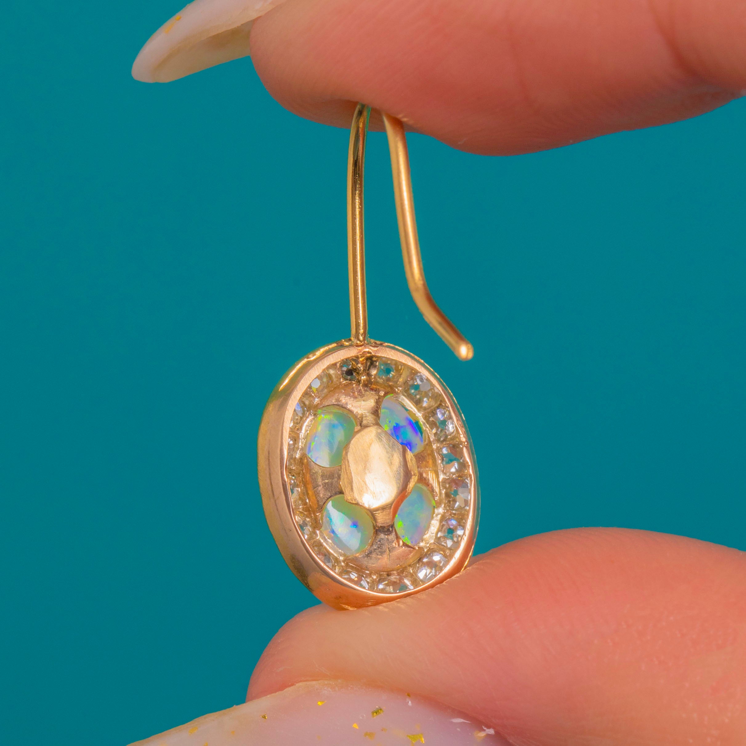 The oval clusters are beautifully proportioned and suspended from simple shepherd-hook fittings, allowing the gemstones to catch the light with every movement. With approximately 1.00ct of Opal and 0.60ct of Old Mine Cut Diamonds in total, these refined drops offer that perfect balance of romance, sparkle and timeless sophistication.