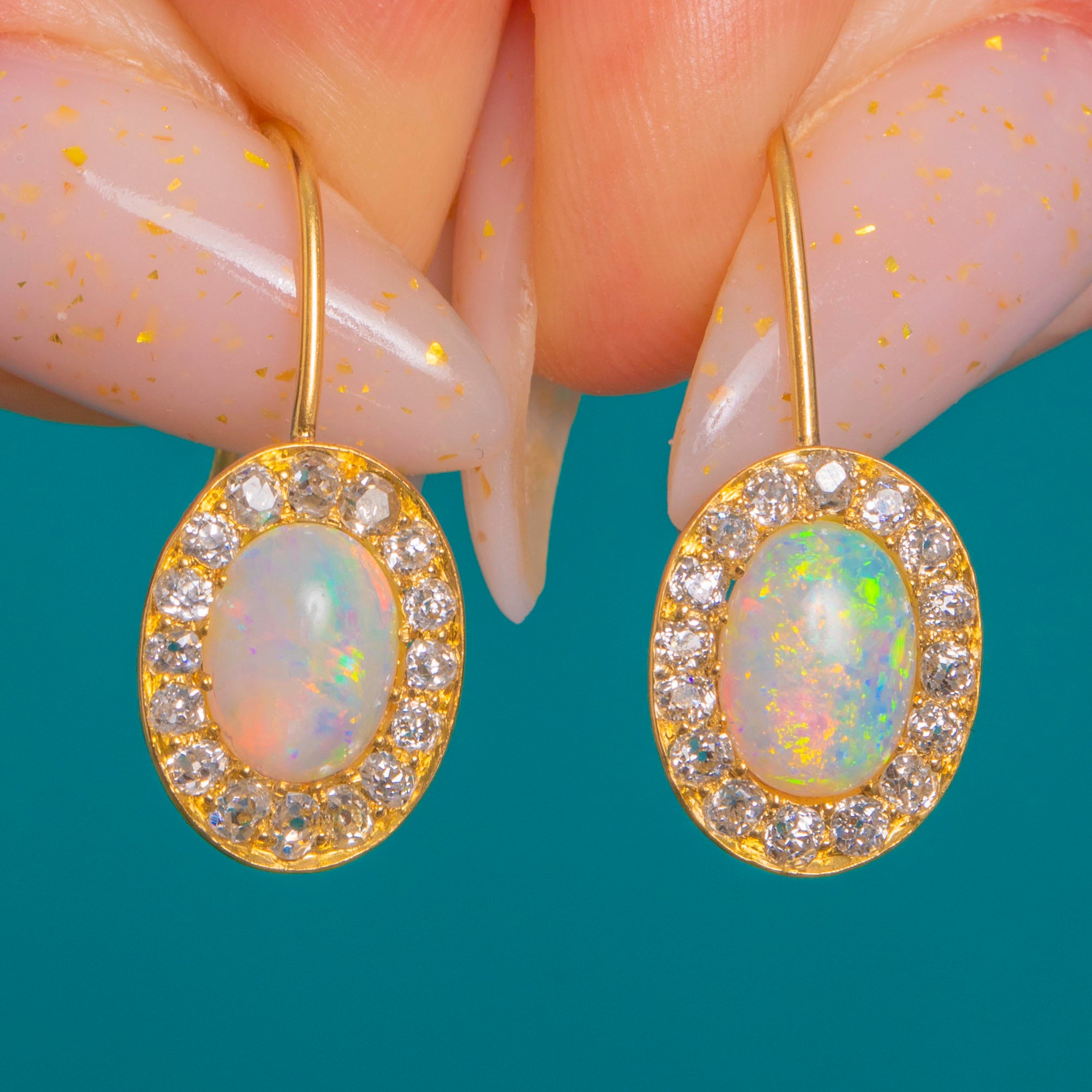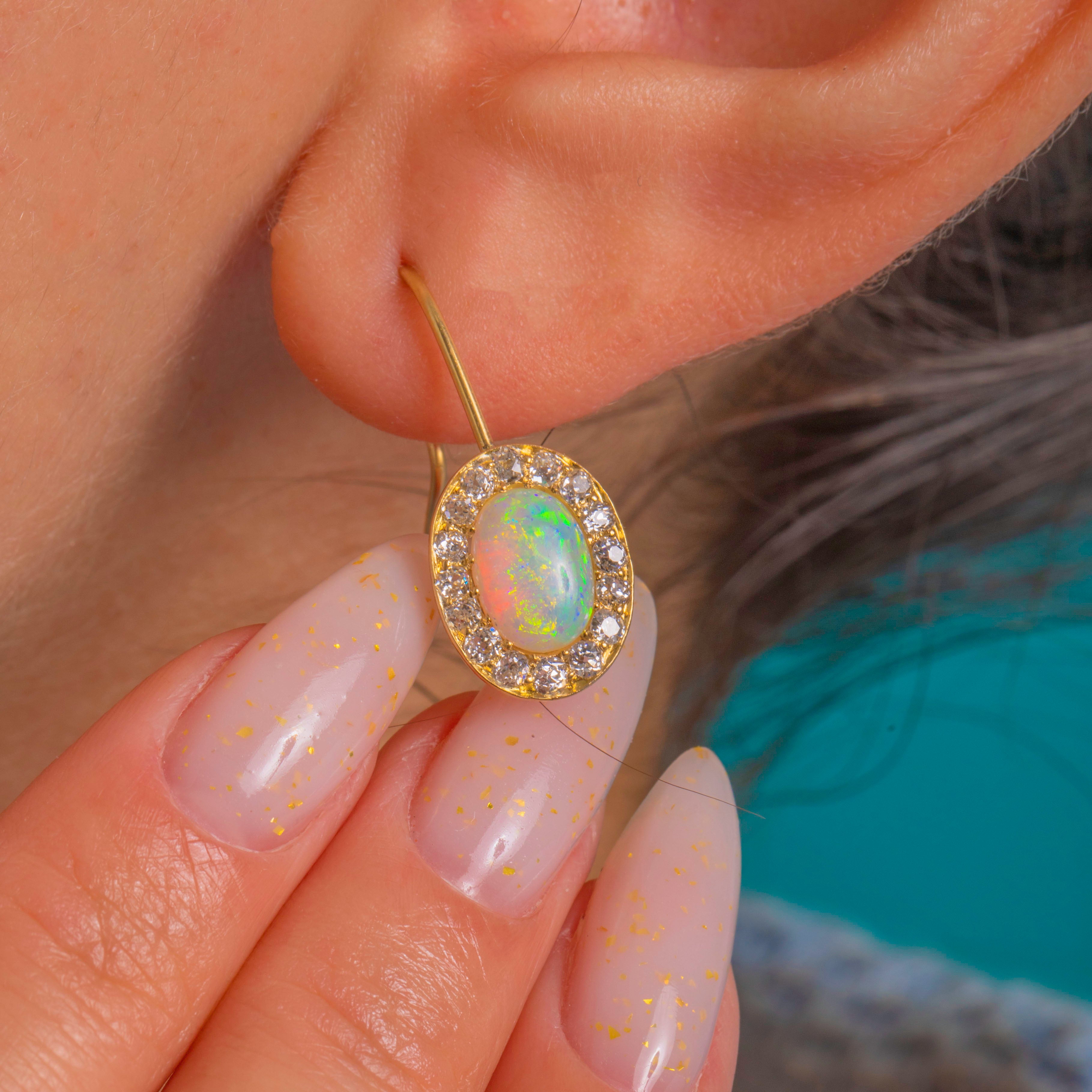 Elegant Victorian charm meets kaleidoscopic colour in these 18ct Gold Opal and Diamond cluster drops. Each earring centres a natural solid Opal cabochon alive with vivid flashes of green, blue, orange and yellow, framed by a scintillating halo of antique Old Mine Cut Diamonds for a classic, luminous finish.